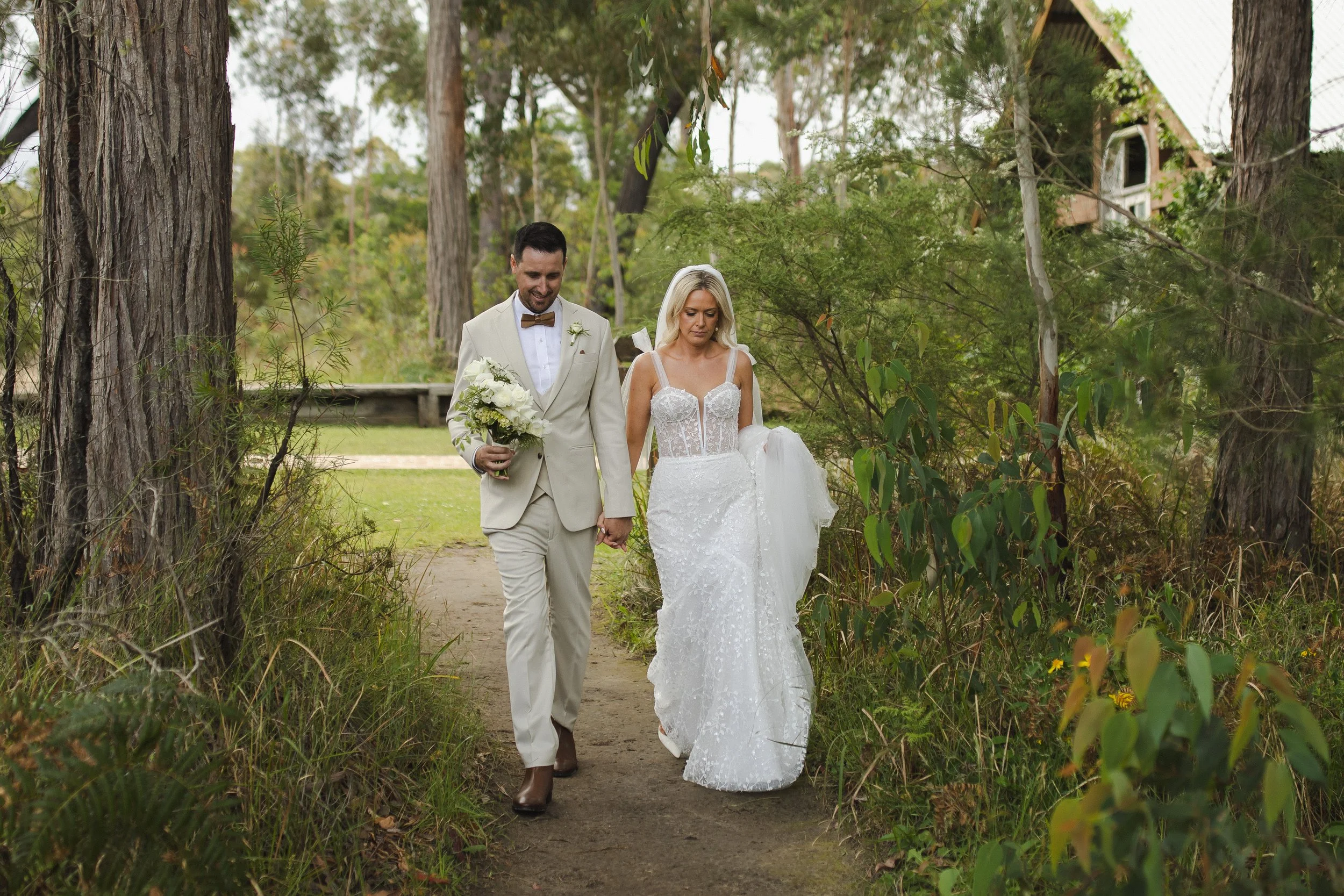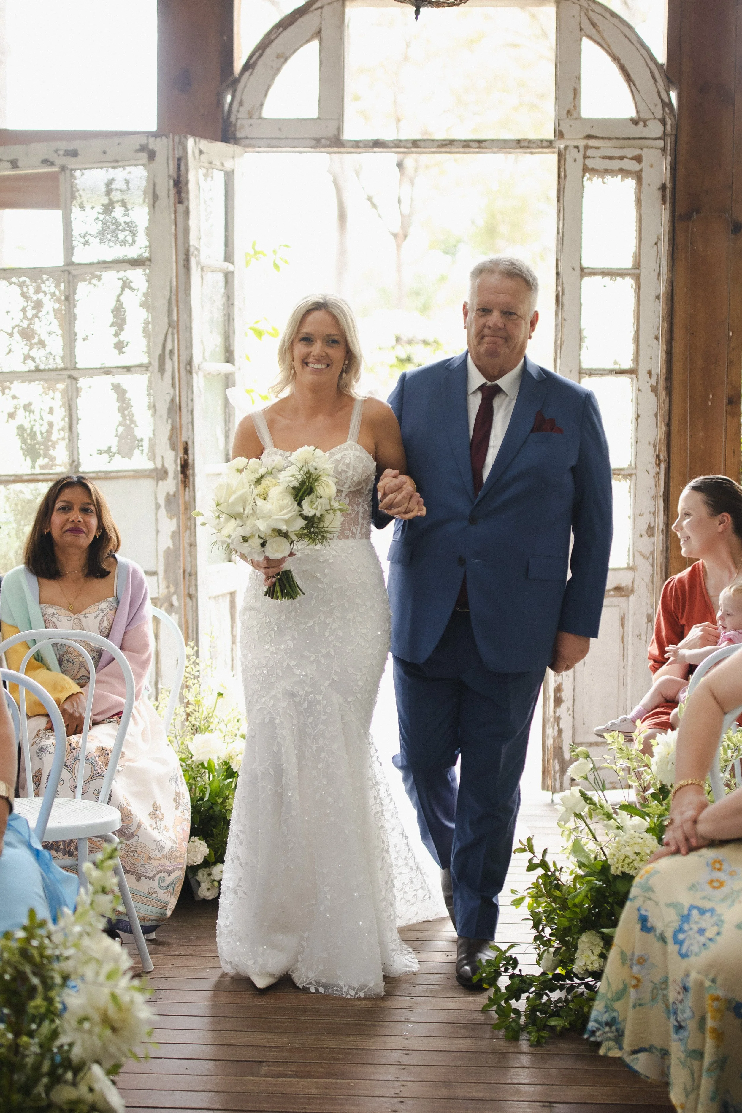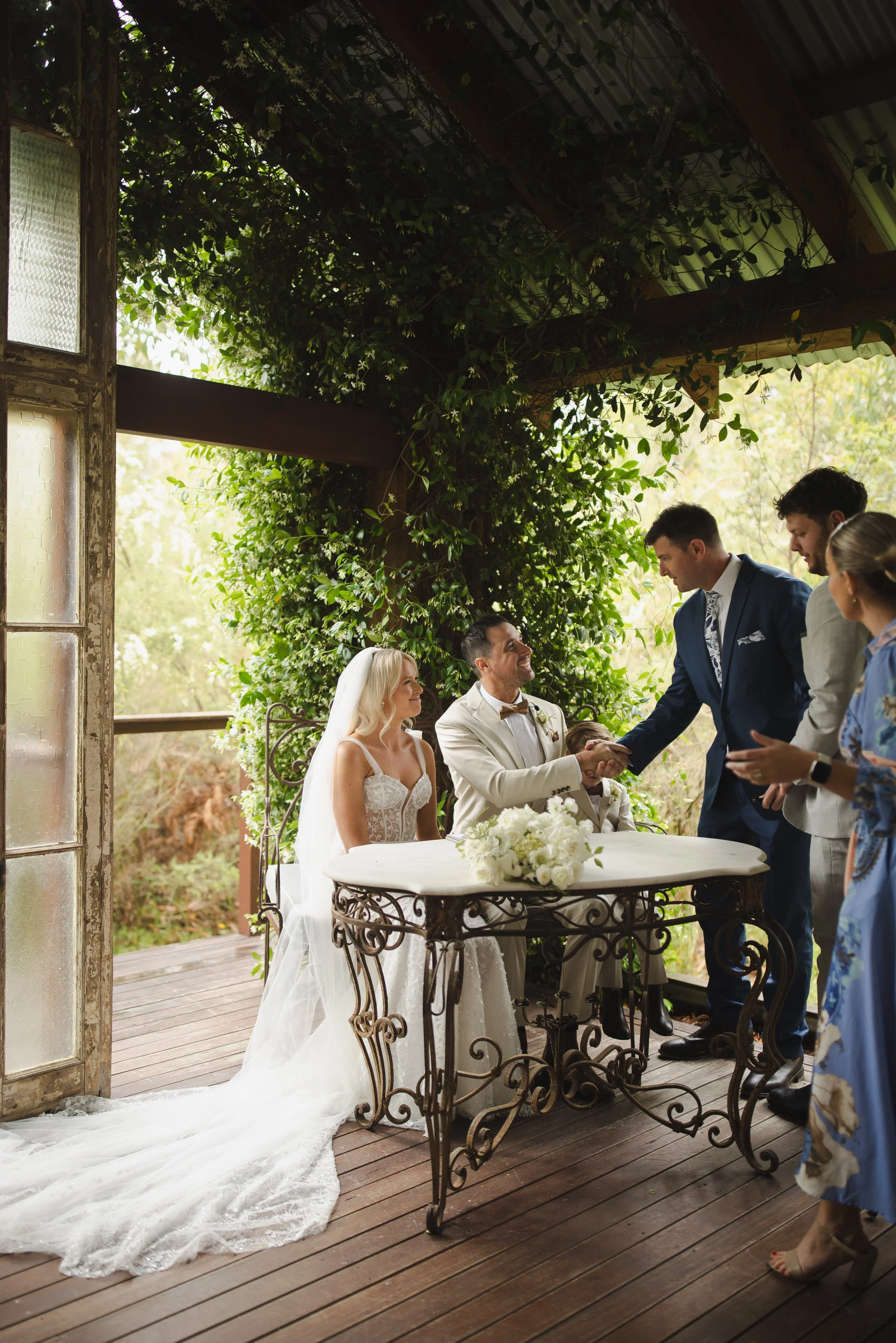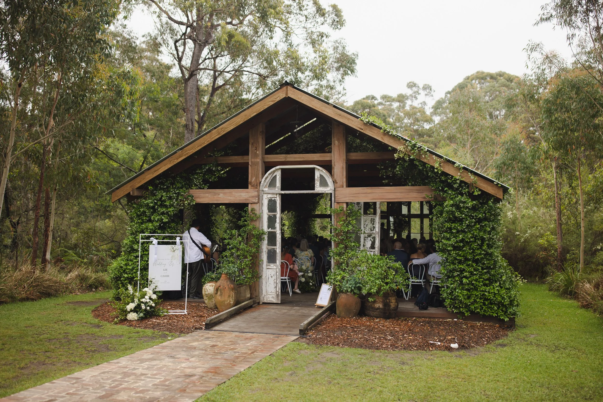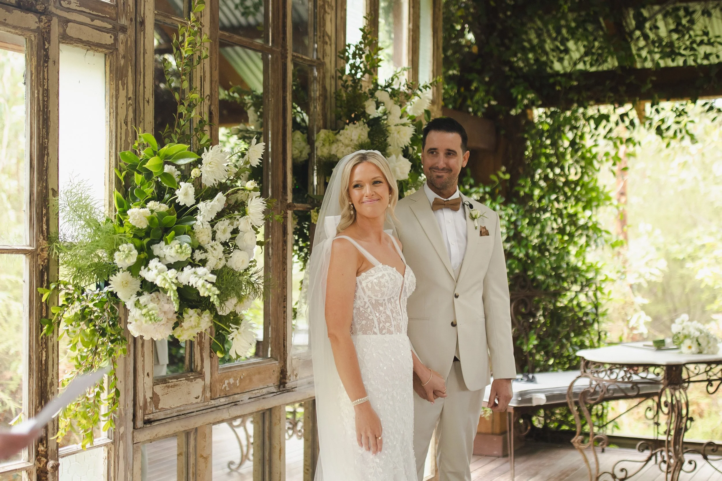 Their ceremony took place in the breathtaking Bush Chapel, a rustic, storybook space draped in ivy, glittering chandeliers hanging from above, and floor-to-ceiling mirrors that reflected the magic back at every angle. Despite the rain, or perhaps because of it, the chapel felt even more romantic. The showers meant that photos were taken inside the chapel, creating beautifully intimate portraits surrounded by lush bushland just outside.