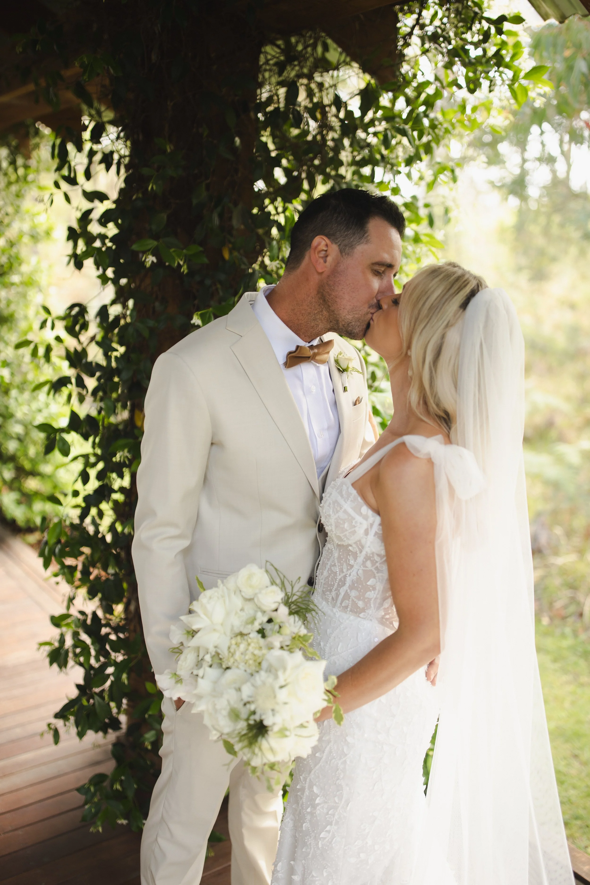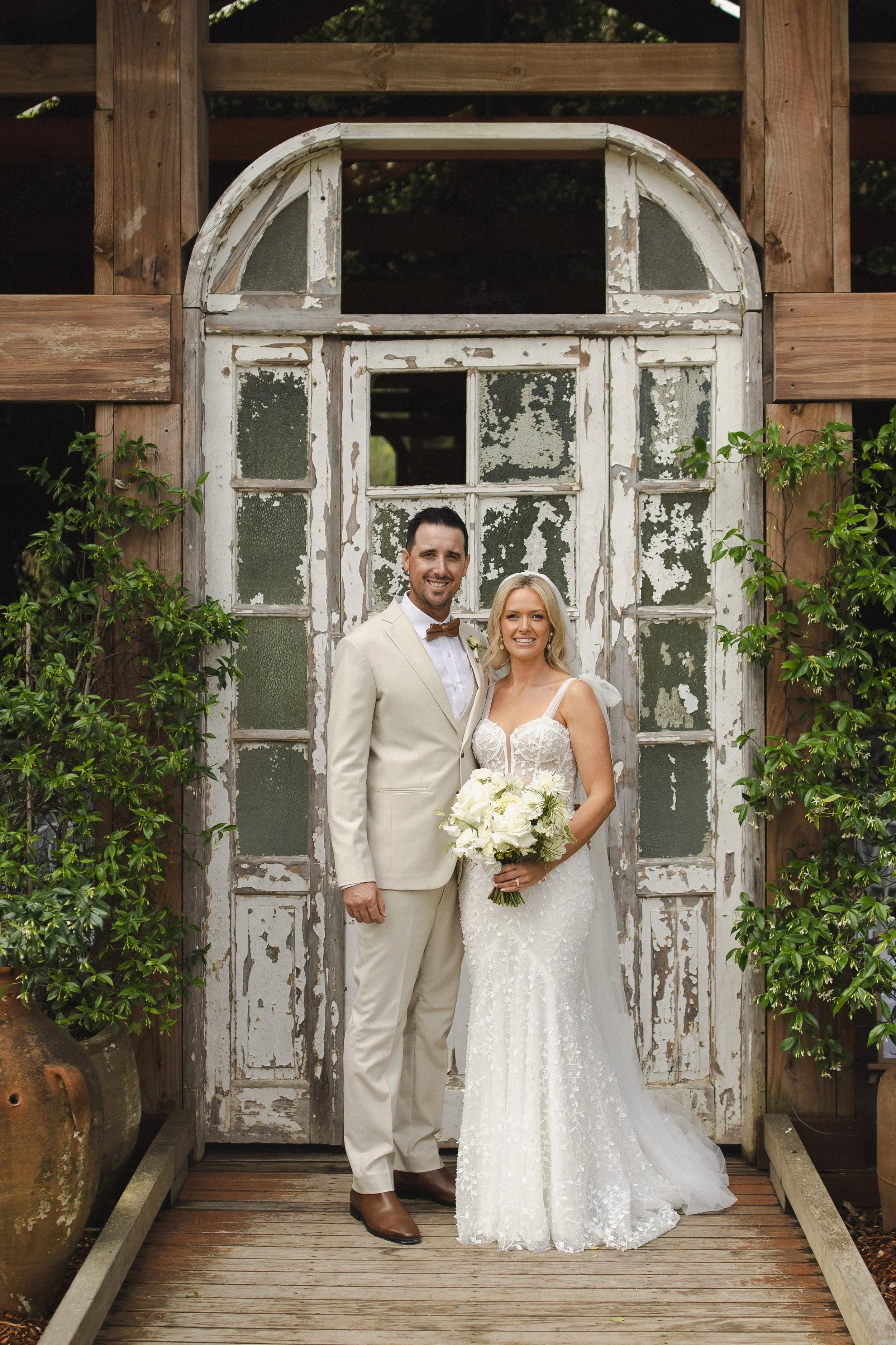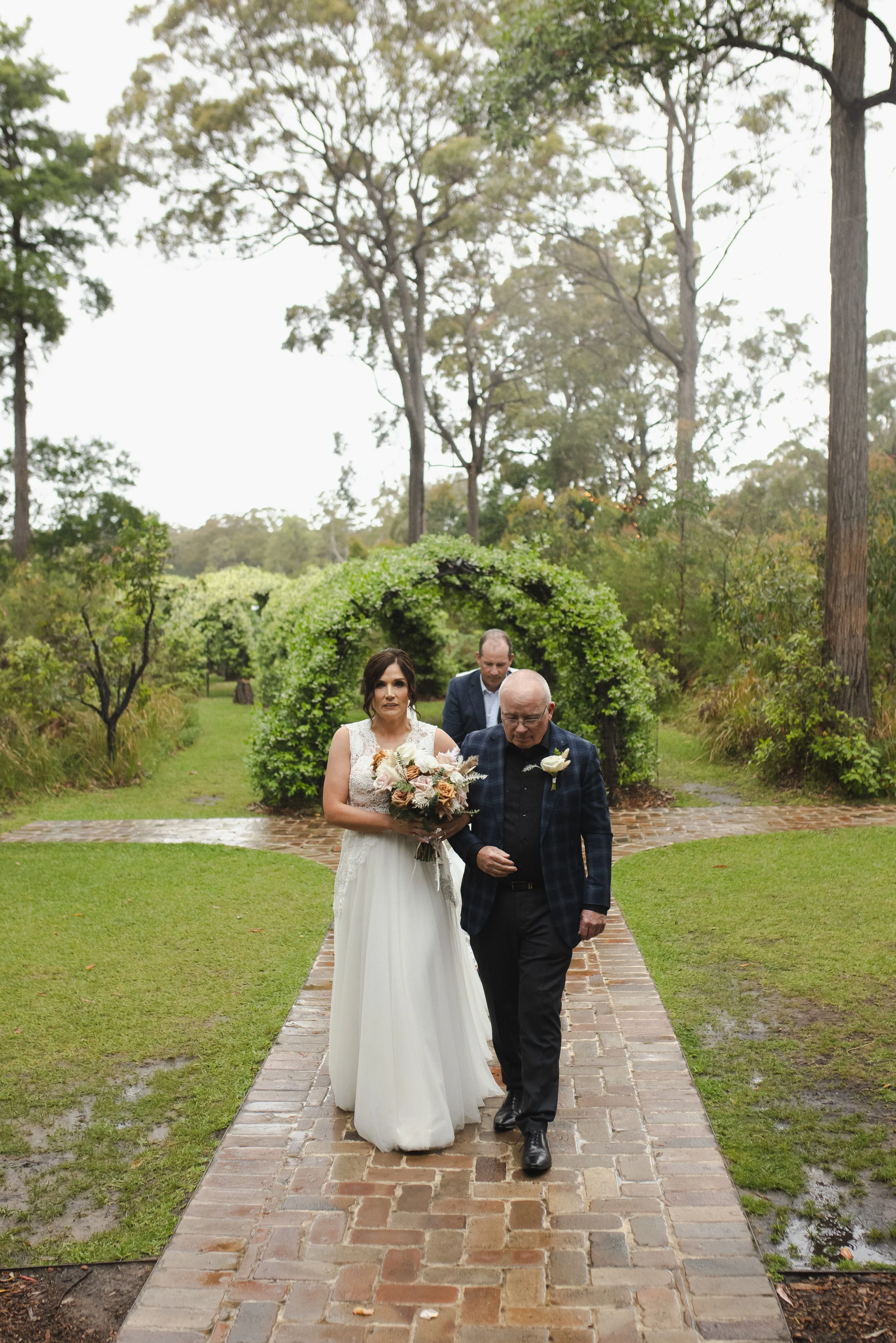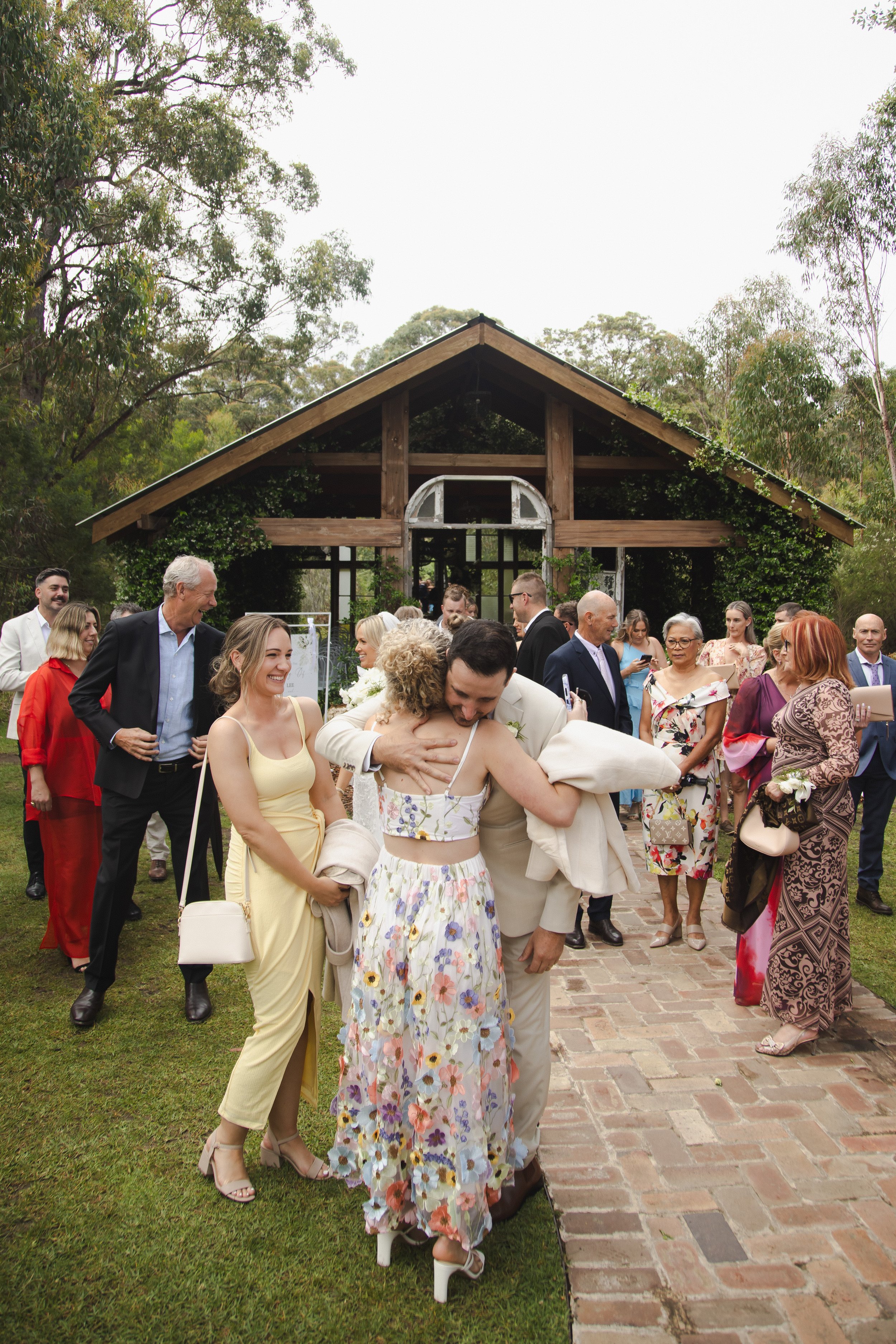 Their ceremony took place in the breathtaking Bush Chapel, a rustic, storybook space draped in ivy, glittering chandeliers hanging from above, and floor-to-ceiling mirrors that reflected the magic back at every angle. Despite the rain, or perhaps because of it, the chapel felt even more romantic. The showers meant that photos were taken inside the chapel, creating beautifully intimate portraits surrounded by lush bushland just outside.