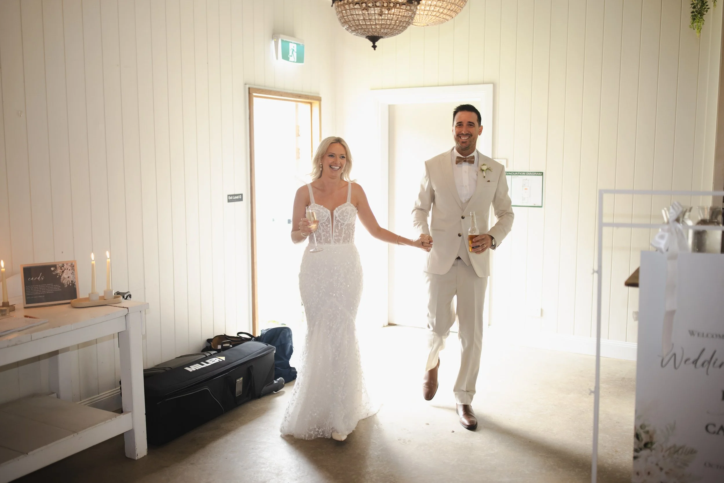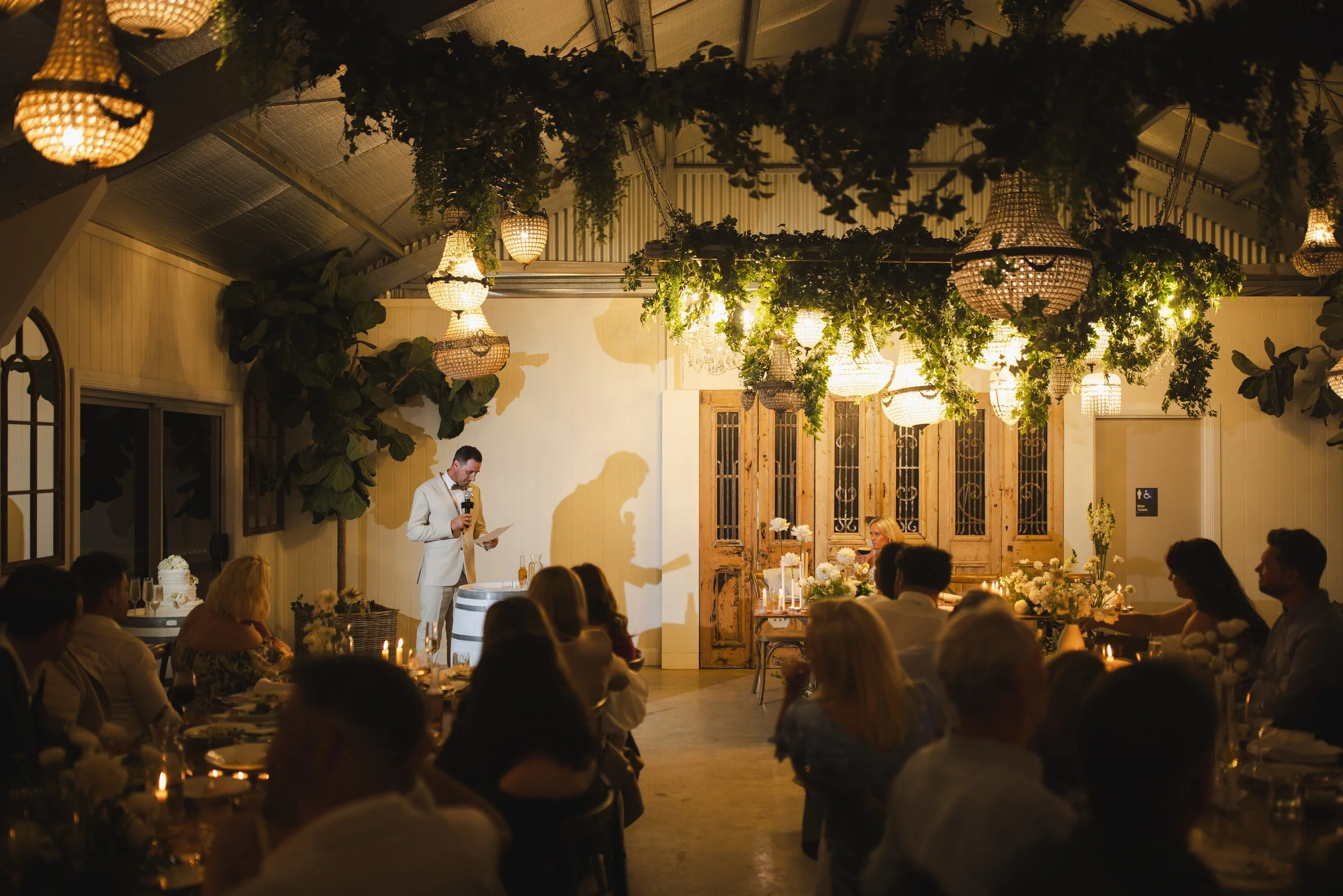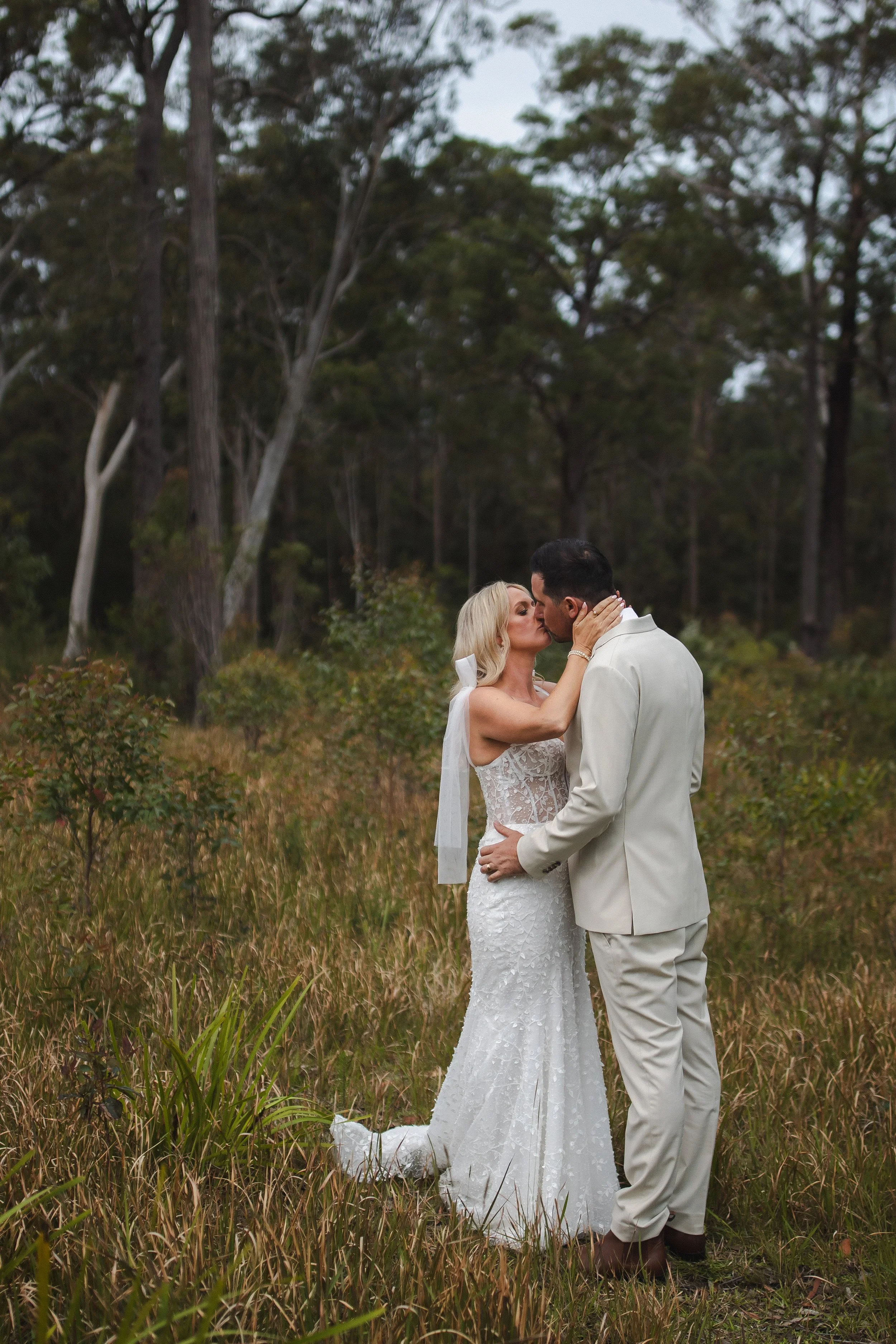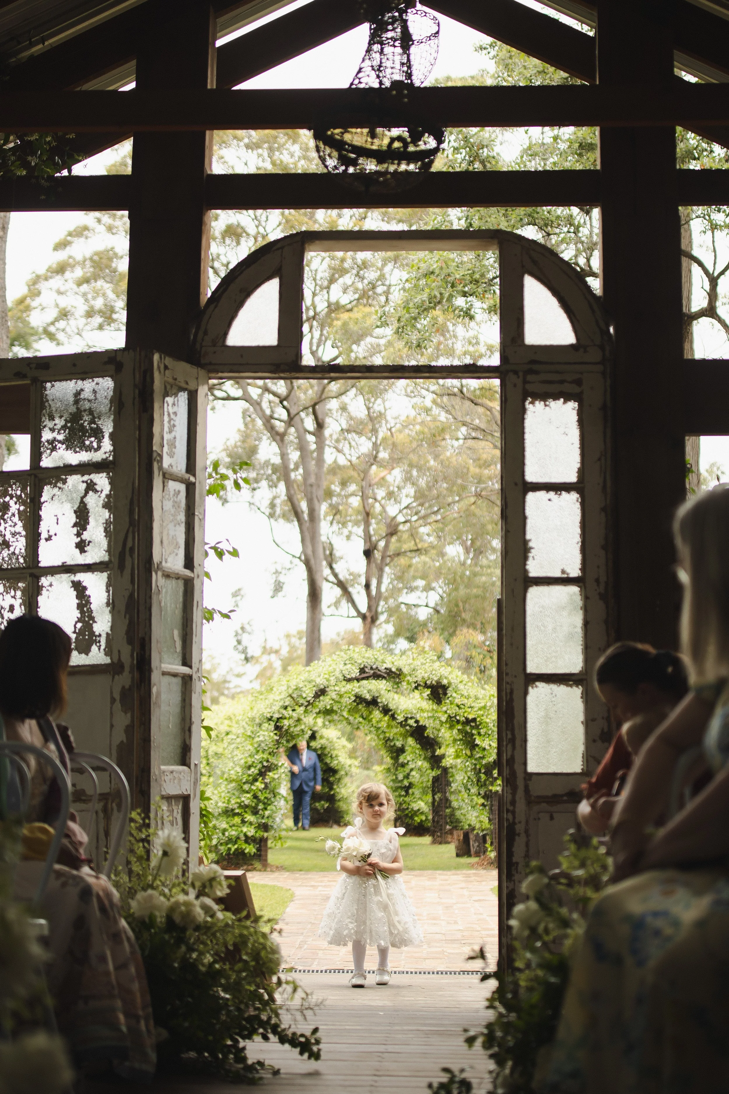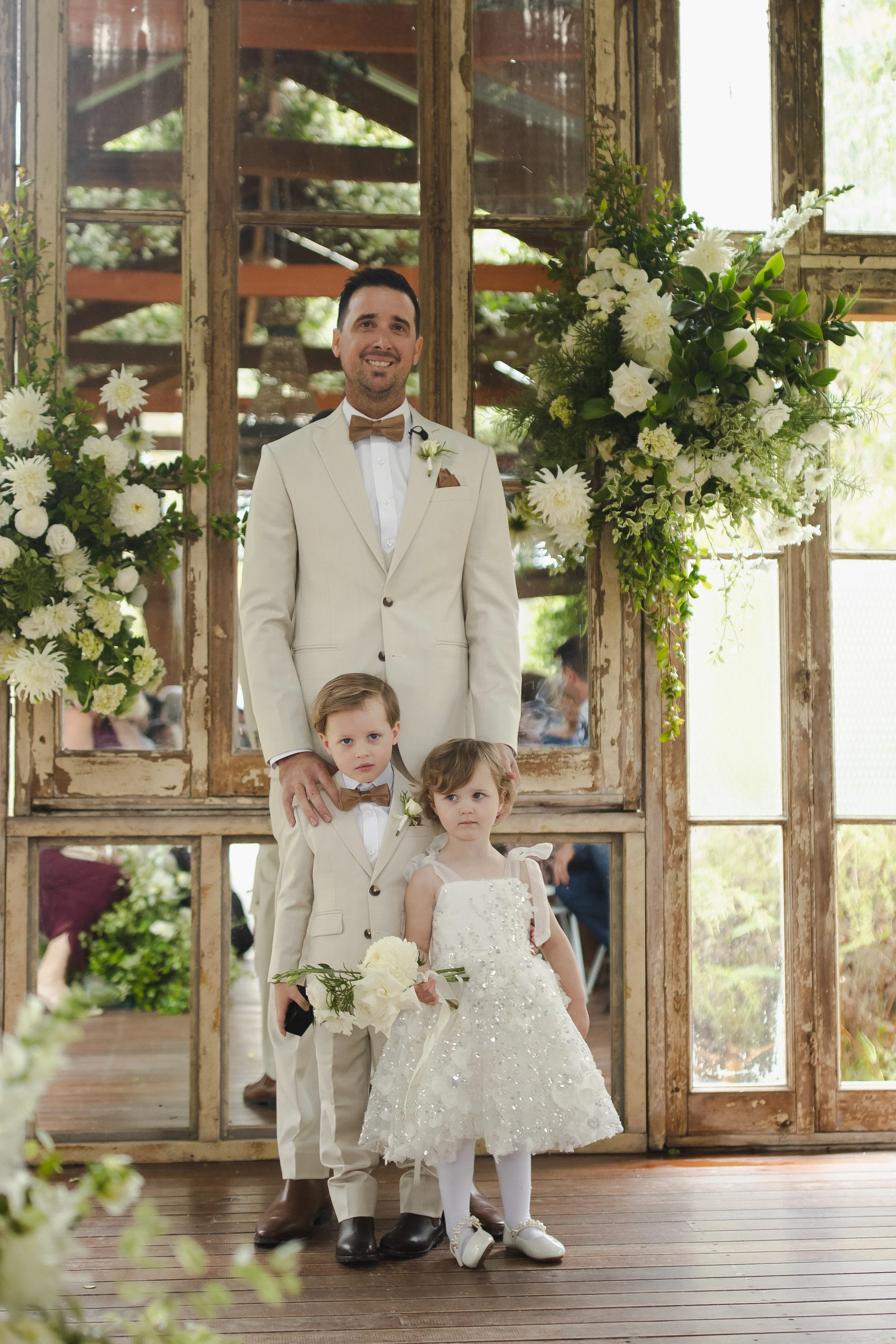 Their ceremony took place in the breathtaking Bush Chapel, a rustic, storybook space draped in ivy, glittering chandeliers hanging from above, and floor-to-ceiling mirrors that reflected the magic back at every angle. Despite the rain, or perhaps because of it, the chapel felt even more romantic. The showers meant that photos were taken inside the chapel, creating beautifully intimate portraits surrounded by lush bushland just outside.