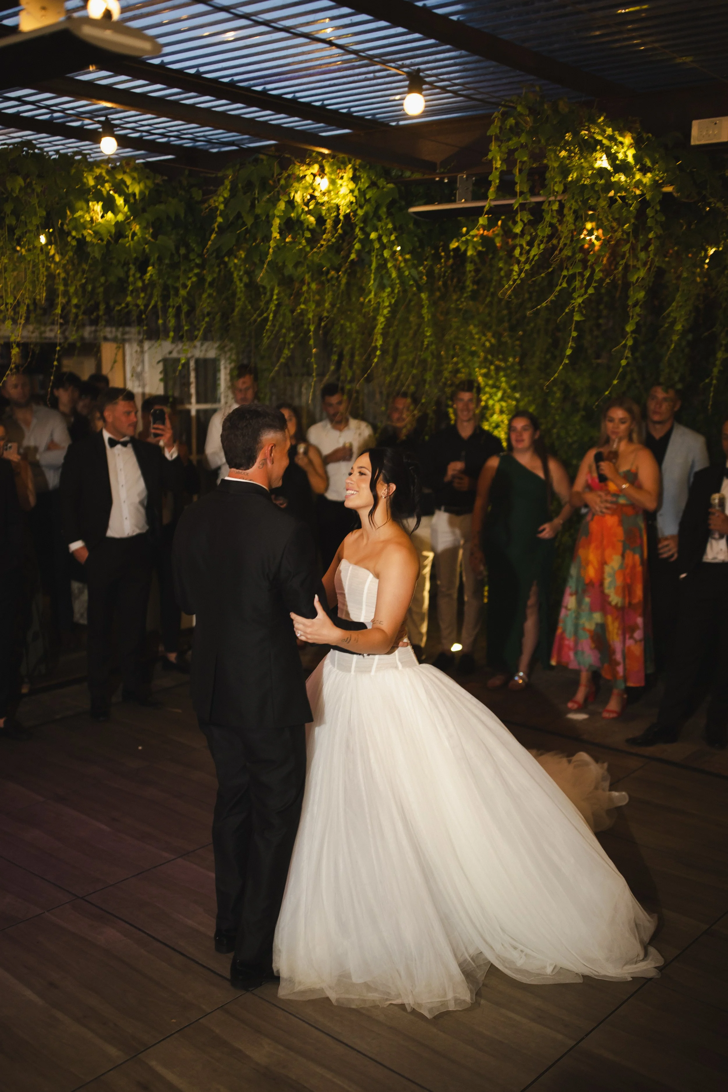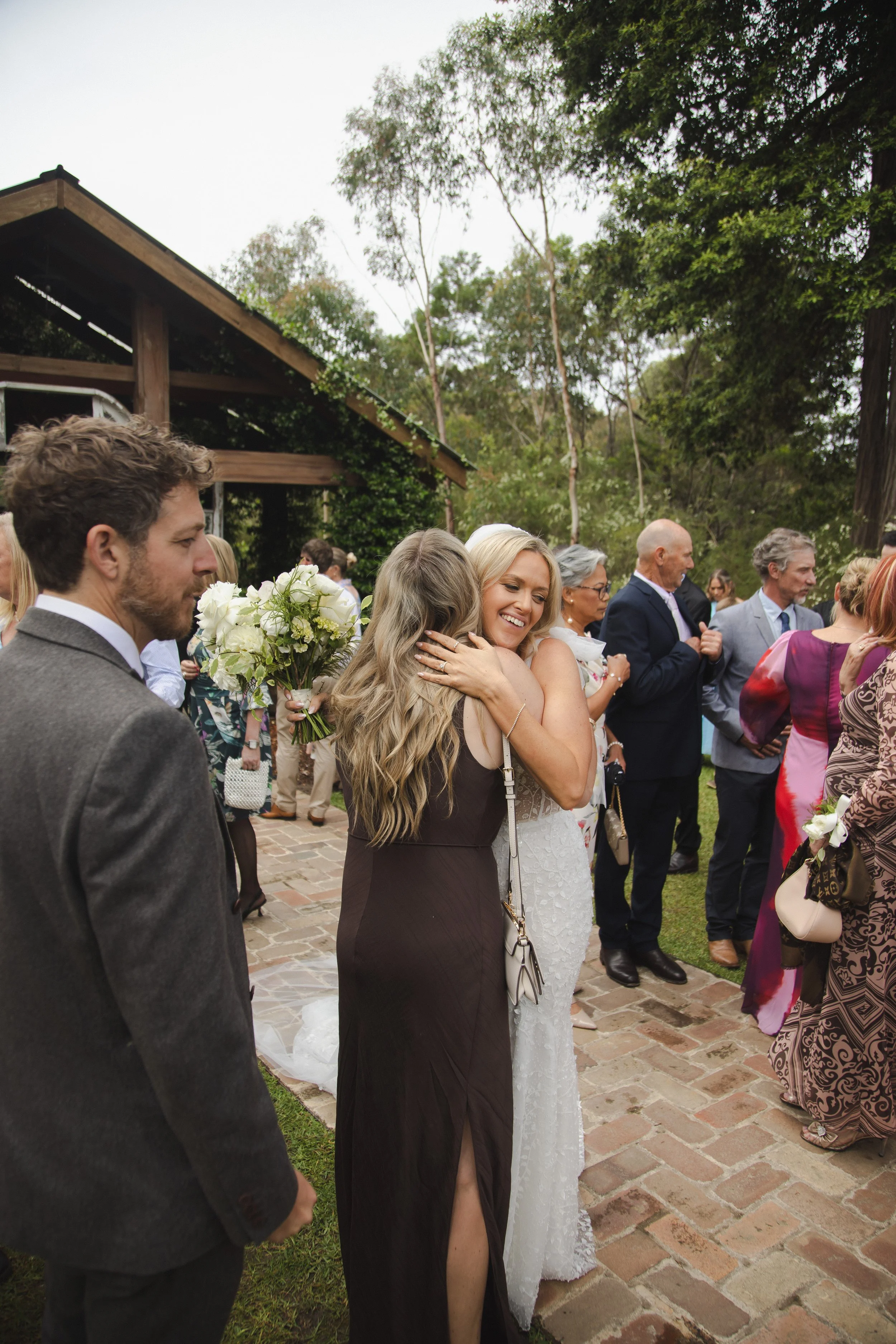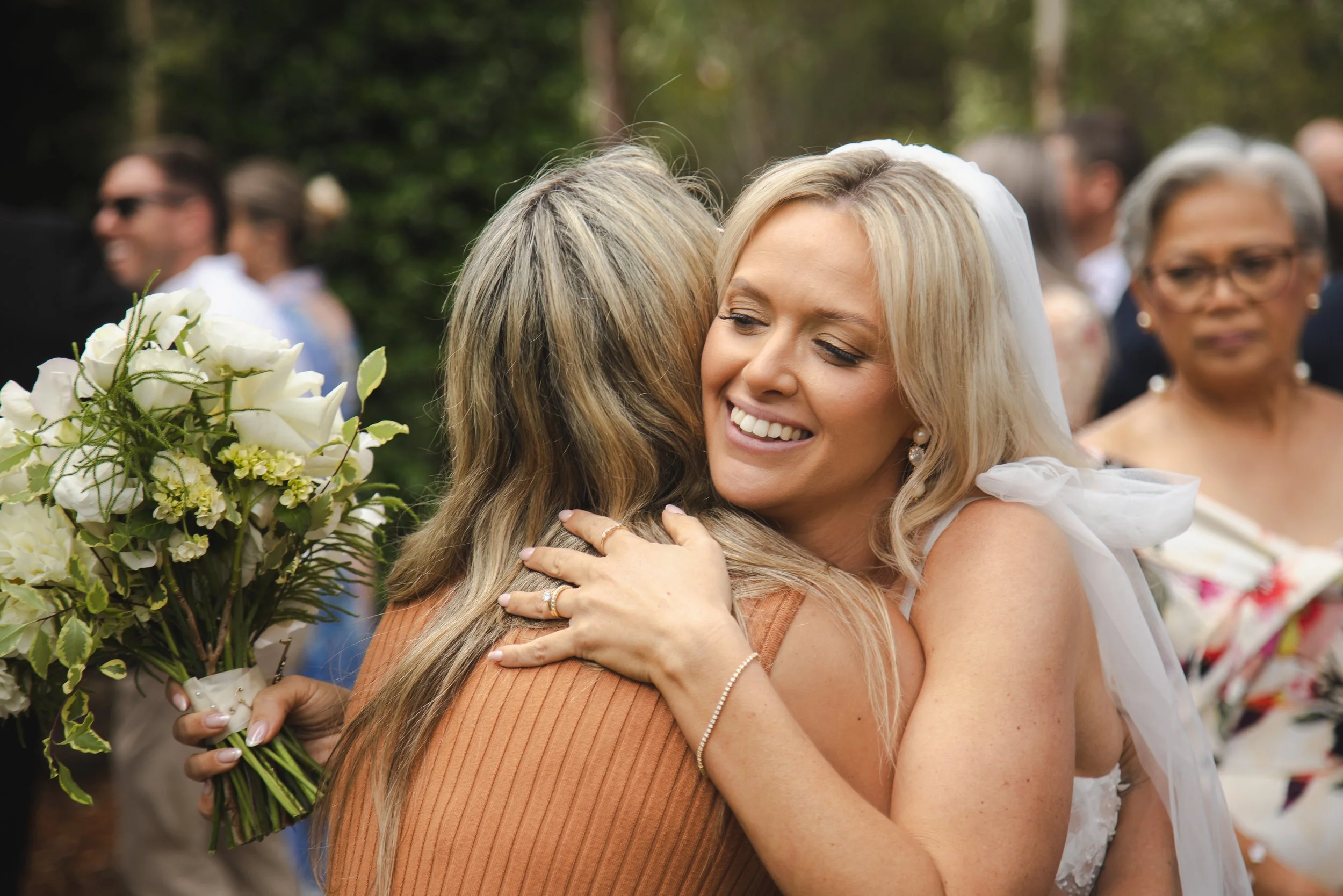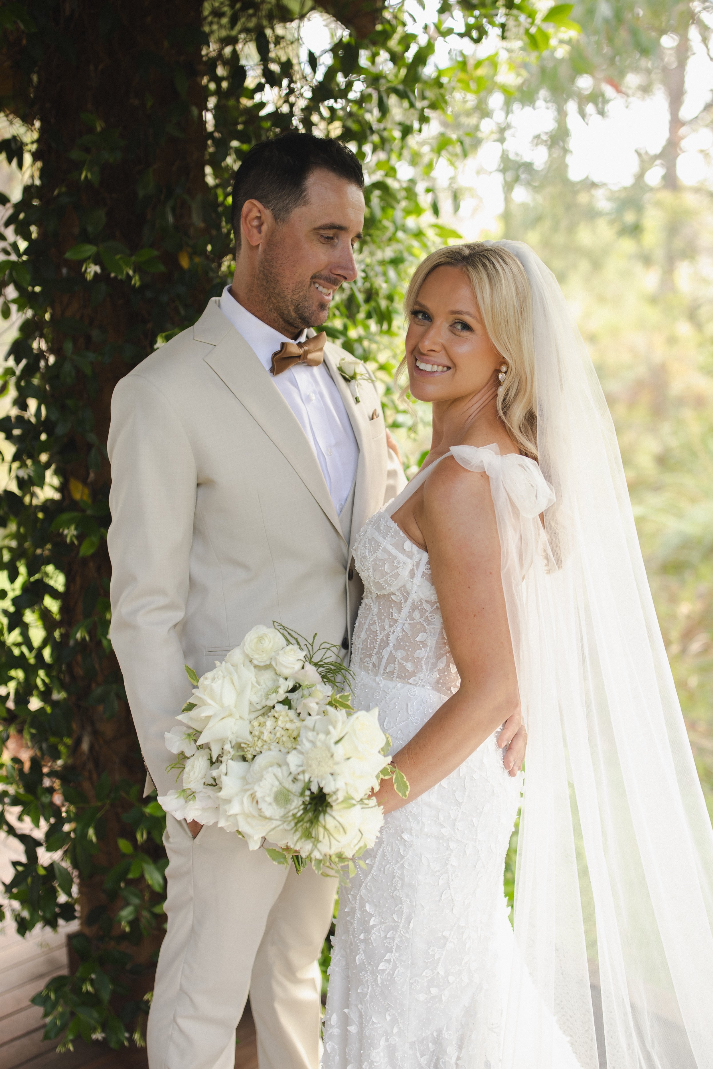 Their ceremony took place in the breathtaking Bush Chapel, a rustic, storybook space draped in ivy, glittering chandeliers hanging from above, and floor-to-ceiling mirrors that reflected the magic back at every angle. Despite the rain, or perhaps because of it, the chapel felt even more romantic. The showers meant that photos were taken inside the chapel, creating beautifully intimate portraits surrounded by lush bushland just outside.