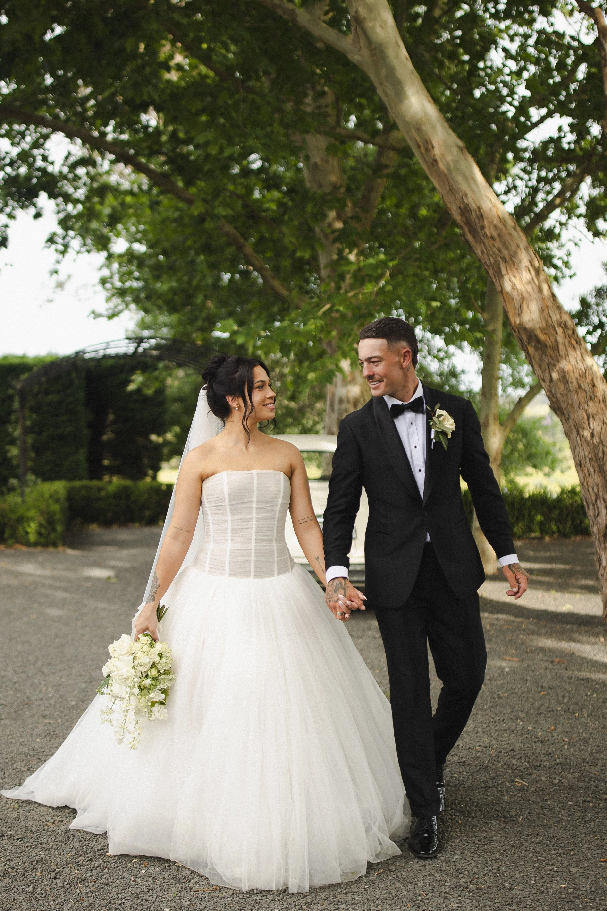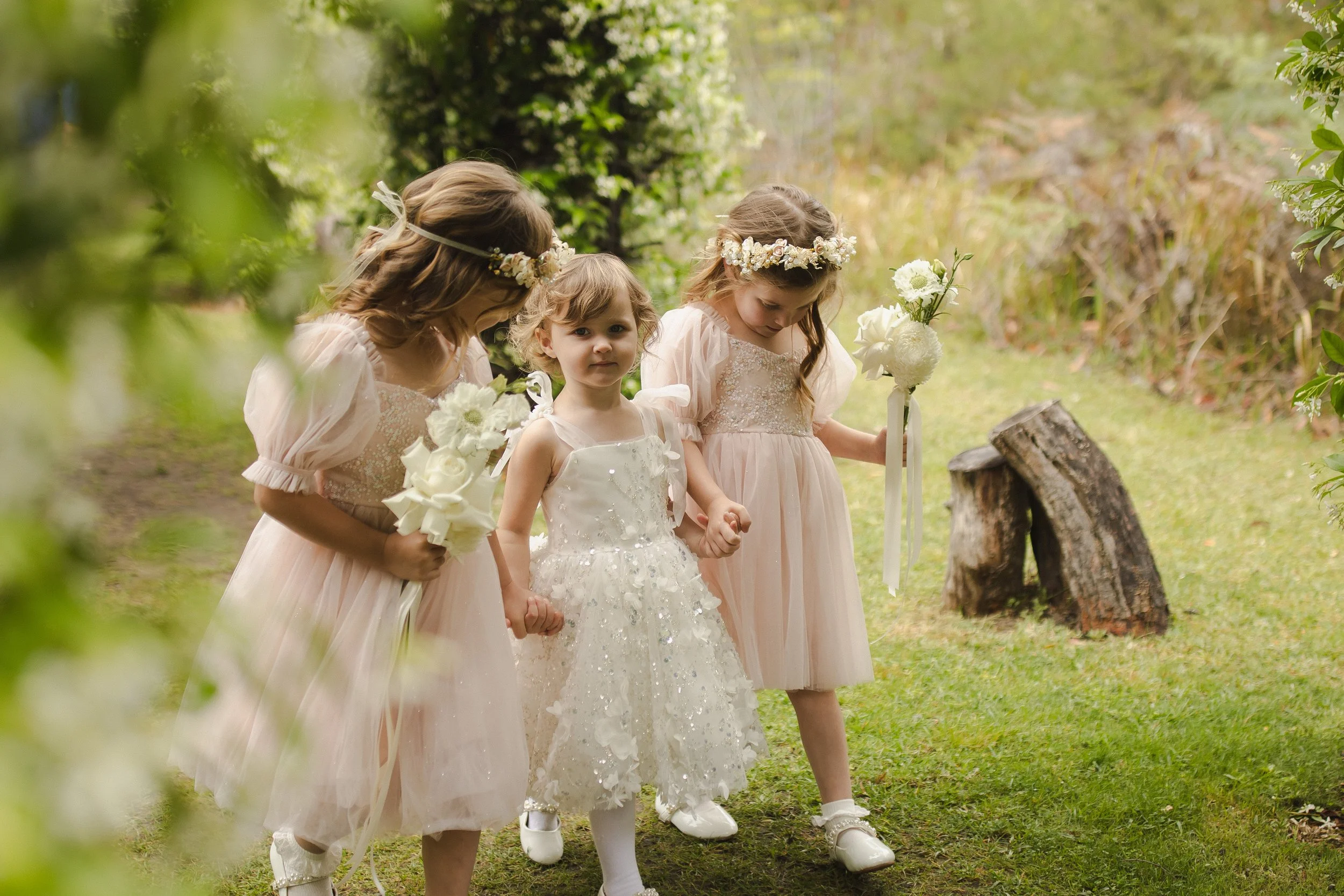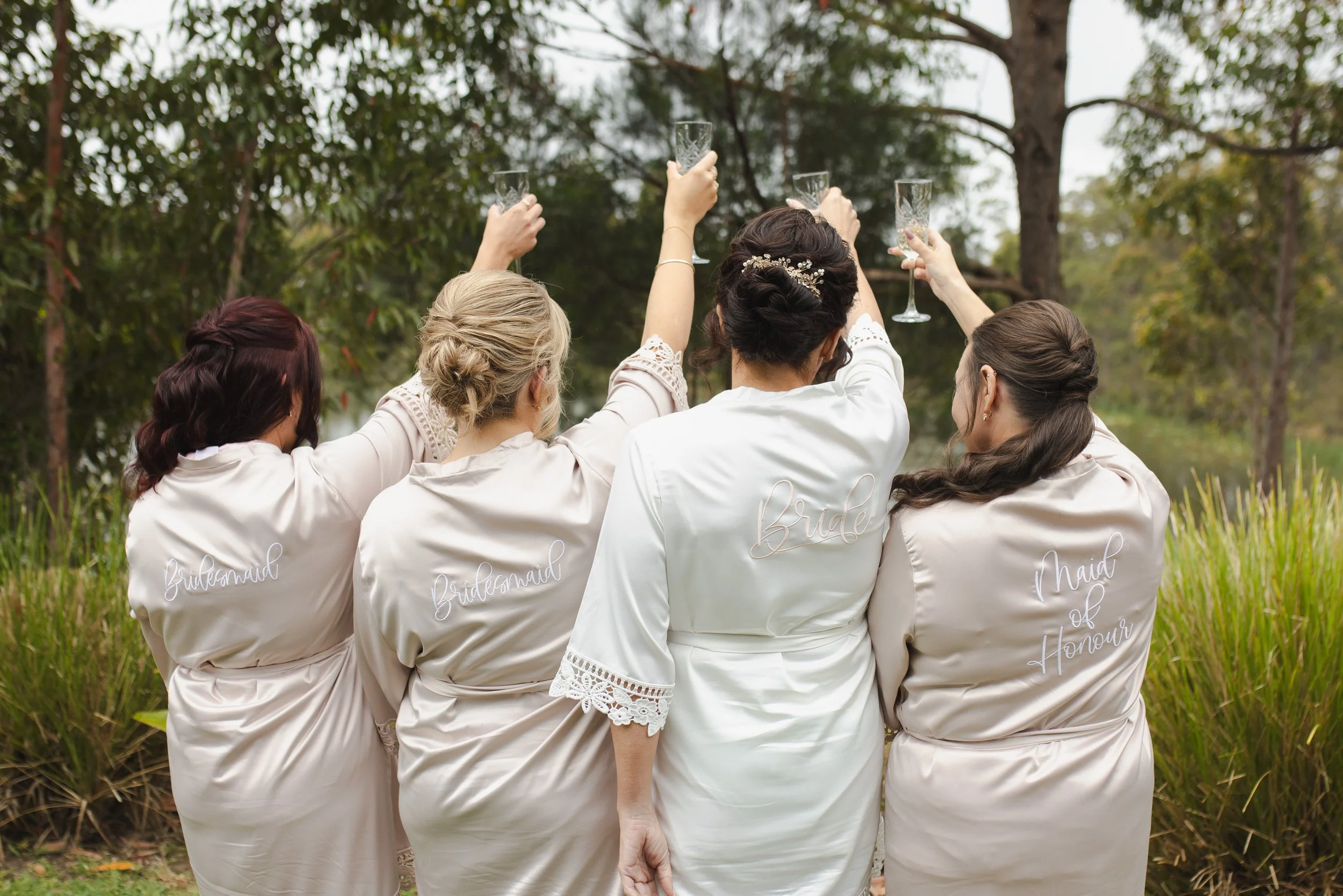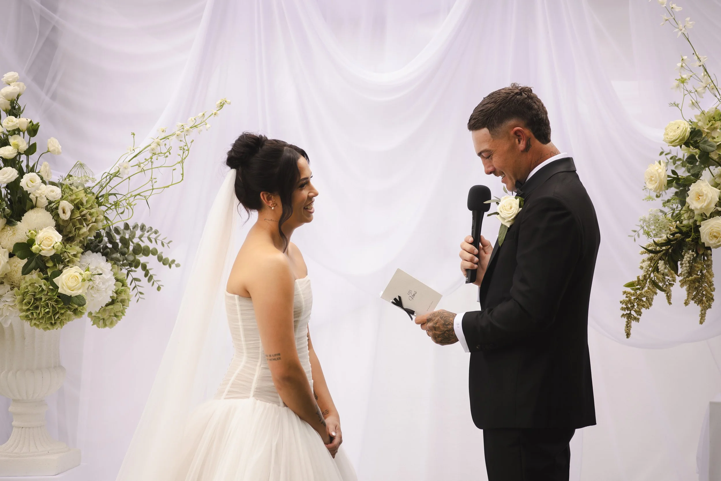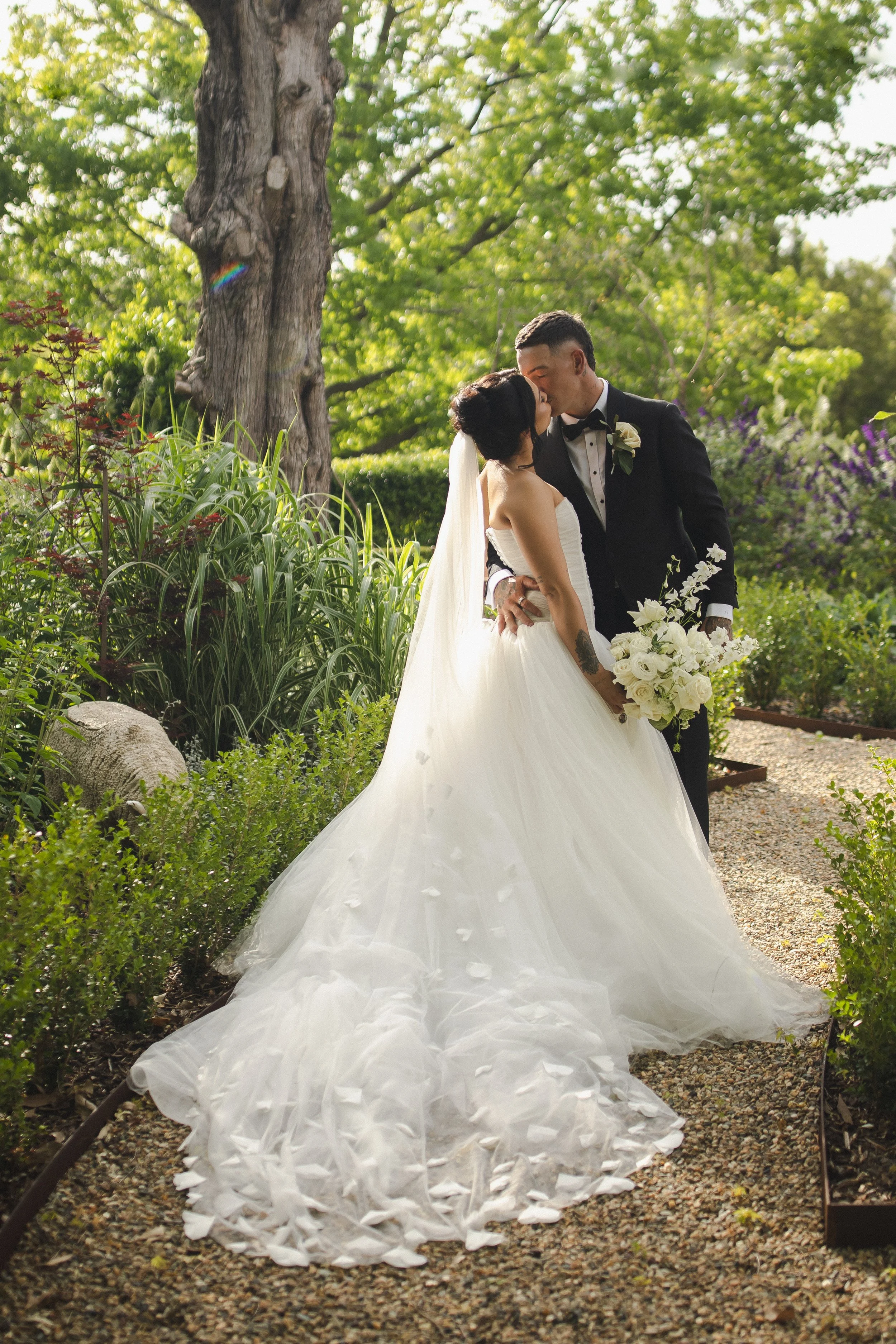 Their ceremony took place in the breathtaking Bush Chapel, a rustic, storybook space draped in ivy, glittering chandeliers hanging from above, and floor-to-ceiling mirrors that reflected the magic back at every angle. Despite the rain, or perhaps because of it, the chapel felt even more romantic. The showers meant that photos were taken inside the chapel, creating beautifully intimate portraits surrounded by lush bushland just outside.