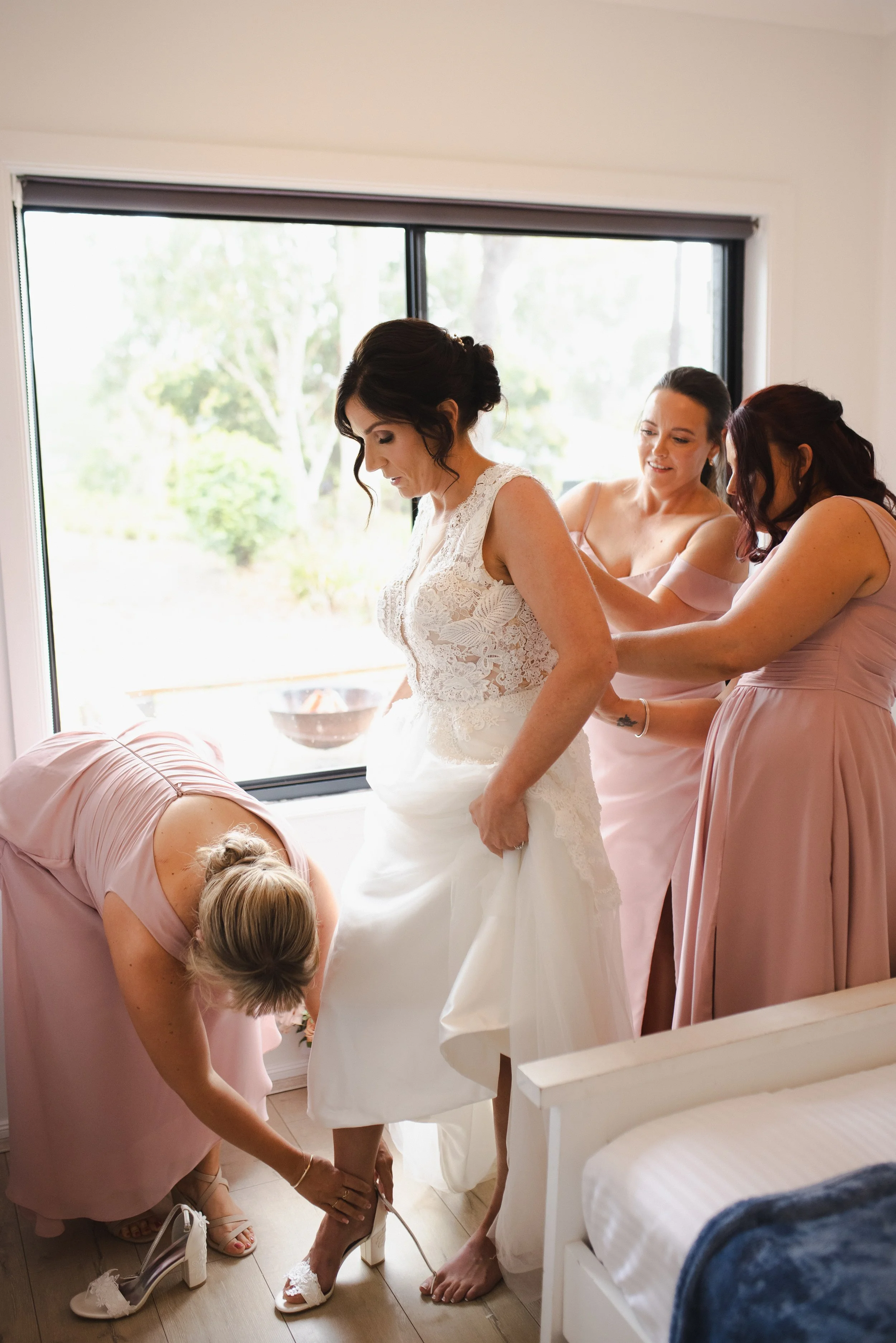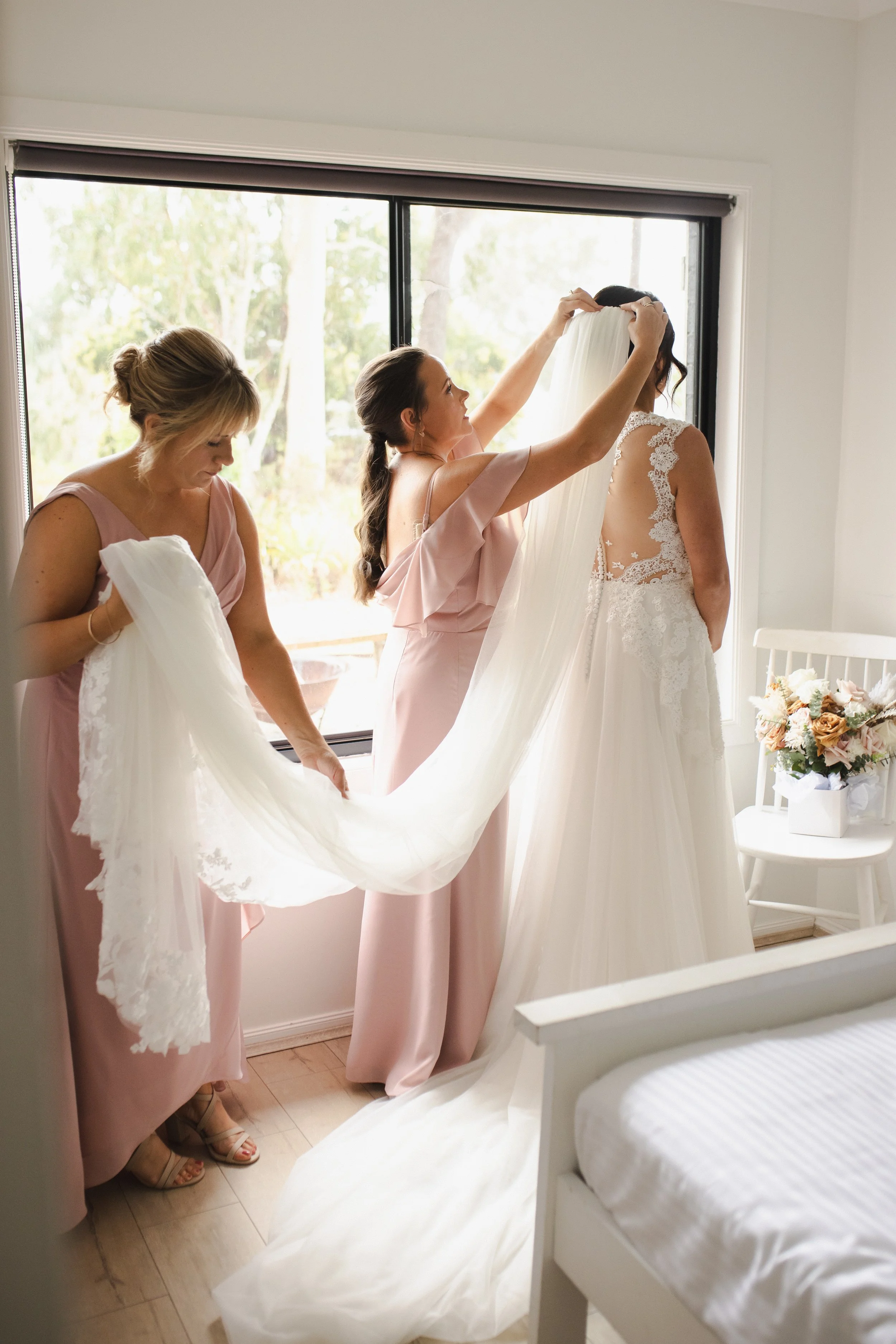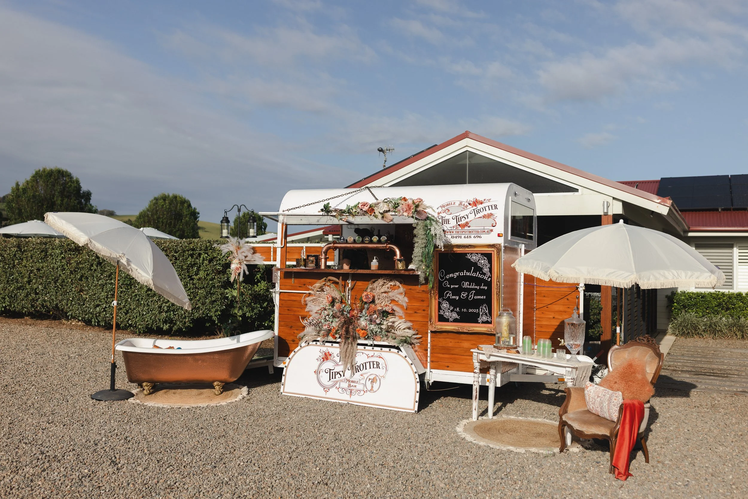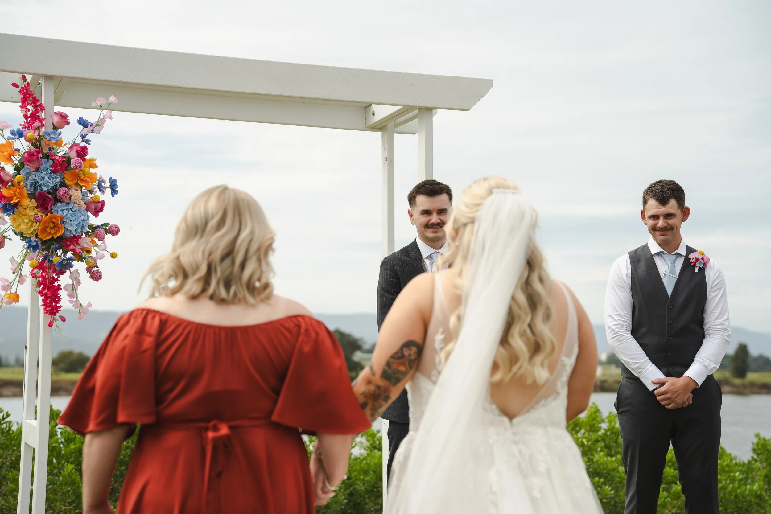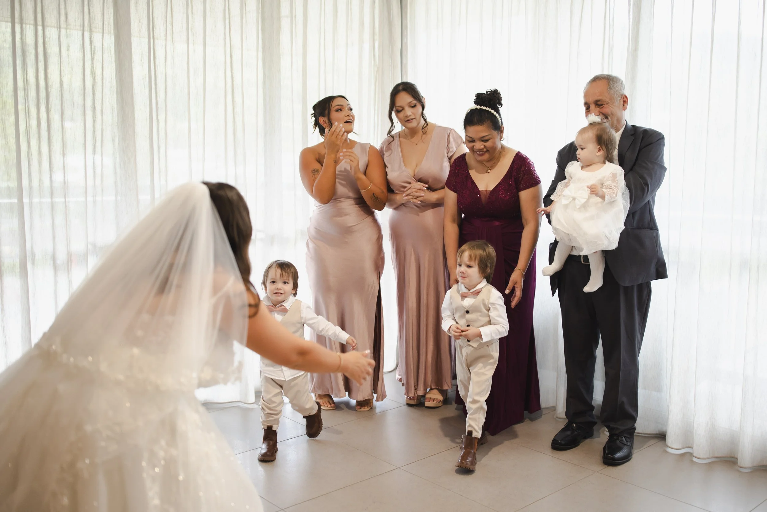 Their ceremony took place in the breathtaking Bush Chapel, a rustic, storybook space draped in ivy, glittering chandeliers hanging from above, and floor-to-ceiling mirrors that reflected the magic back at every angle. Despite the rain, or perhaps because of it, the chapel felt even more romantic. The showers meant that photos were taken inside the chapel, creating beautifully intimate portraits surrounded by lush bushland just outside.