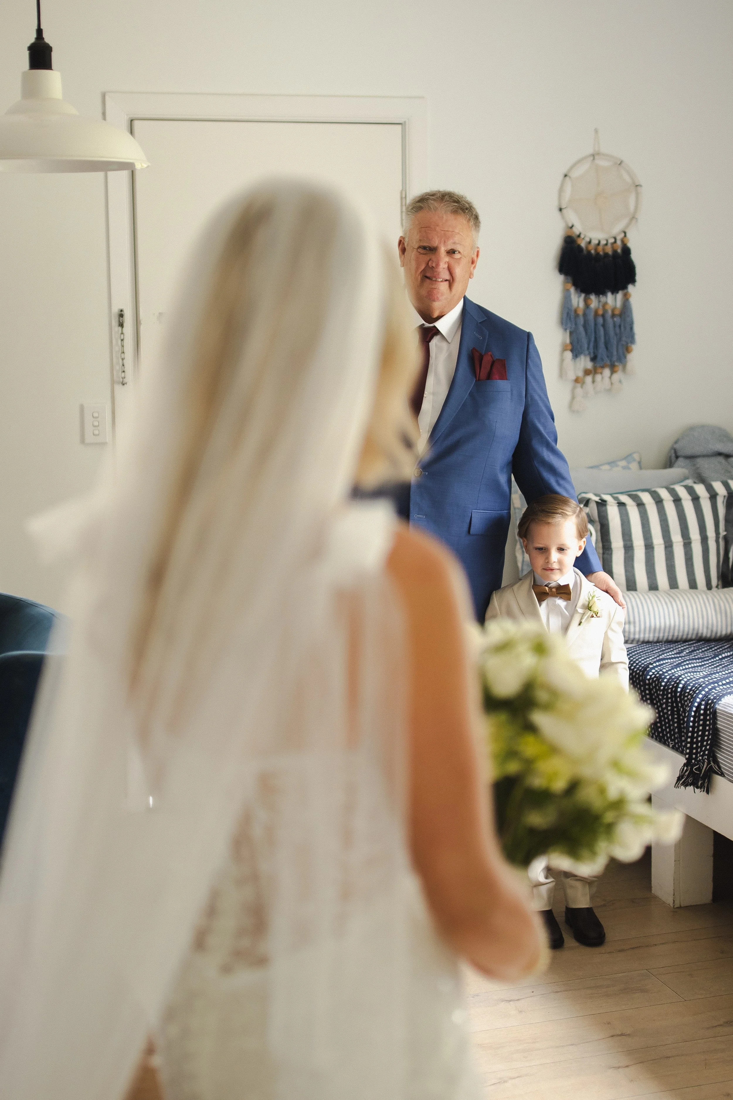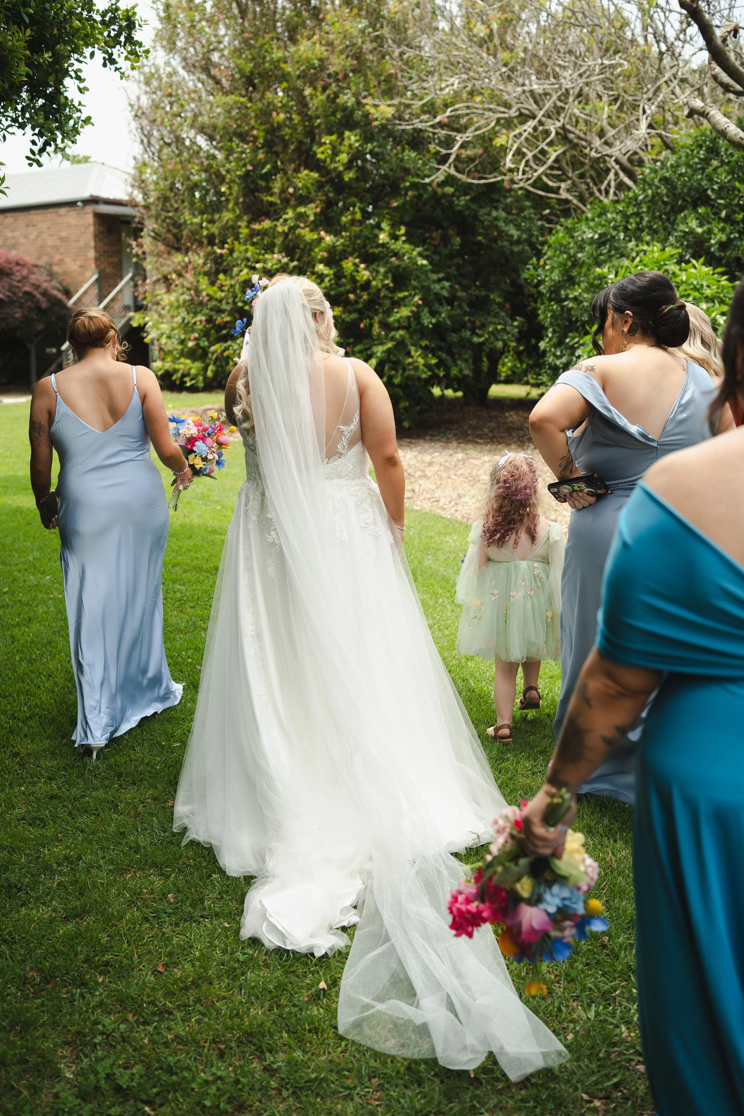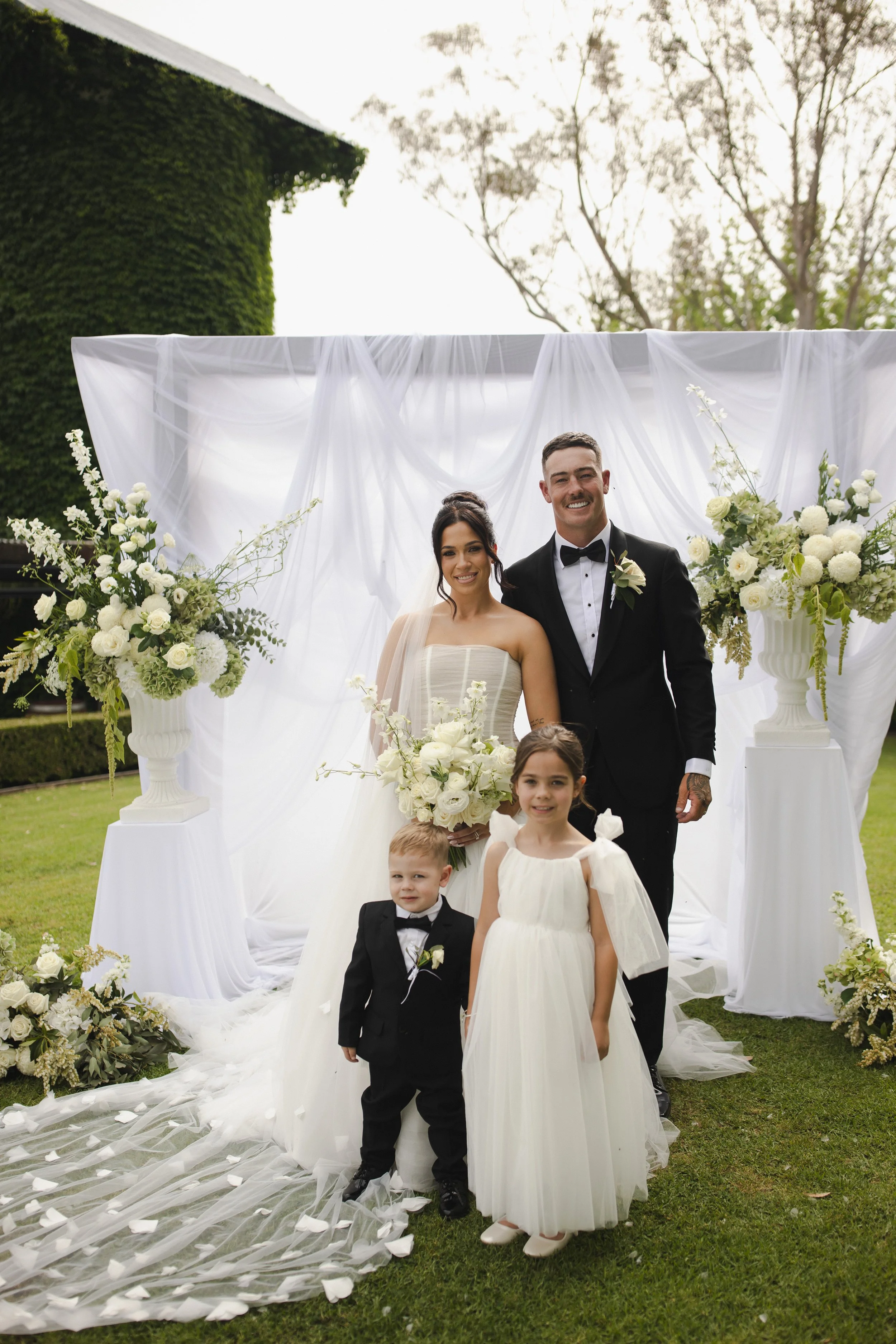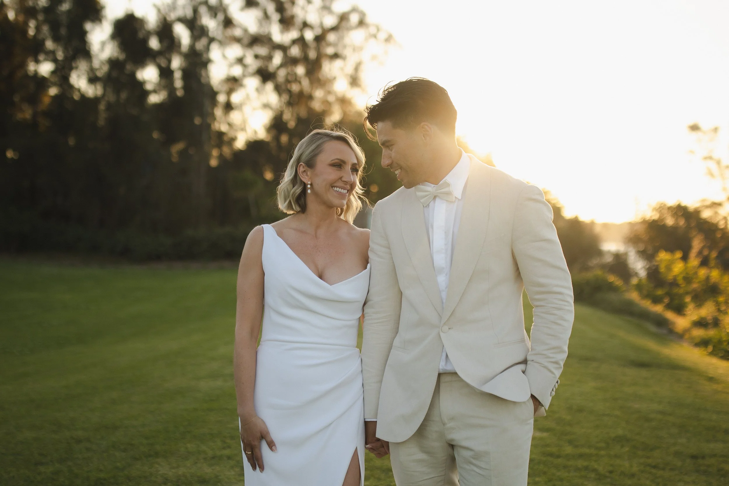 Their ceremony took place in the breathtaking Bush Chapel, a rustic, storybook space draped in ivy, glittering chandeliers hanging from above, and floor-to-ceiling mirrors that reflected the magic back at every angle. Despite the rain, or perhaps because of it, the chapel felt even more romantic. The showers meant that photos were taken inside the chapel, creating beautifully intimate portraits surrounded by lush bushland just outside.