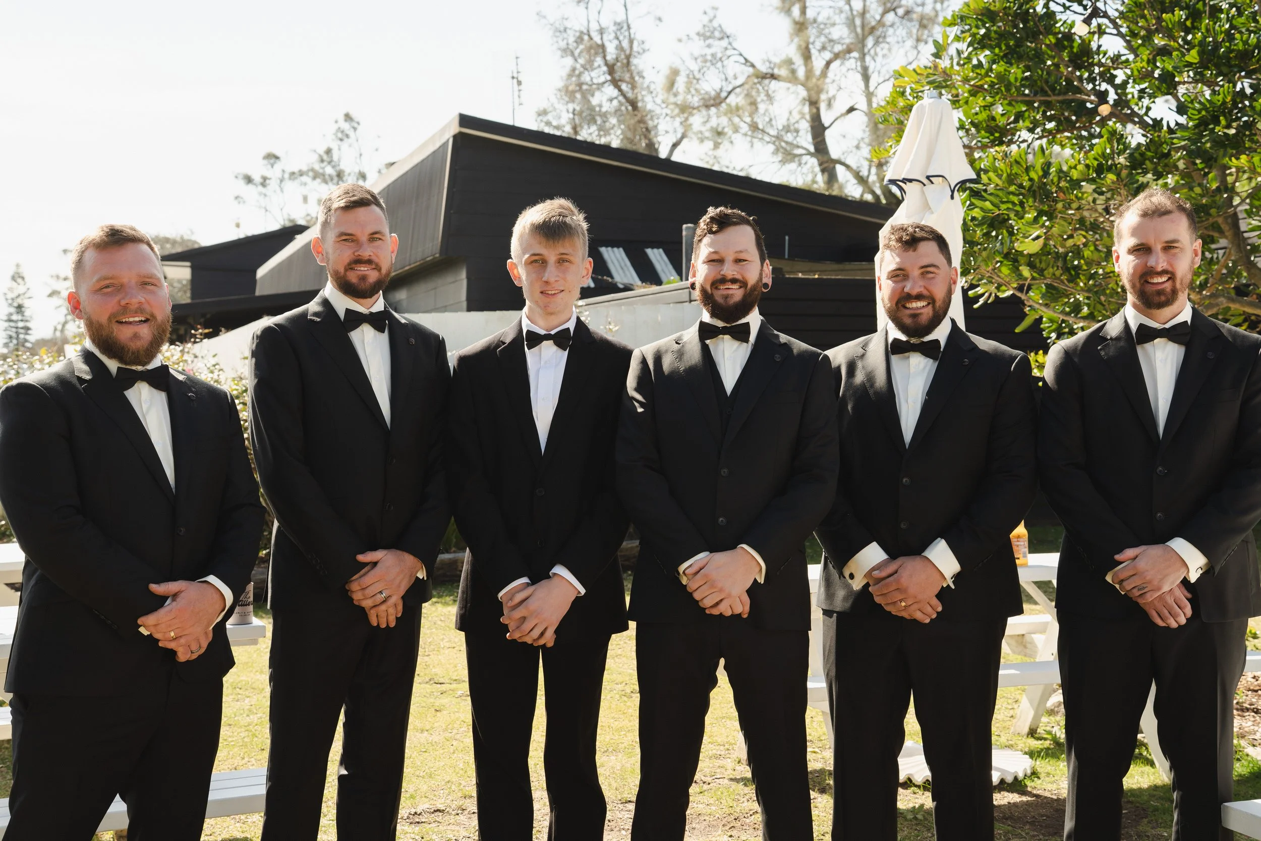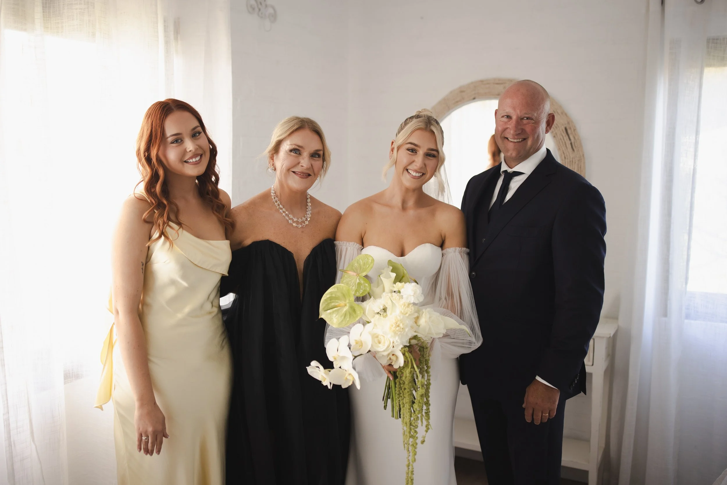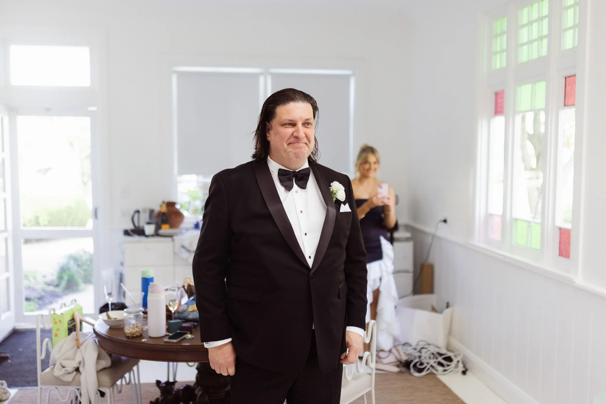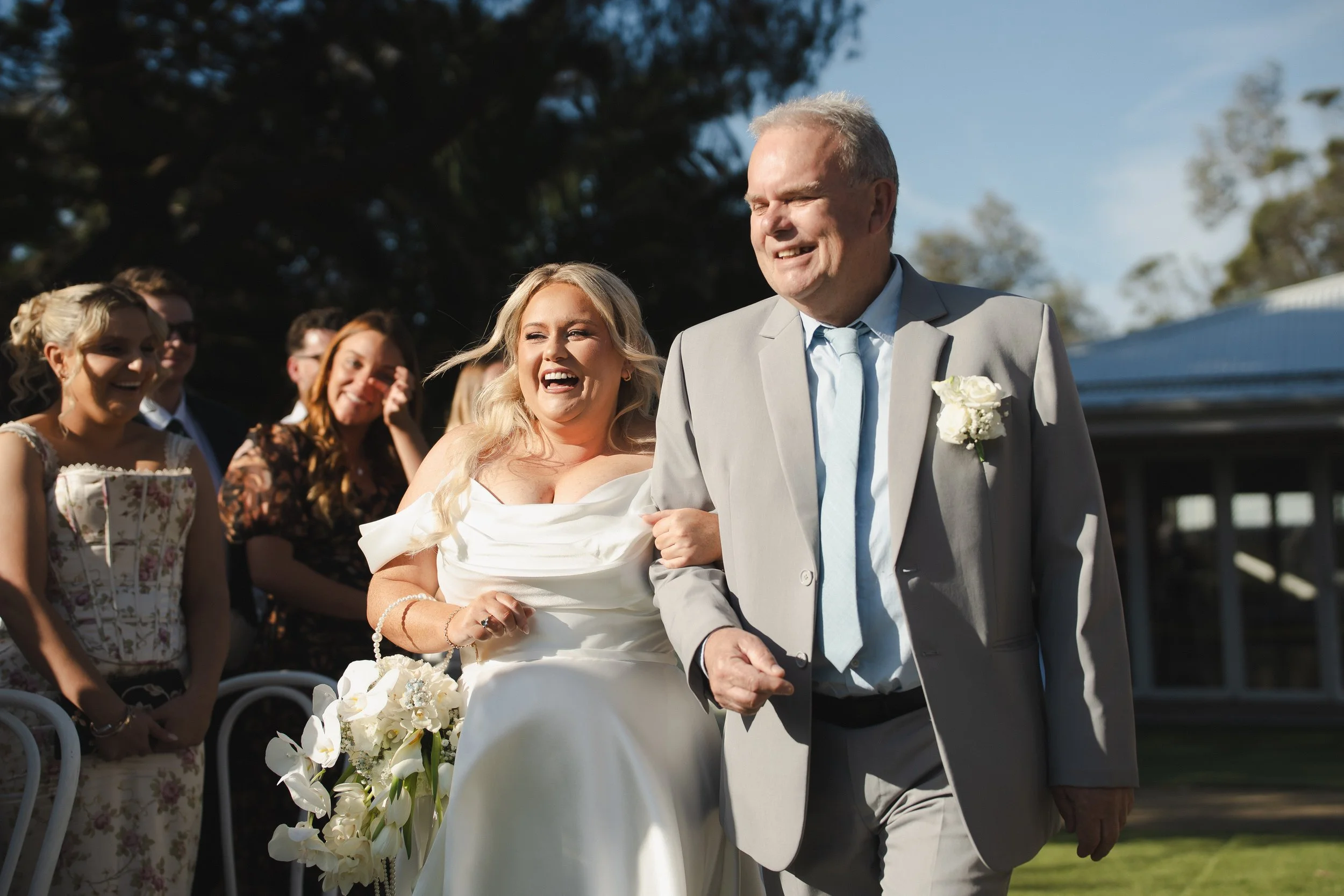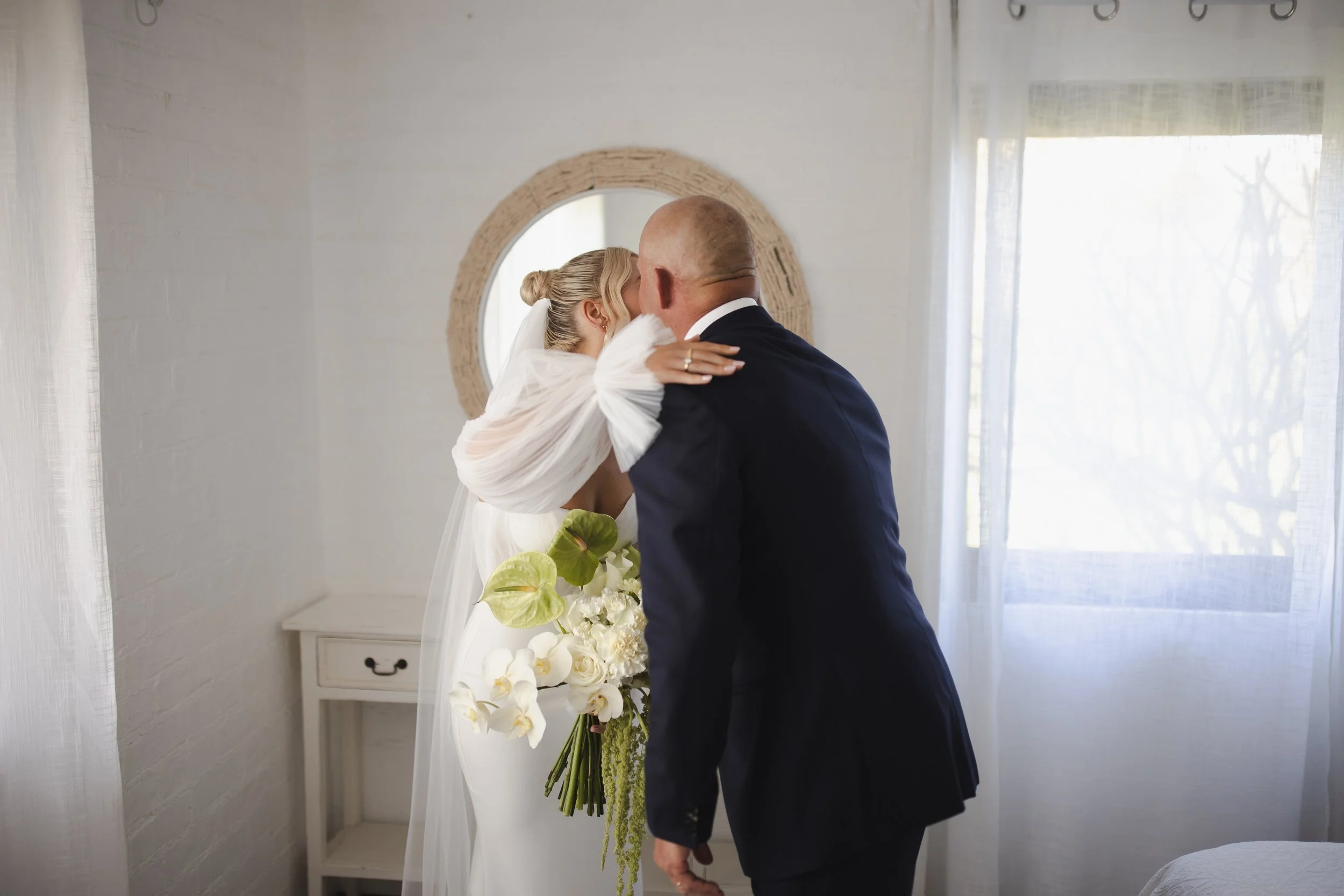 The morning began with the boys getting ready in Culburra, sharing a relaxed start to the day before heading to the venue. Meanwhile, in the bridal suite, Phoebe shared a quiet first look with her bridesmaids — a joyful, emotional moment that set the tone for what was to come. A few minutes later, she had another with her dad. It was one of those still, meaningful pauses that said more than words could.
