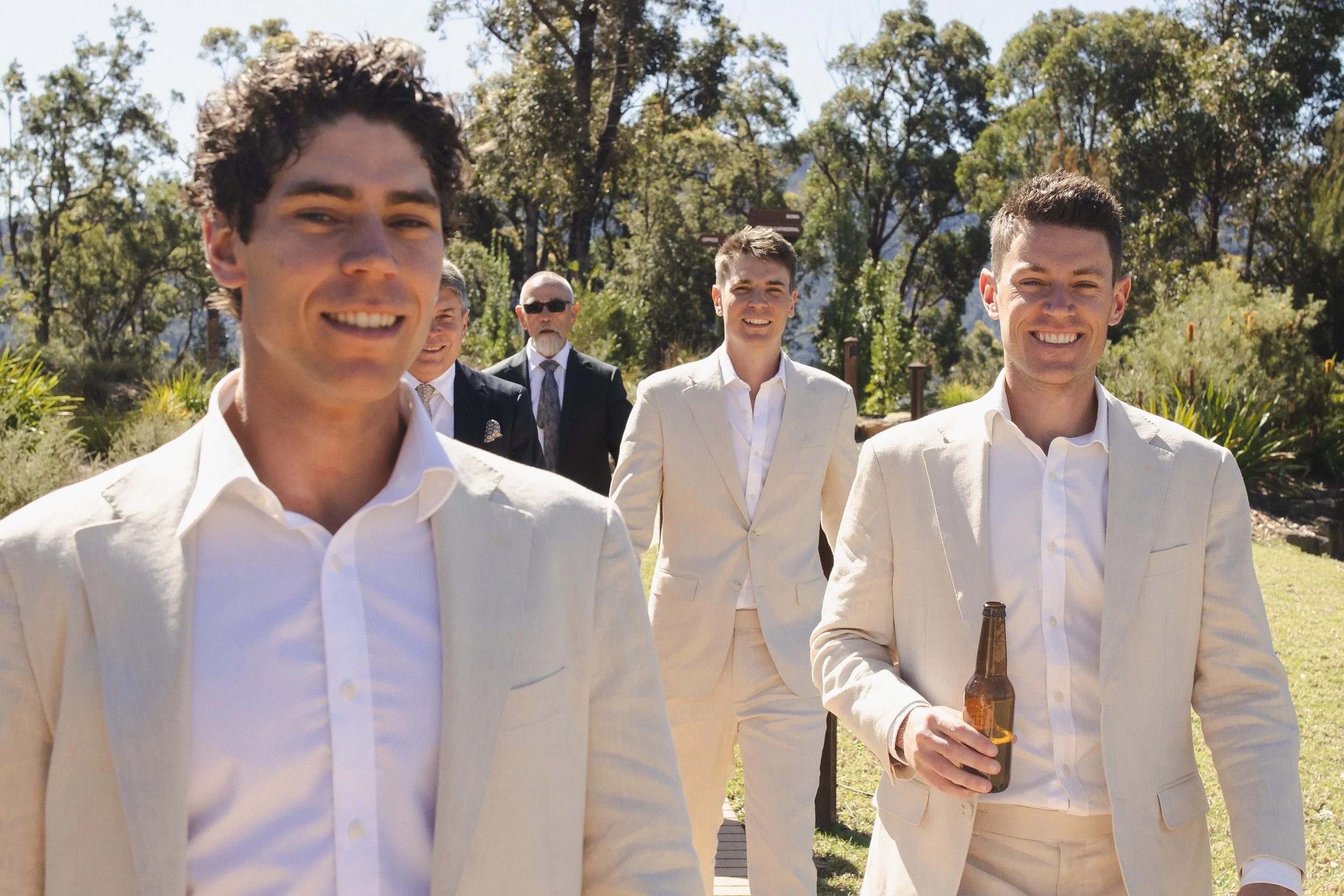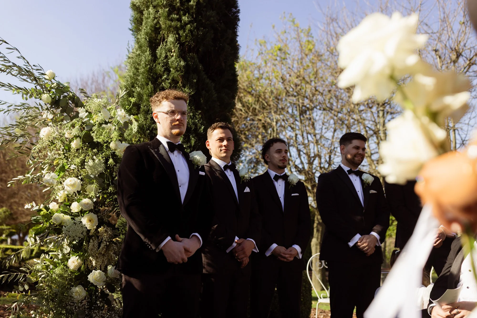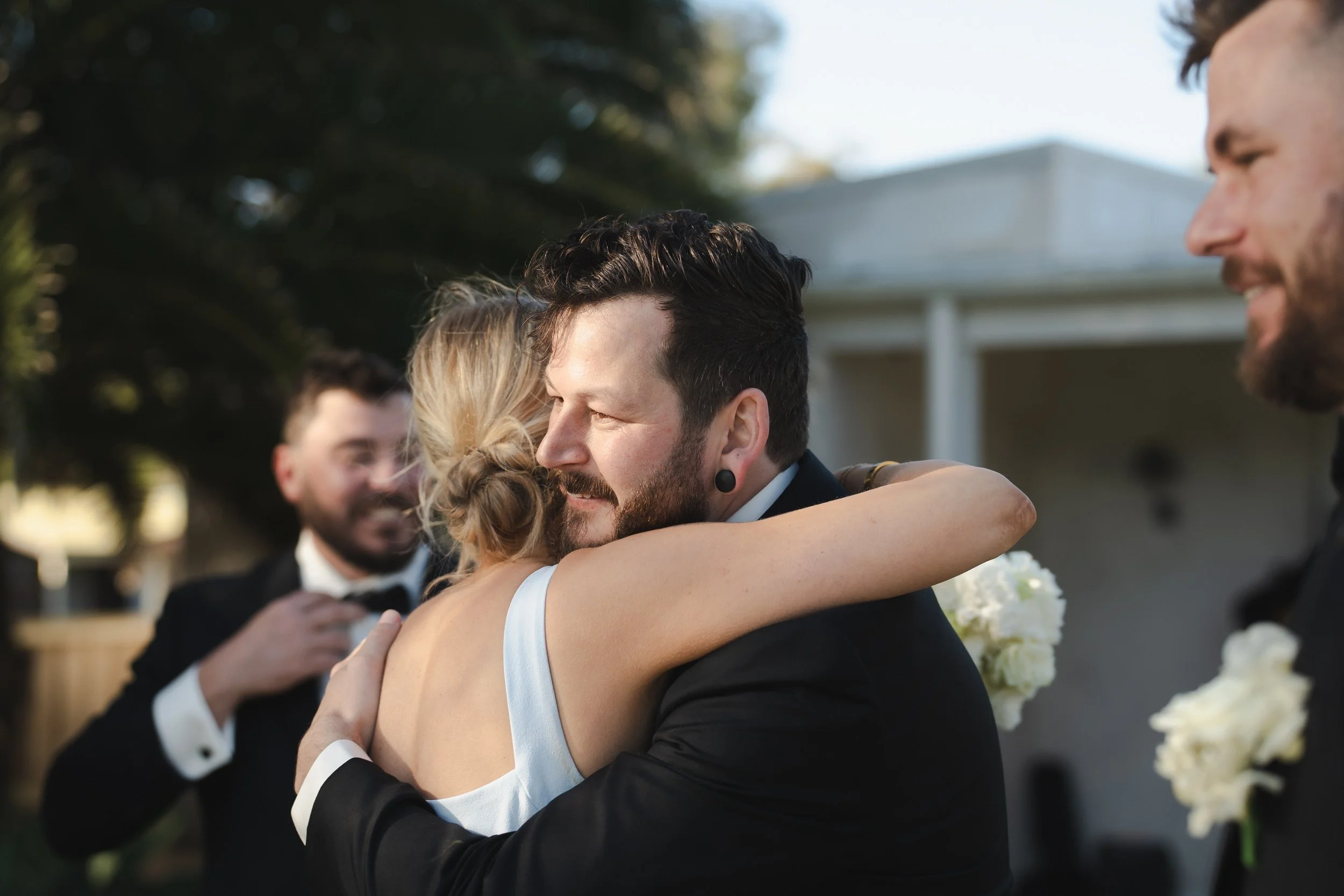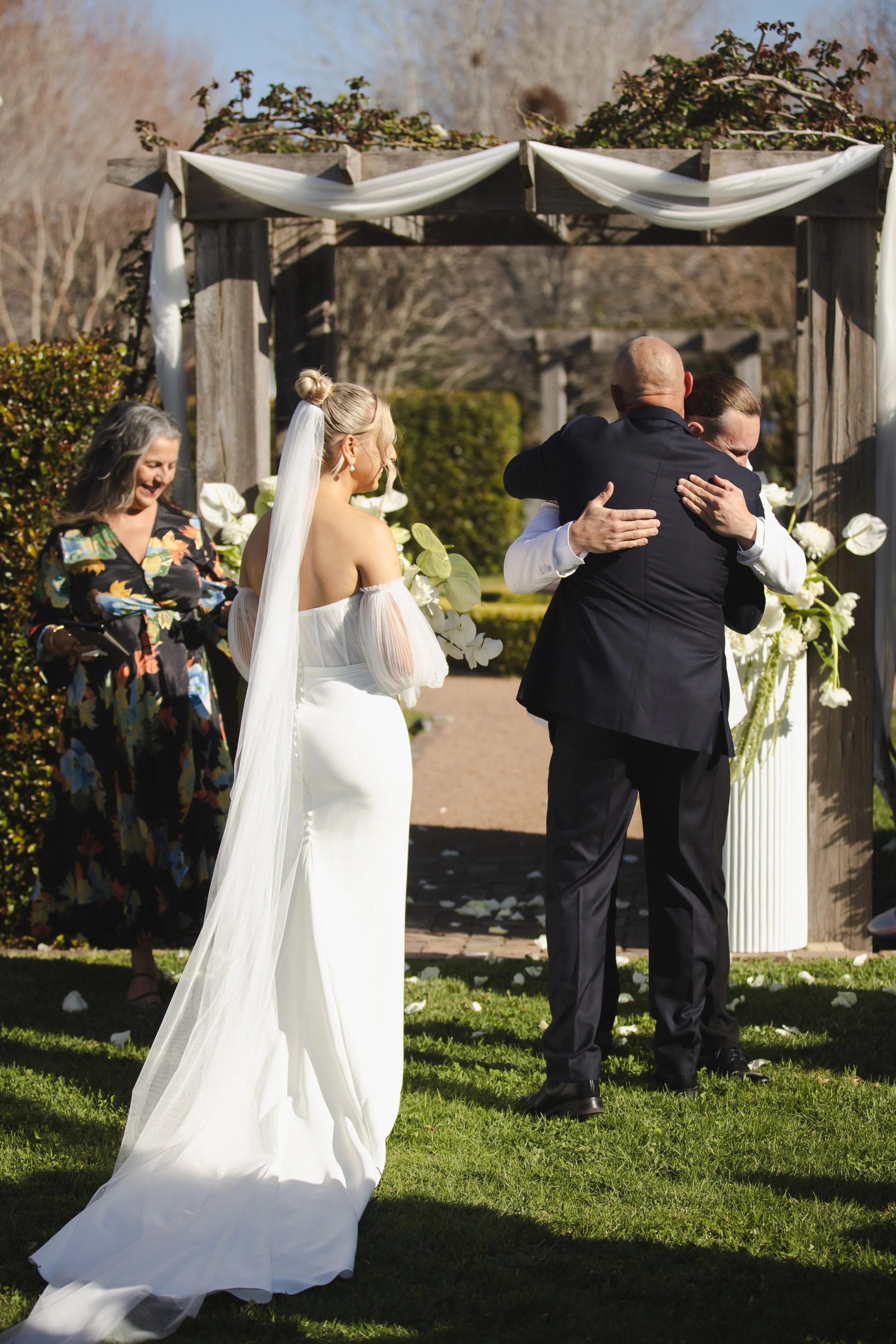 The morning began with the boys getting ready in Culburra, sharing a relaxed start to the day before heading to the venue. Meanwhile, in the bridal suite, Phoebe shared a quiet first look with her bridesmaids — a joyful, emotional moment that set the tone for what was to come. A few minutes later, she had another with her dad. It was one of those still, meaningful pauses that said more than words could.