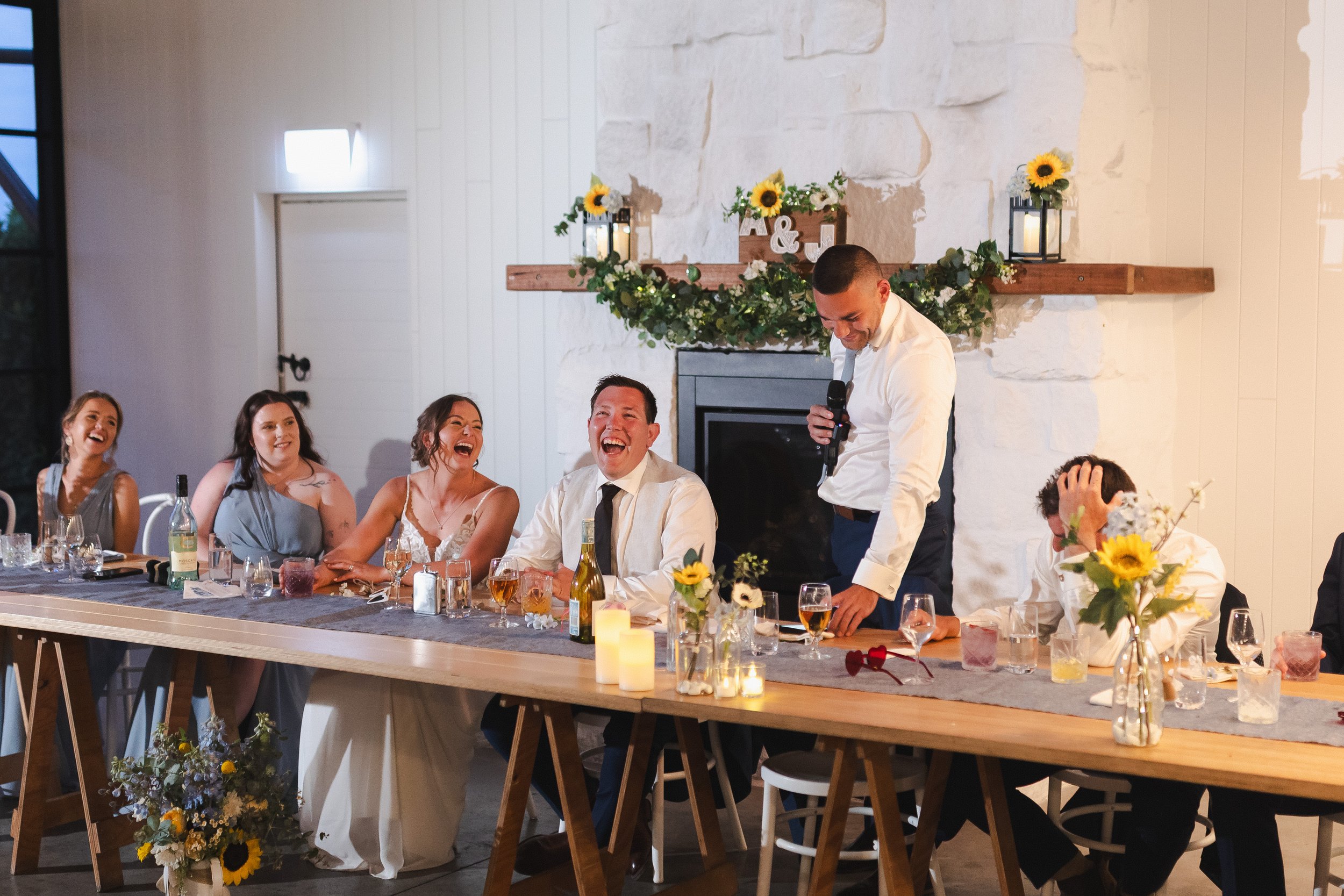 As soon as they were pronounced married, they were showered in confetti and walked back up the aisle hand in hand, grinning, laughing and completely wrapped up in the moment. The celebration flowed straight into cocktail hour, where guests mingled on the lawn while the newlyweds took portraits around the property, making the most of the Homestead’s rustic charm and open landscapes.