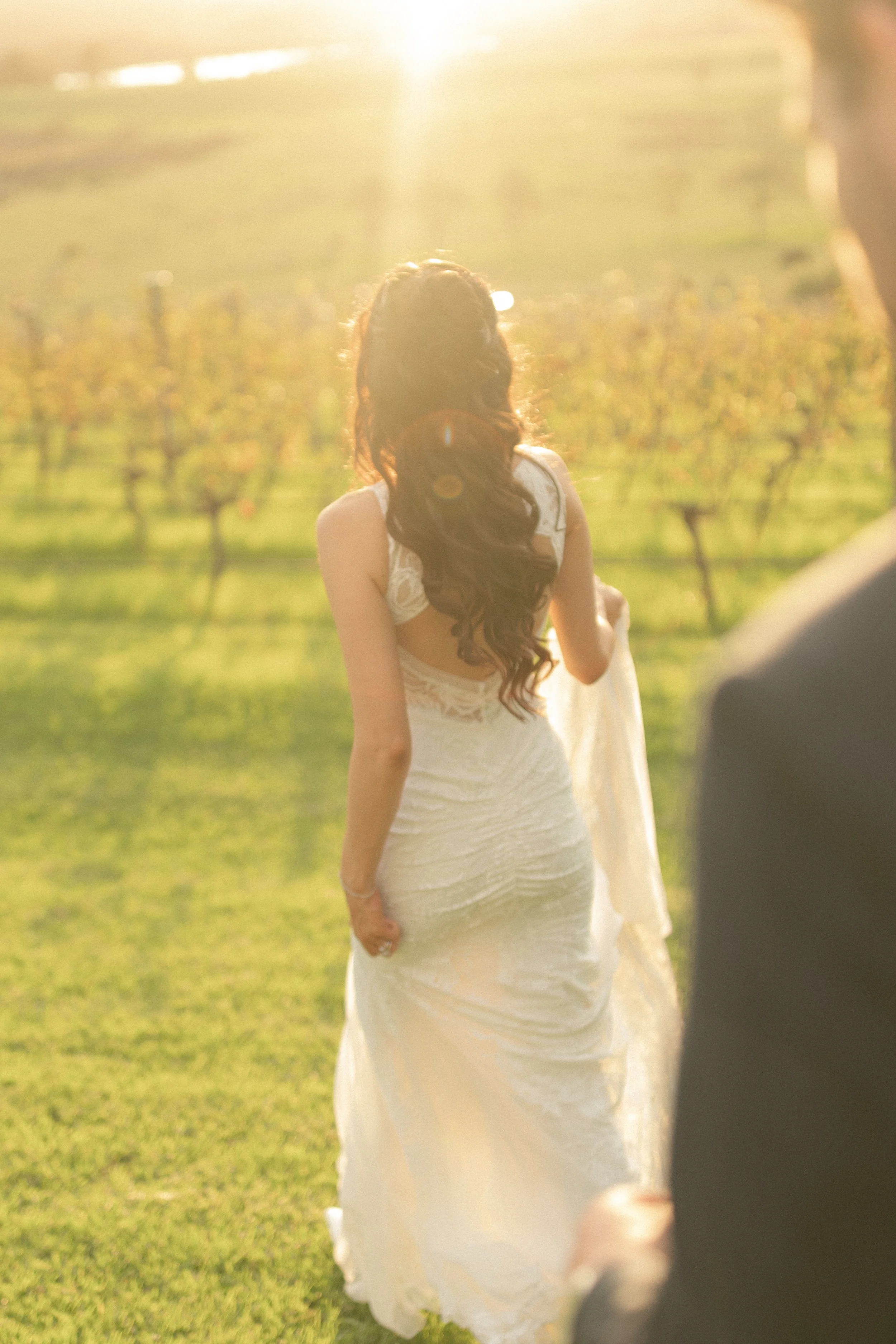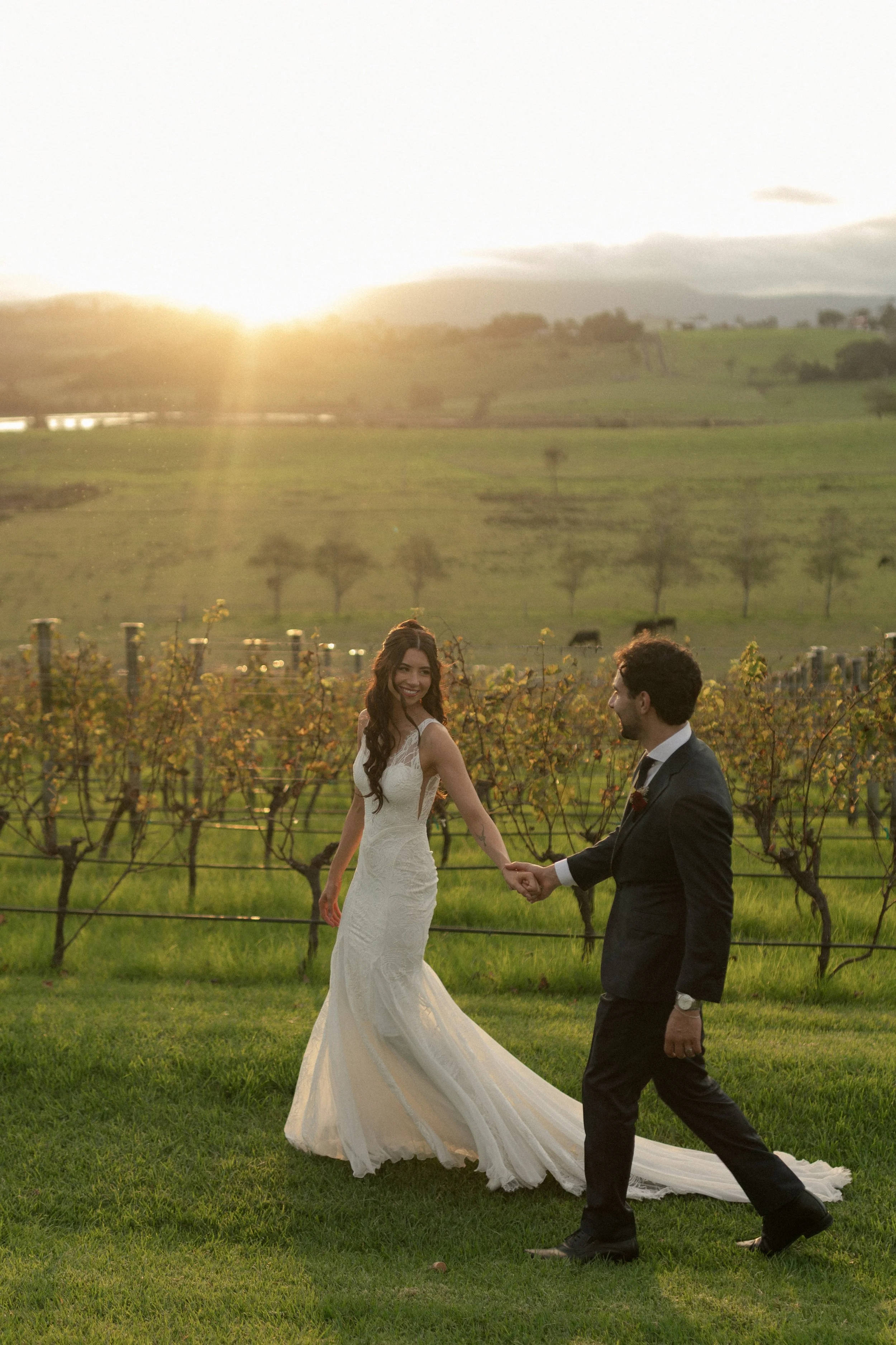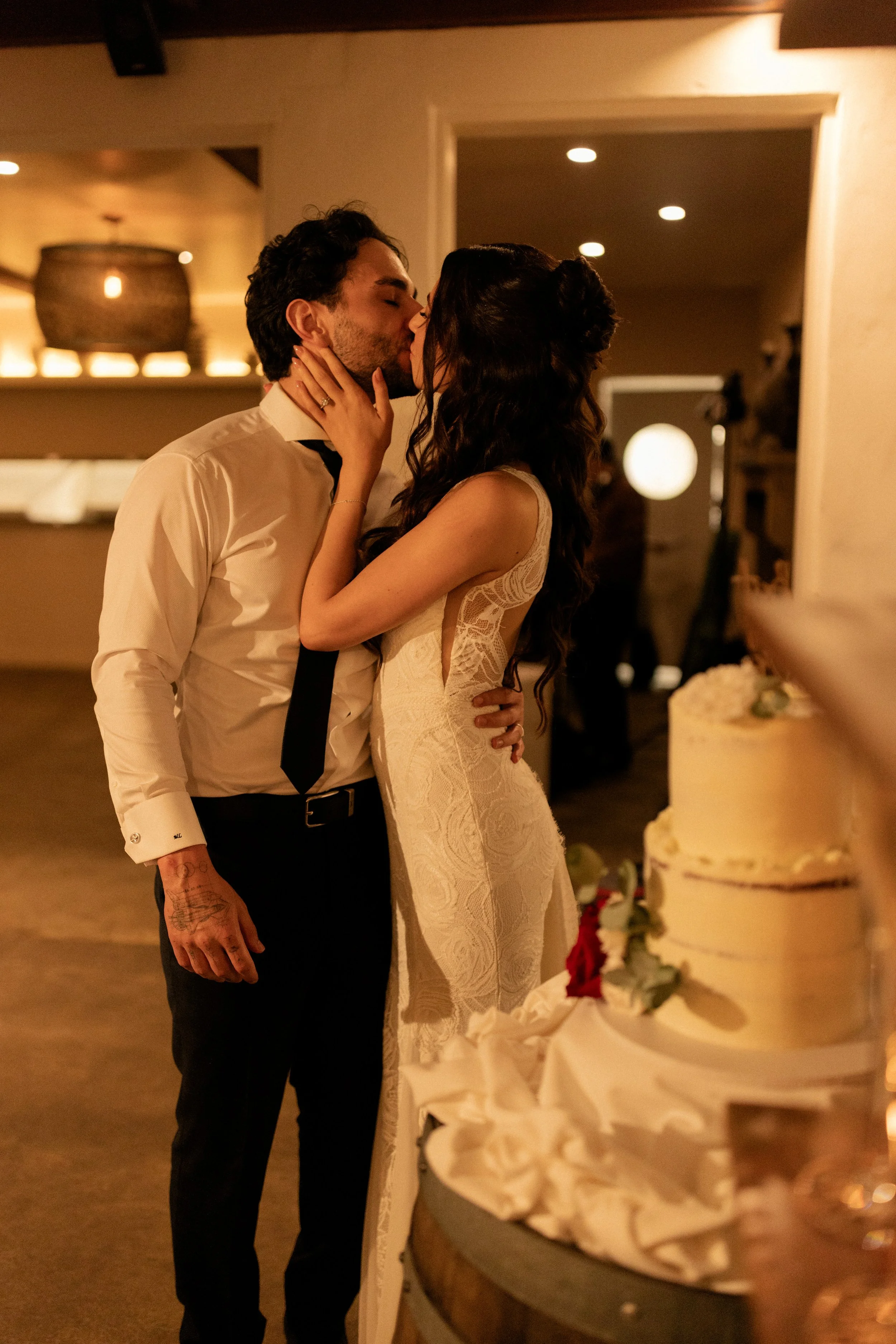 Following their “I do’s,” guests enjoyed the relaxed atmosphere with live music drifting through the winery grounds. The newlyweds wandered through the vineyard rows and around the cellar for their portraits, soaking in golden light and the natural beauty of the venue. It was the perfect blend of elegance and countryside charm, with every moment feeling effortlessly romantic.