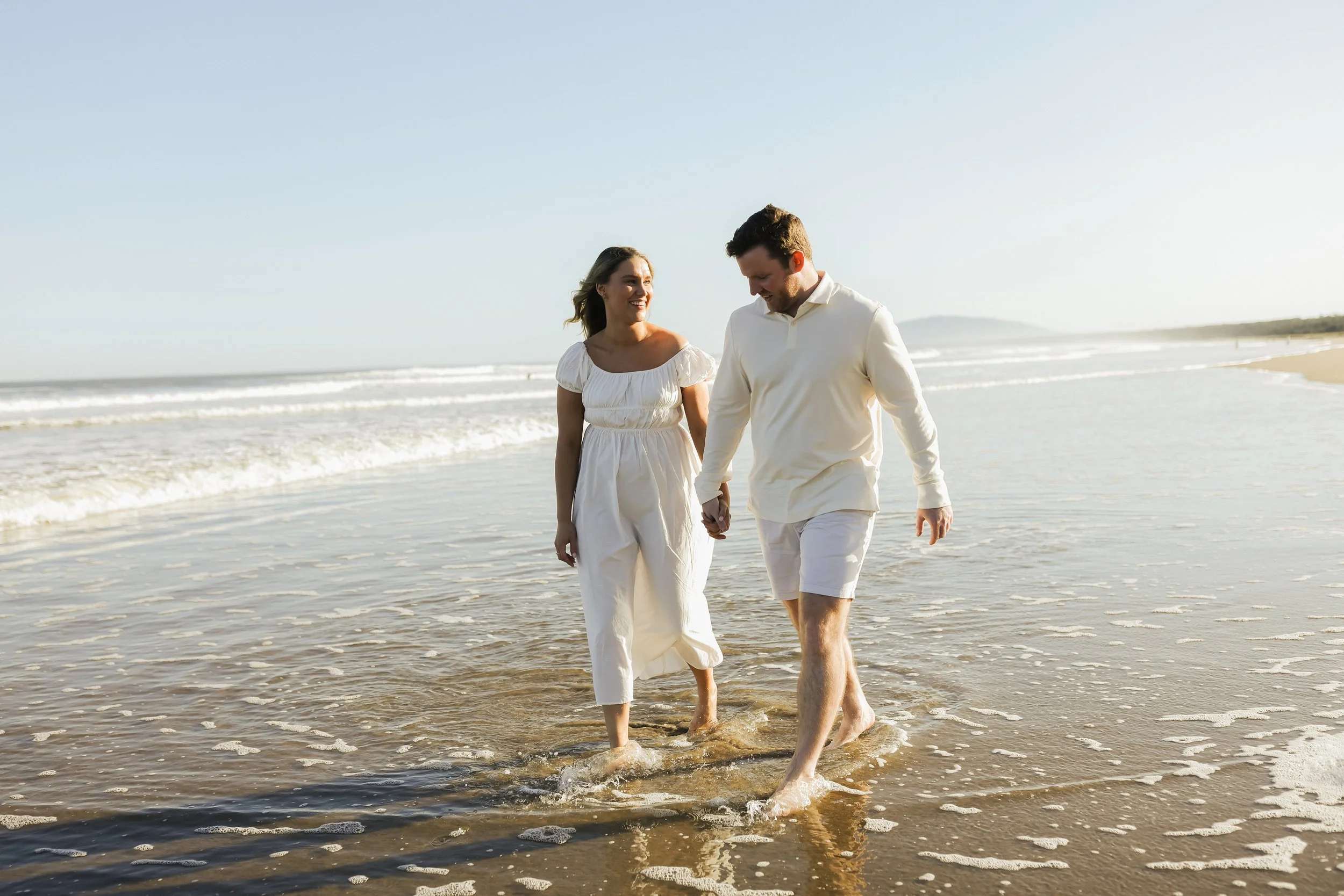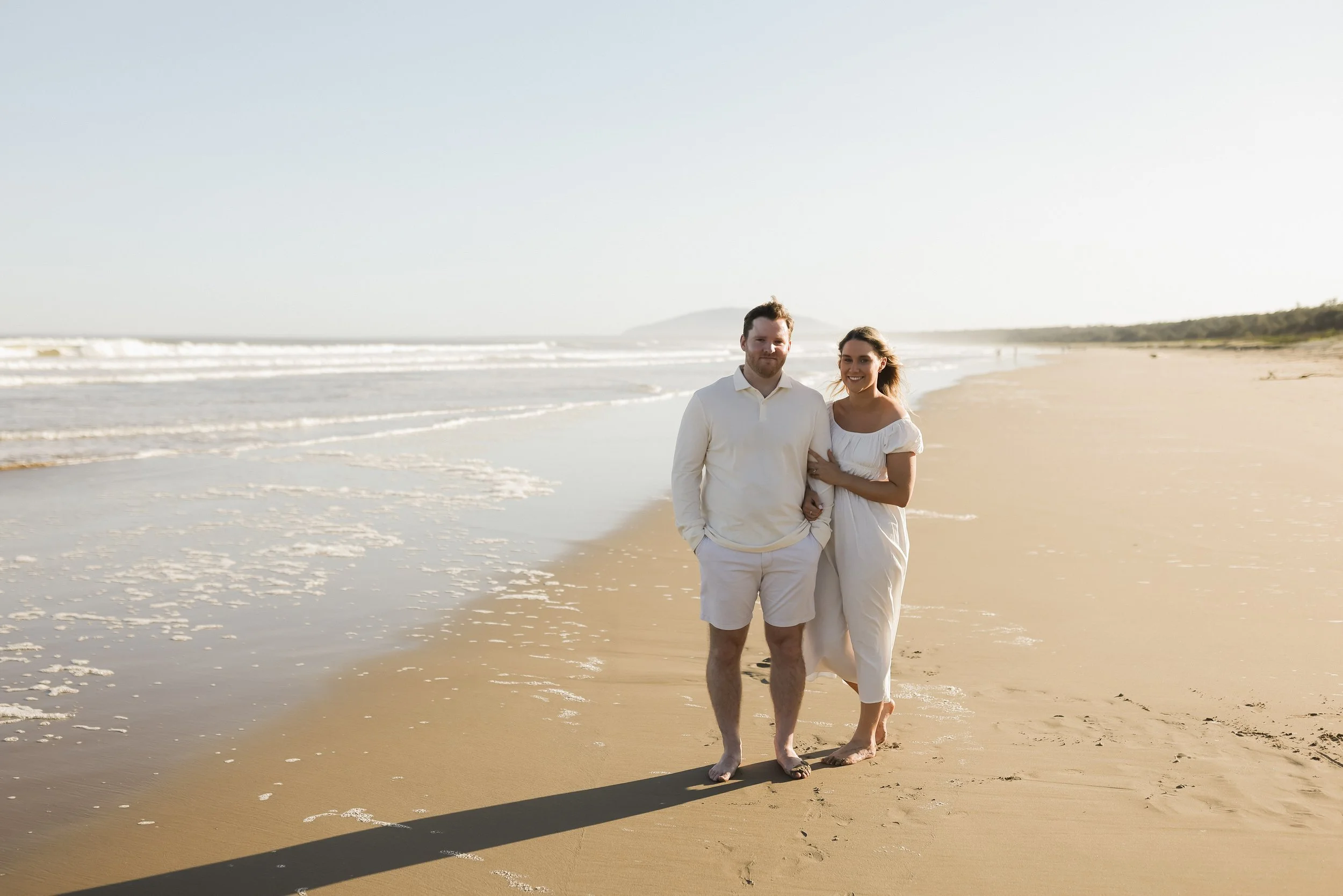 Lara and Arthur chose Seven Mile Beach in Gerroa for their engagement session, a relaxed contrast to their upcoming garden wedding. With its wide open shoreline and soft afternoon light, the beach made a simple, beautiful backdrop. The shoot felt easy and natural—just the two of them, taking a moment together before the busyness of wedding plans kicks in. It was a quiet, scenic setting that fit them perfectly.