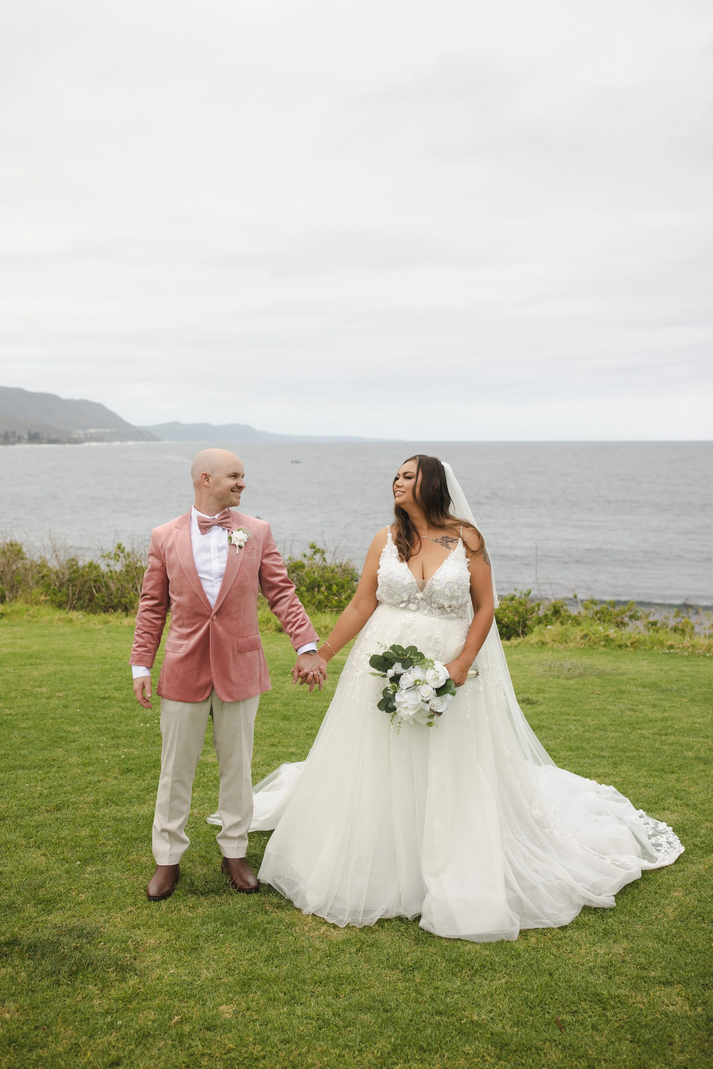 After saying their vows, the couple travelled to Sandon Point for portraits. With the ocean stretching out behind them and the coastal scenery glowing in the afternoon light, it was the ideal place to capture their joy.