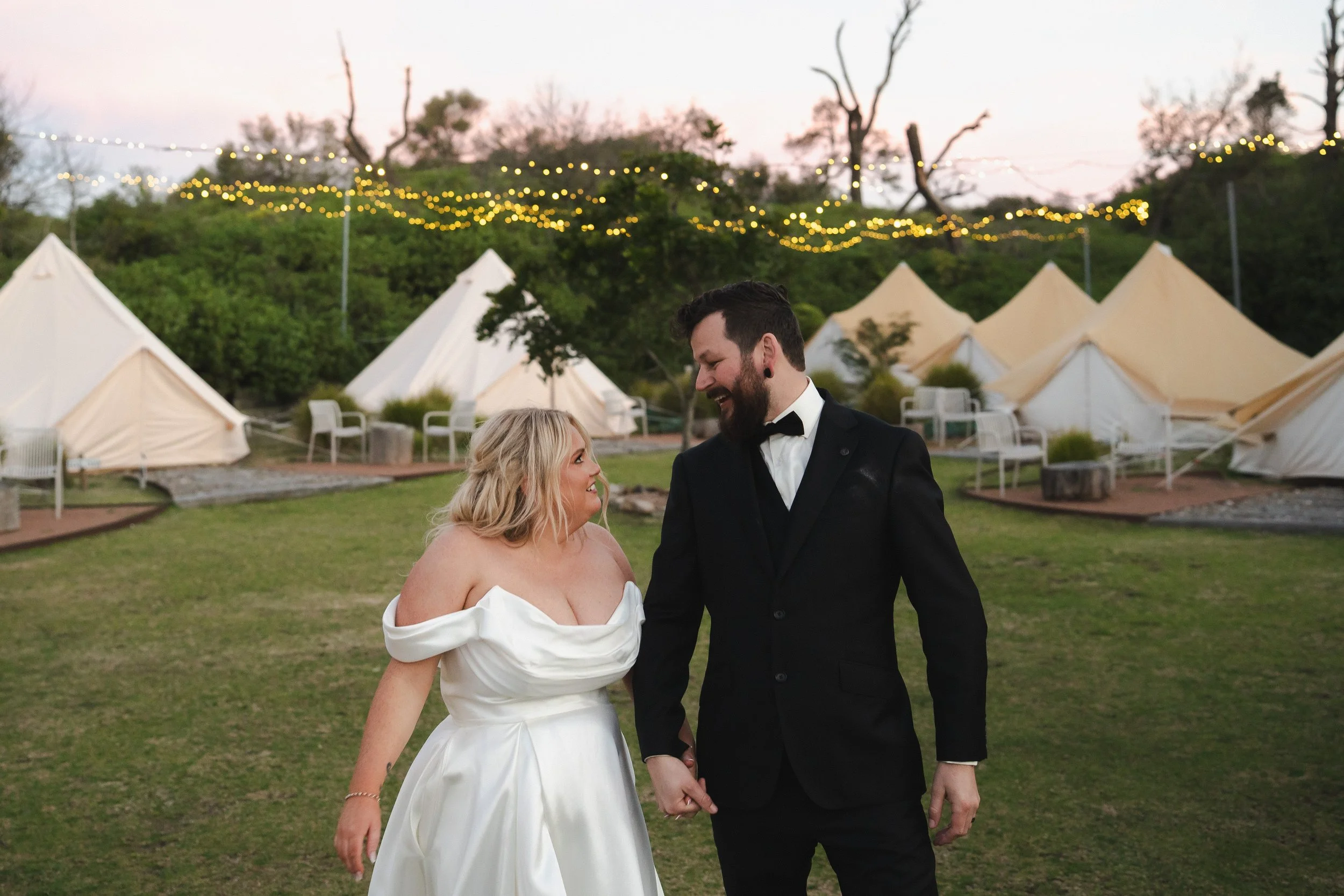 On the 23rd of September, Dylan and Hayley tied the knot at the enchanting Woods Farm, a luxury country retreat nestled on 40 acres just minutes from the sparkling waters of Jervis Bay. This unique venue offered the perfect blend of rustic charm and modern comfort, allowing all their family and friends to stay together on site. With eight beautifully styled country cabins and lots of cozy glamping tents, everyone could fully immerse themselves in the celebration.