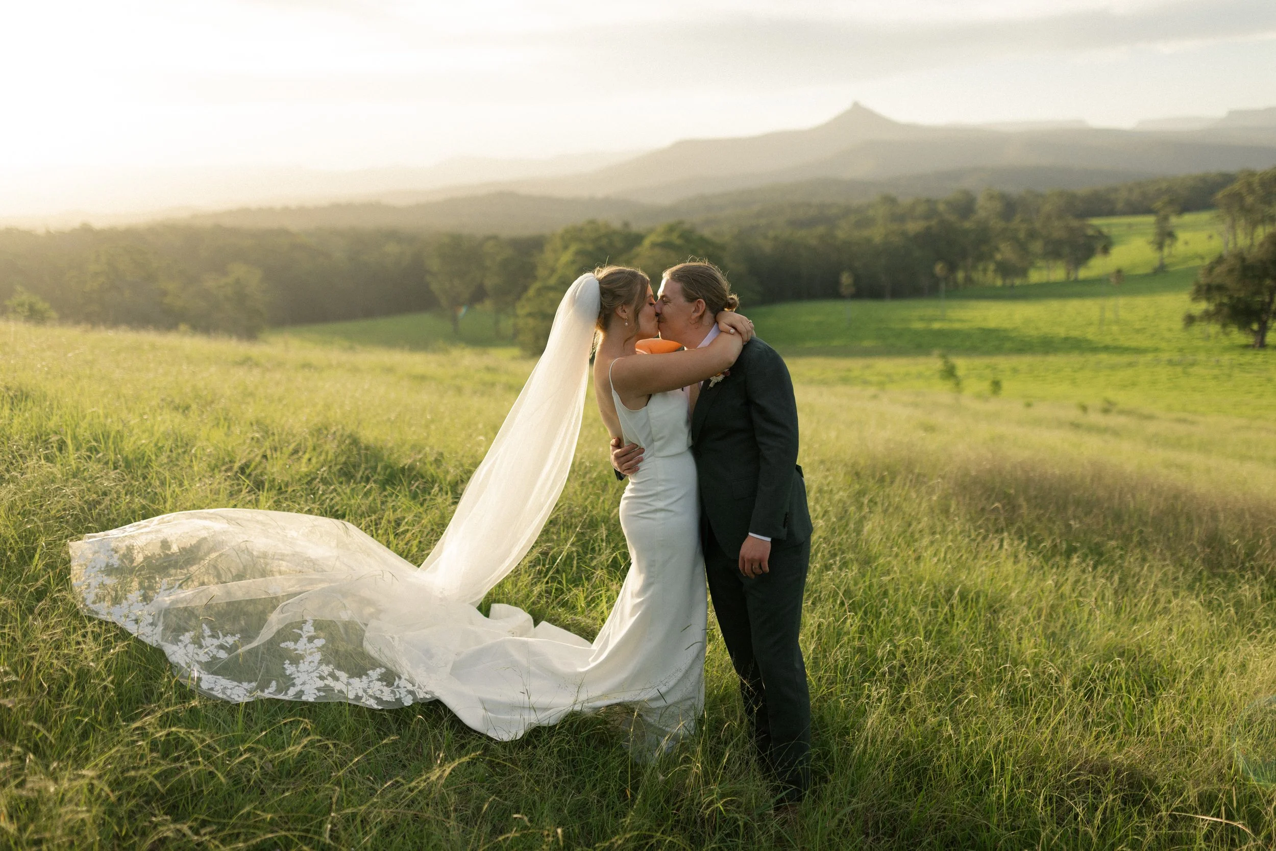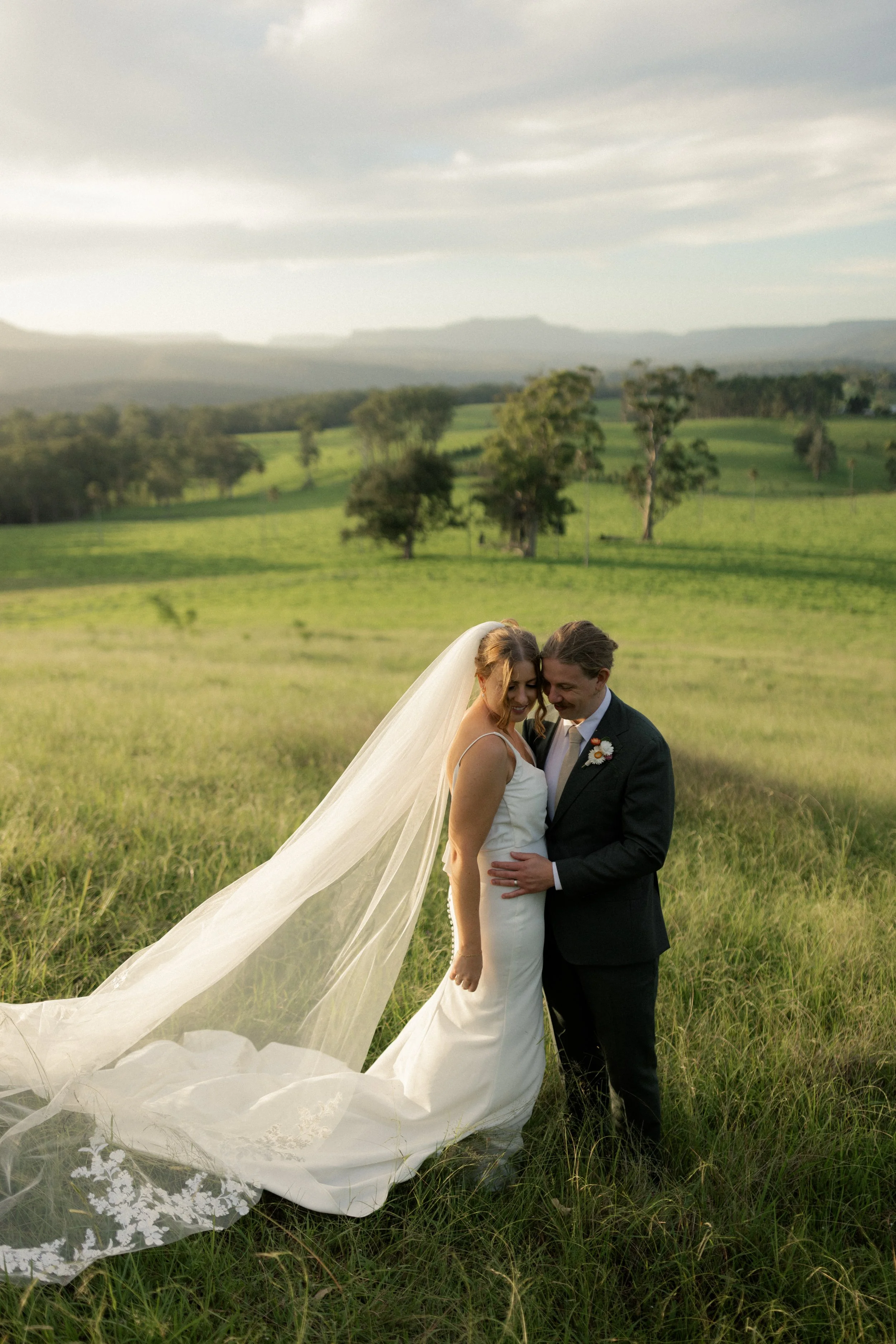 Following the ceremony, guests enjoyed drinks and canapés on the deck overlooking the valley while the newlyweds slipped away for portraits. The evening delivered an incredible sunset, creating the perfect golden light for their portrait session and giving Gabrielle and Samuel a quiet moment together to soak in the day.
