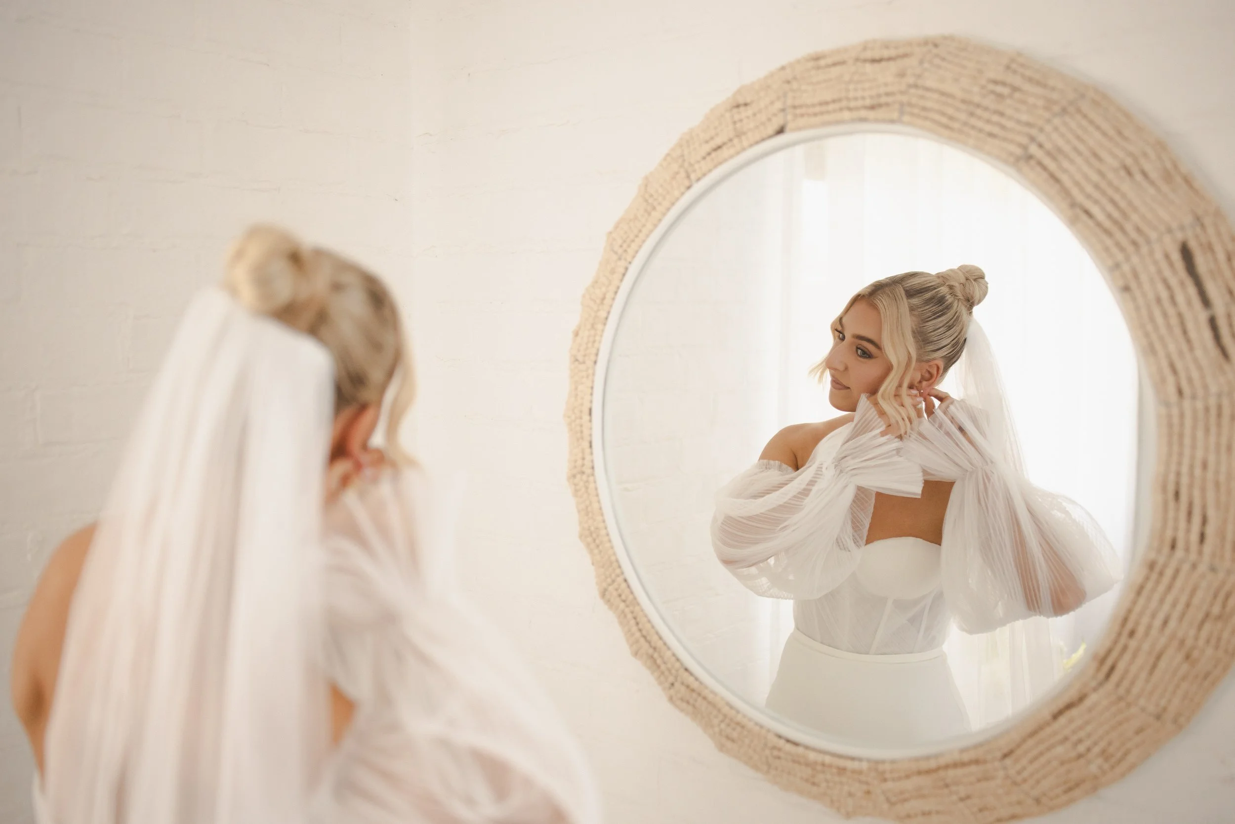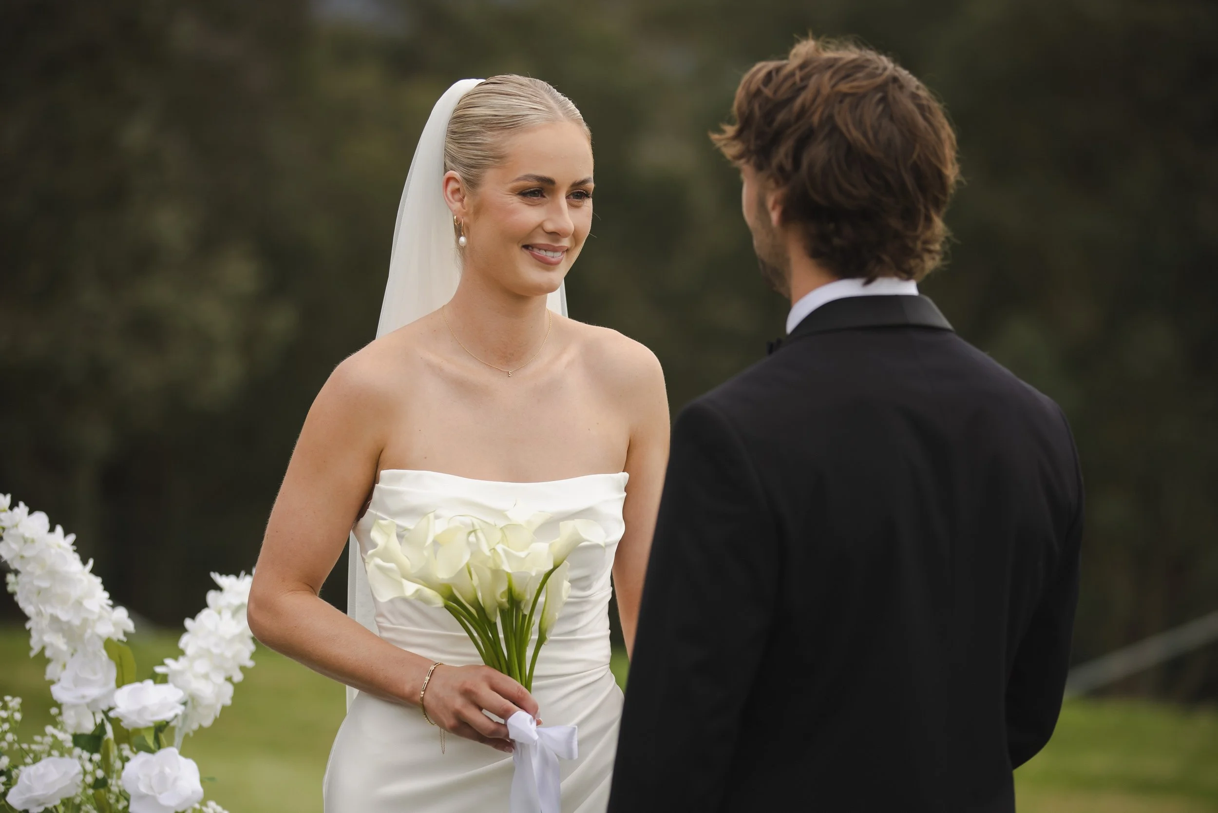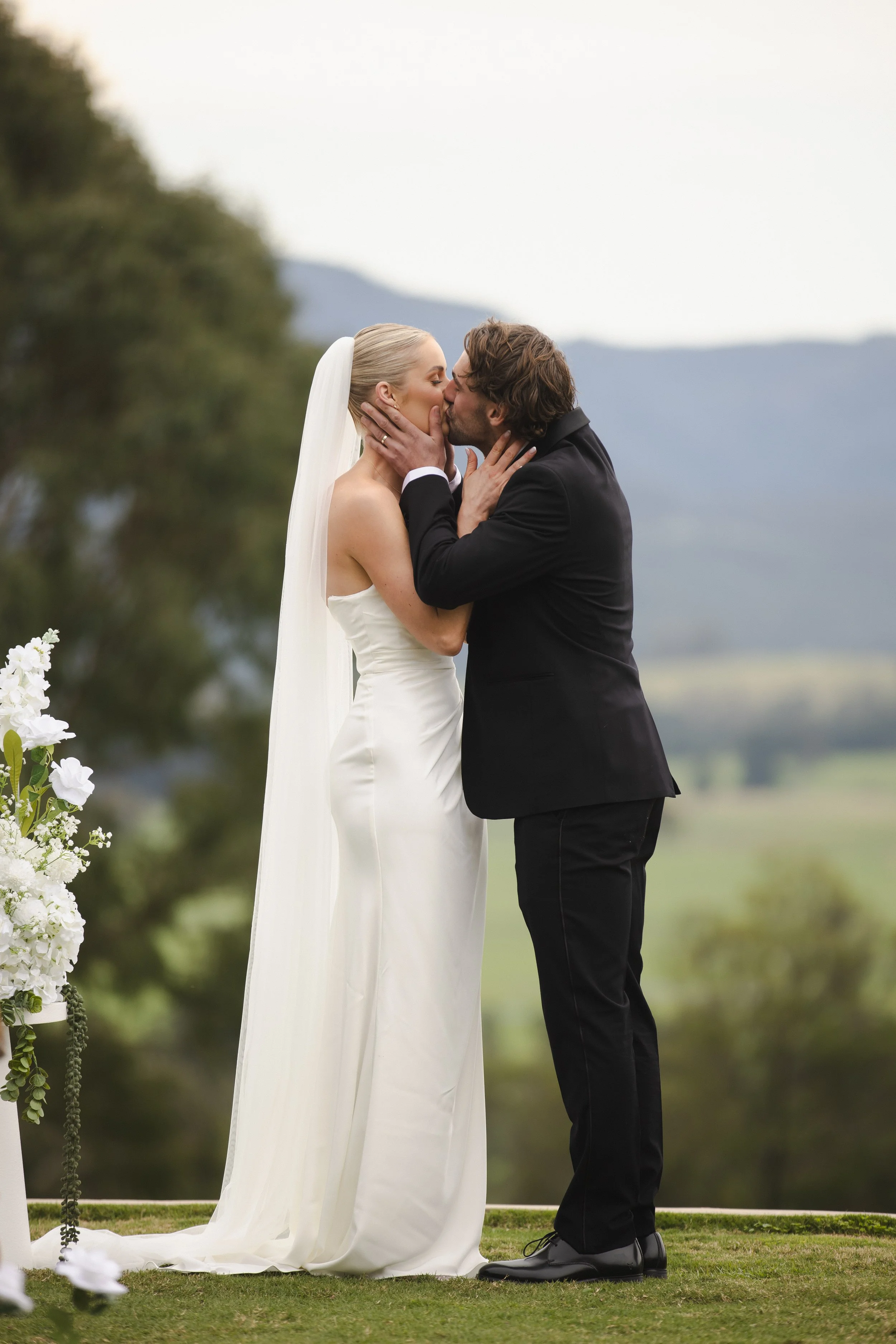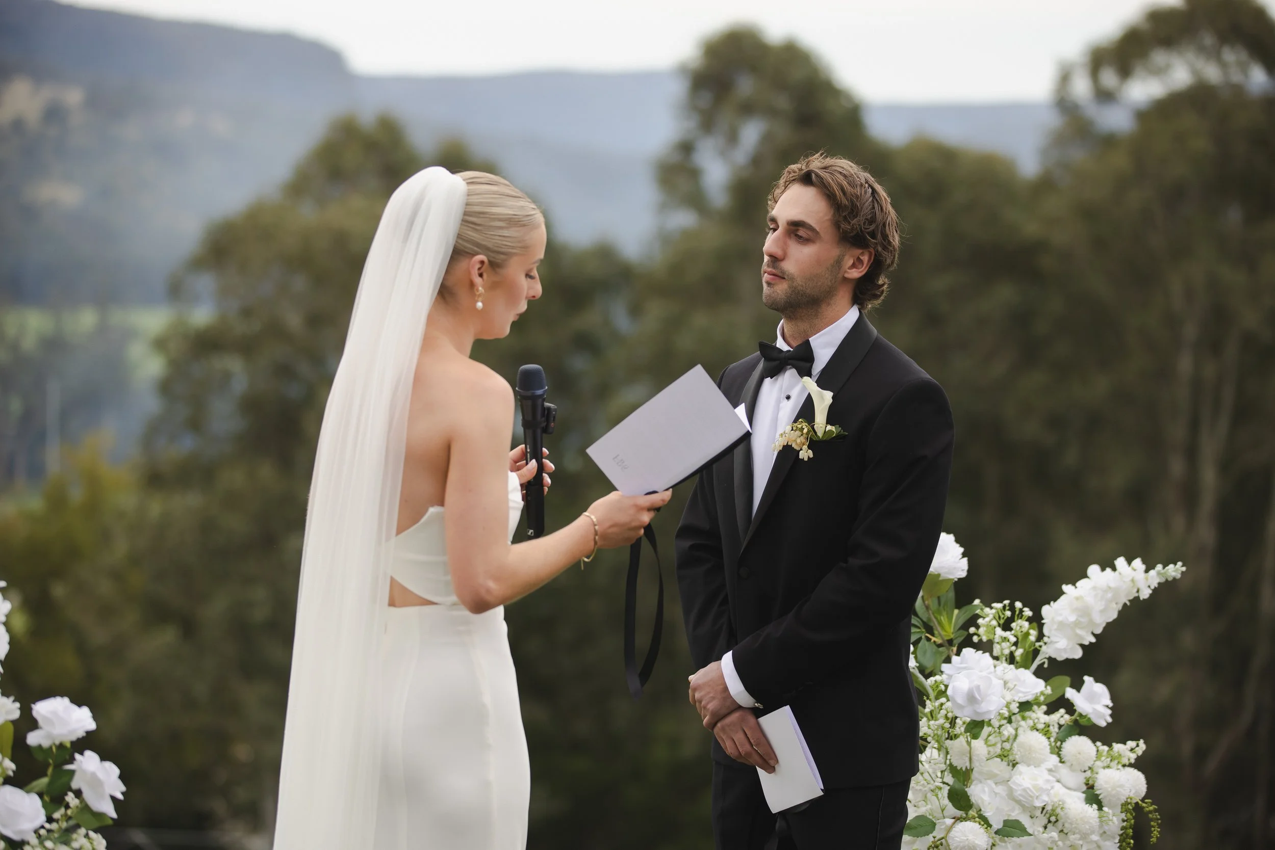 Their ceremony took place in the whimsical bush chapel, a breathtaking setting adorned with floor-to-ceiling vintage mirrors, glittering chandeliers, and a stunning pathway lined with arbours. Dylan and Hayley exchanged heartfelt, personally written vows, taking everyone on a touching walk down memory lane.