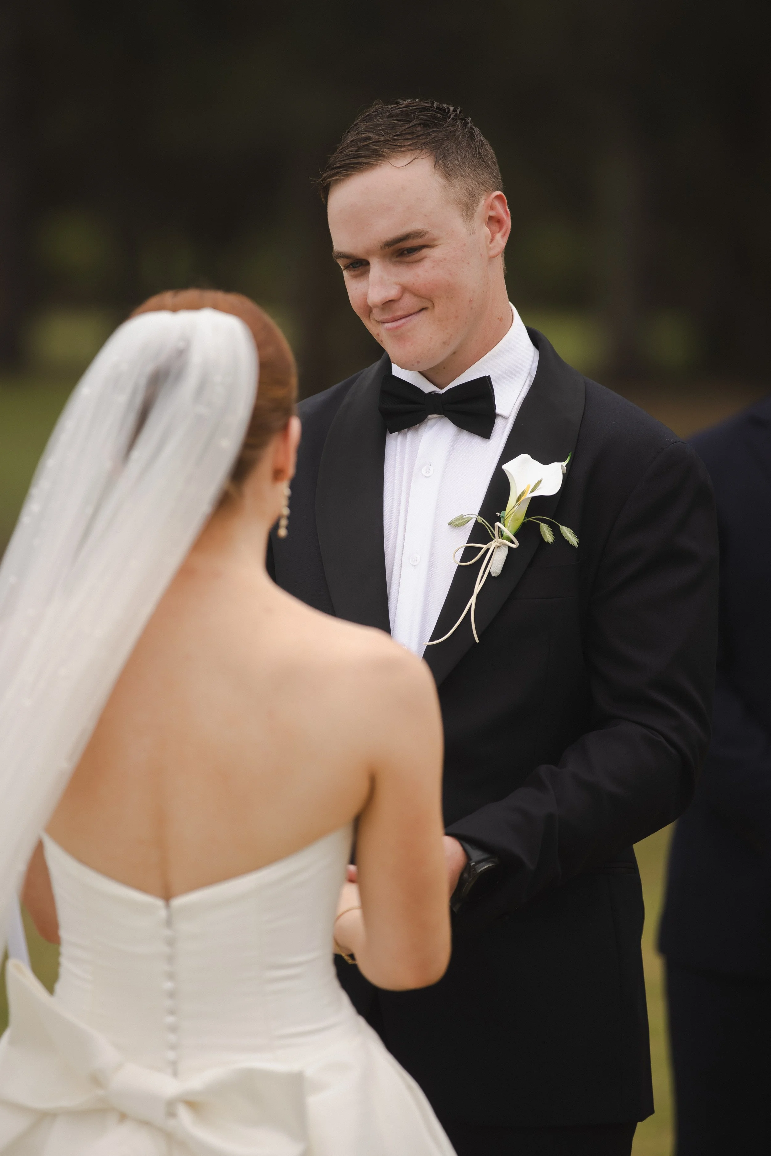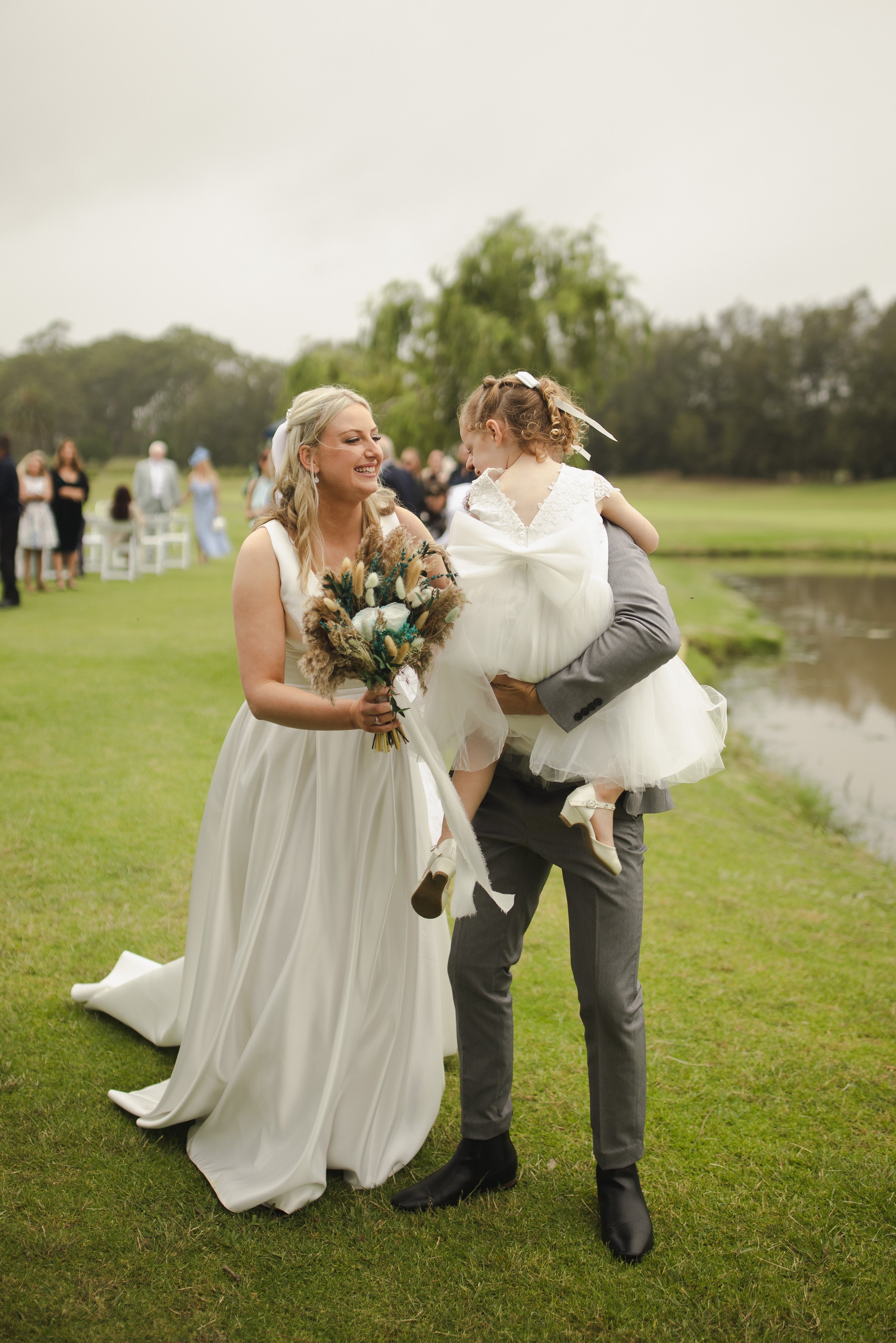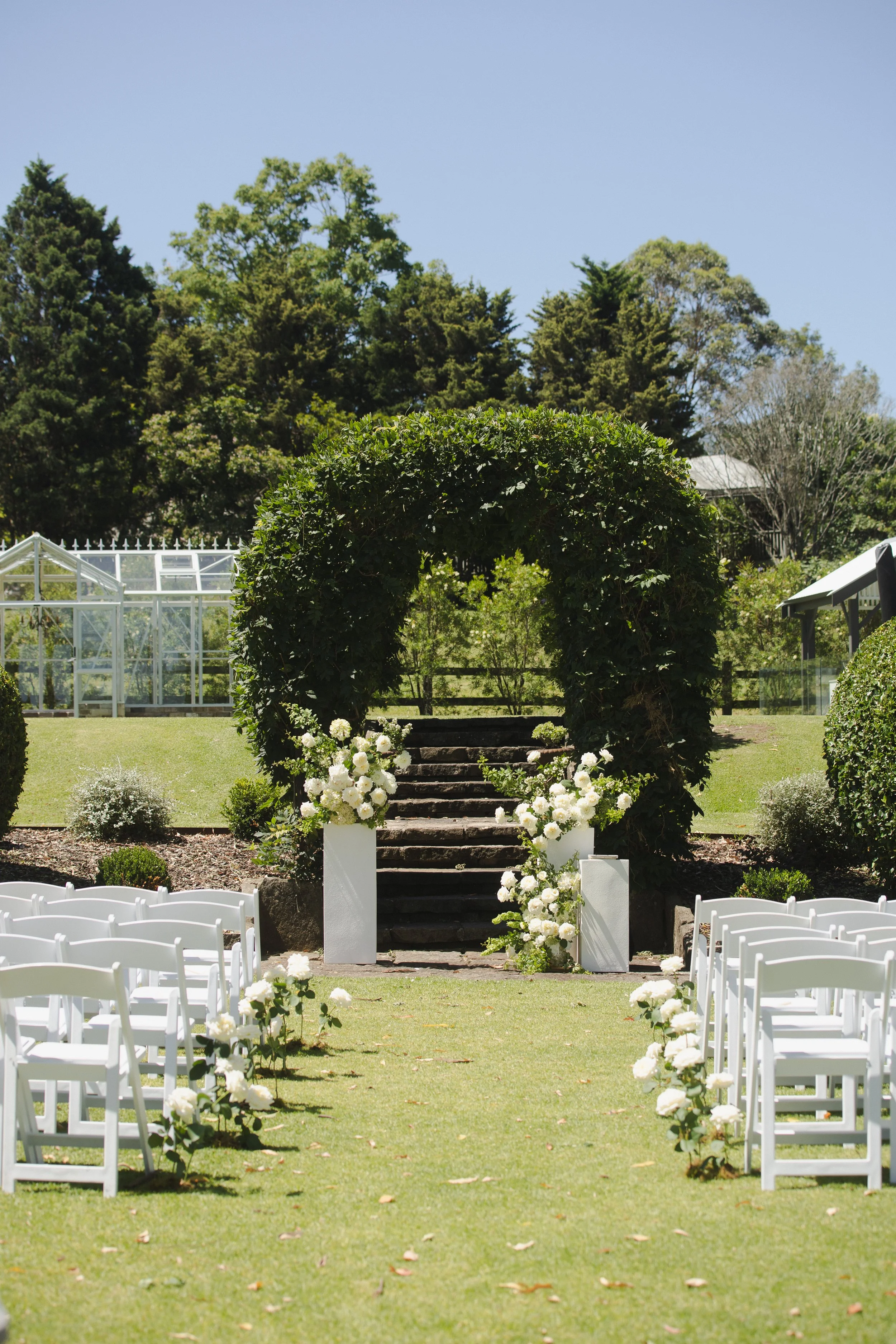 Rachel got ready in the Dairy on the property, sharing a special first look with her dad before heading to the ceremony. They were married outside the Homestead, surrounded by the gardens and all their favourite people.