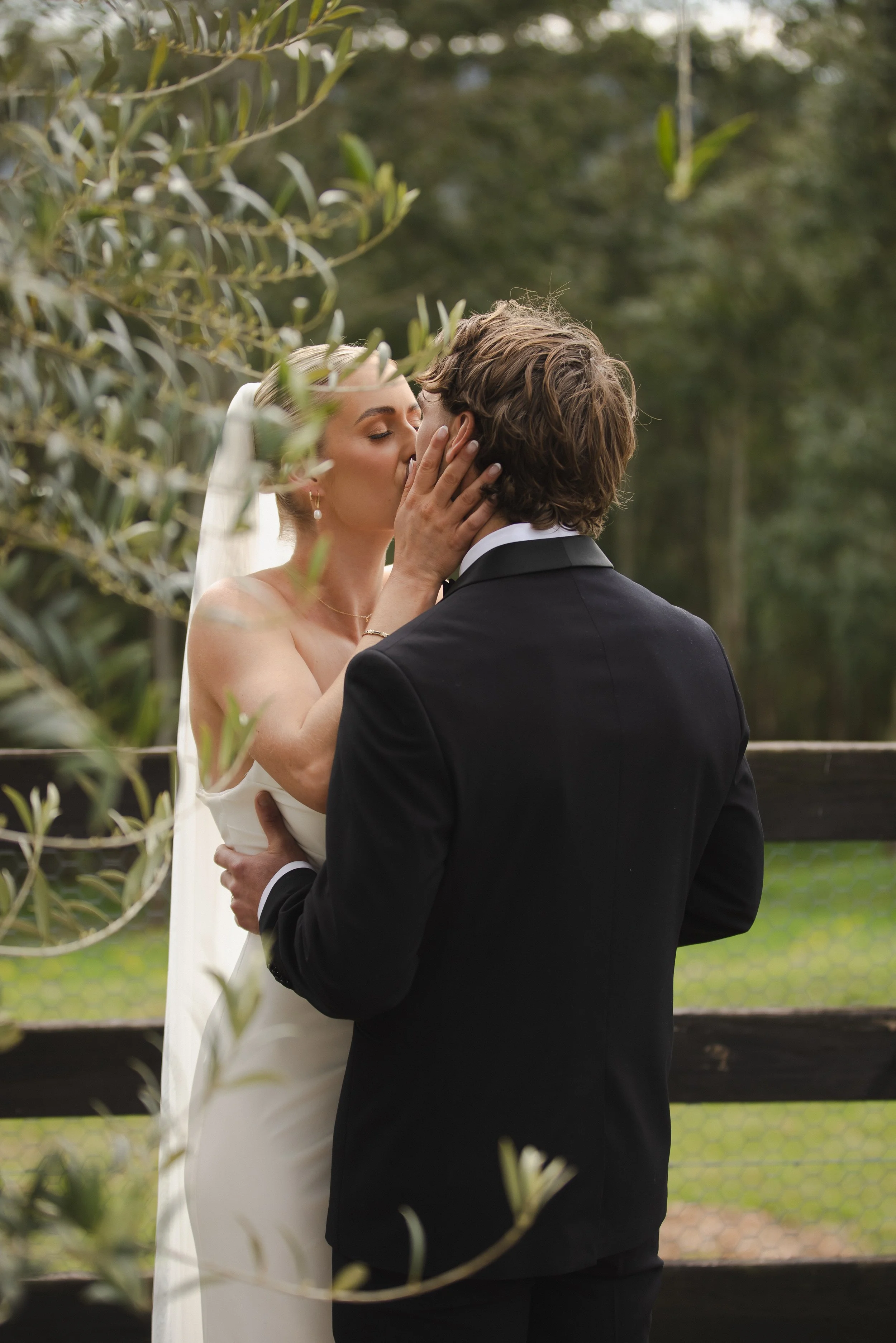 The estate was adorned with beautiful native florals that complemented the rustic elegance of the homestead. Before the ceremony, Andrew and Maddie shared an intimate first look, a quiet, emotional moment captured among the trees and golden light. Their pre-ceremony portraits were nothing short of magical.