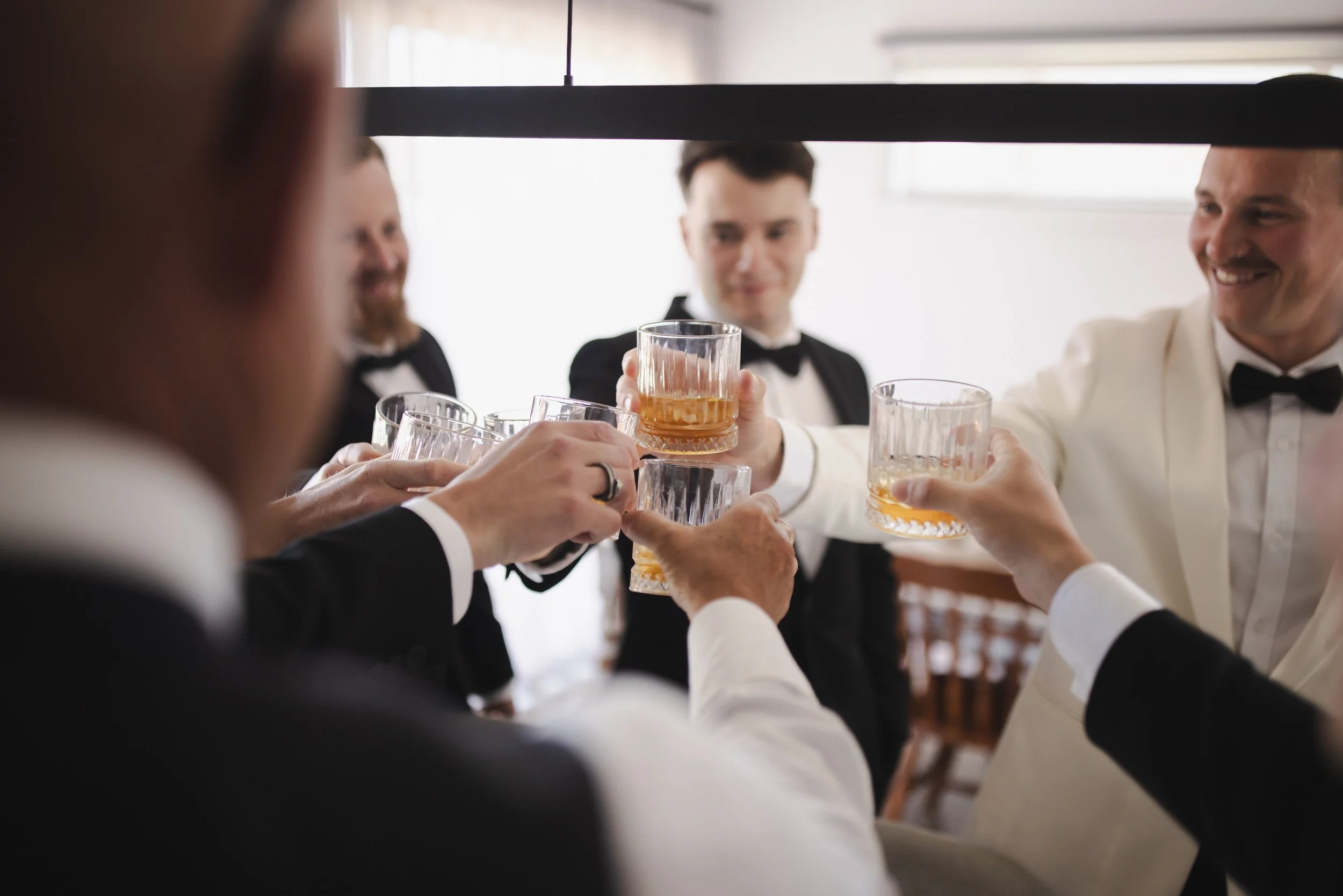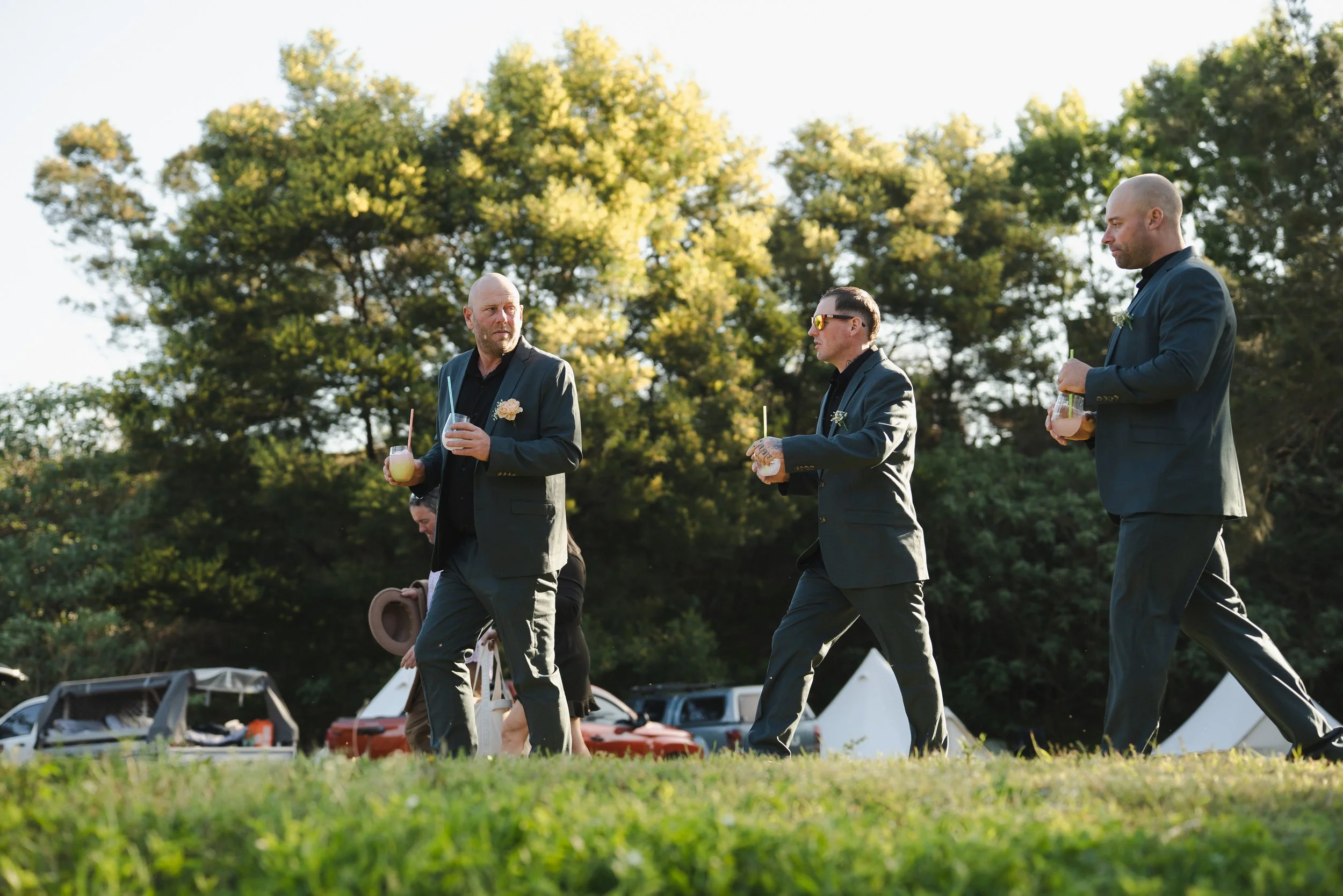 The wedding morning kicked off with a festival-inspired breakfast in the glamping area. Hayley and her bridesmaids prepared for the big day in the stunning Lakehouse, surrounded by laughter, champagne, and a beautiful first look. Meanwhile, Dylan and his groomsmen got ready in the cozy Hen House, sharing pre-ceremony drinks to calm their nerves.