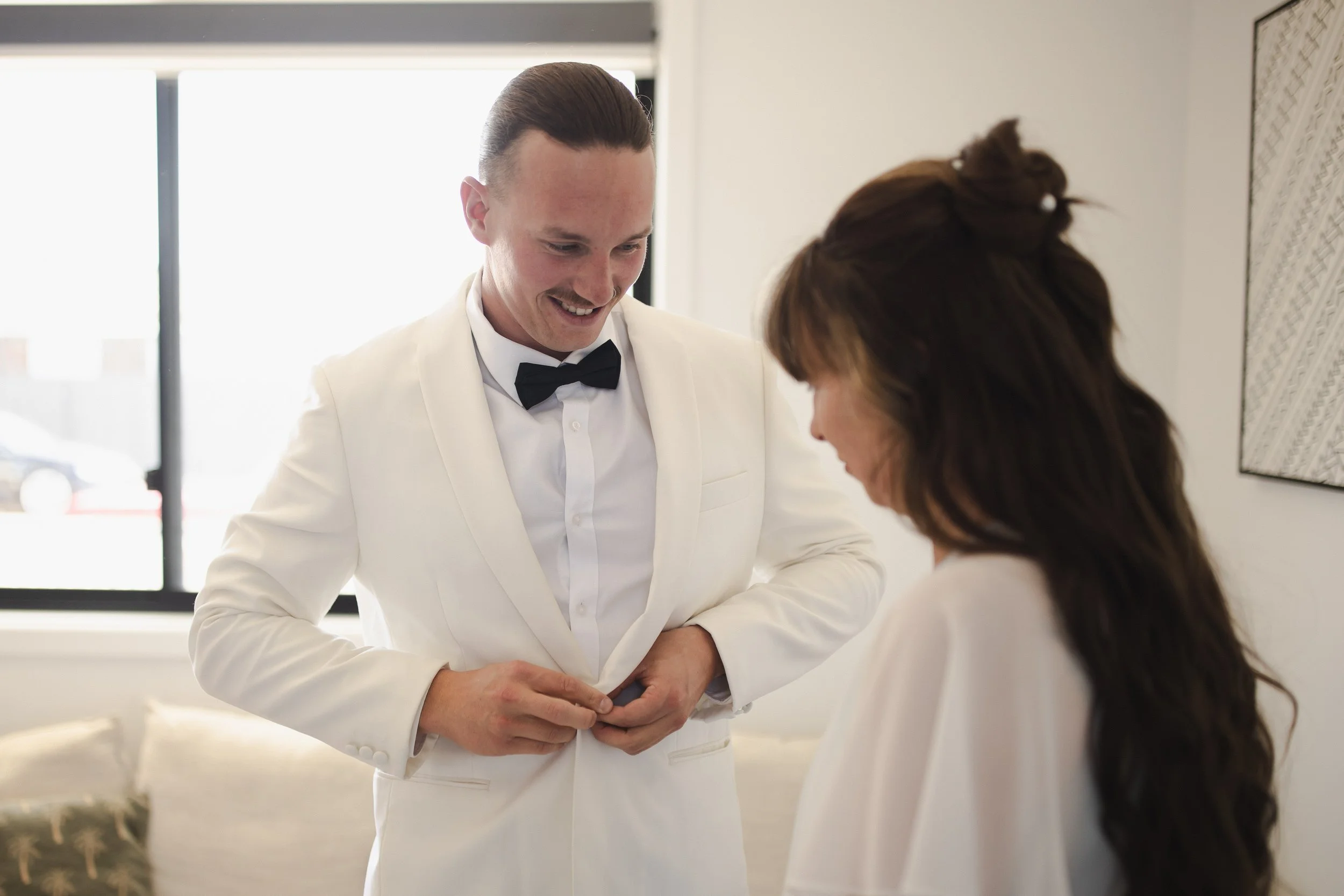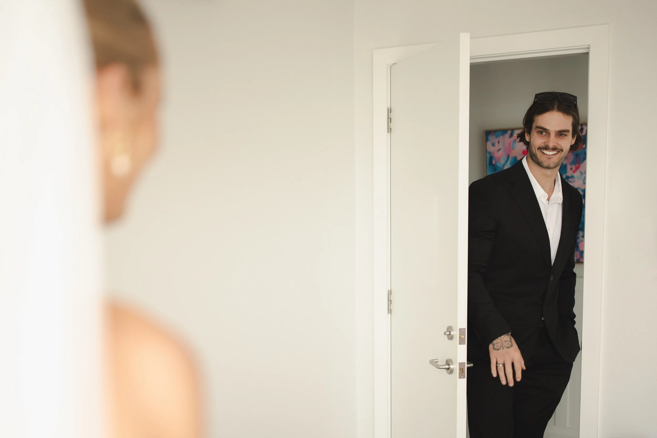 The day began with laughter and excitement as the girls got ready in matching blue PJs in the cozy Ocean Cabin, while the boys got into wedding mode over at the aptly-named Fun House. With the sun shining and the salty breeze setting the scene, guests gathered on the sand to witness Aaron and Carly’s heartfelt vows with the ocean as their backdrop.