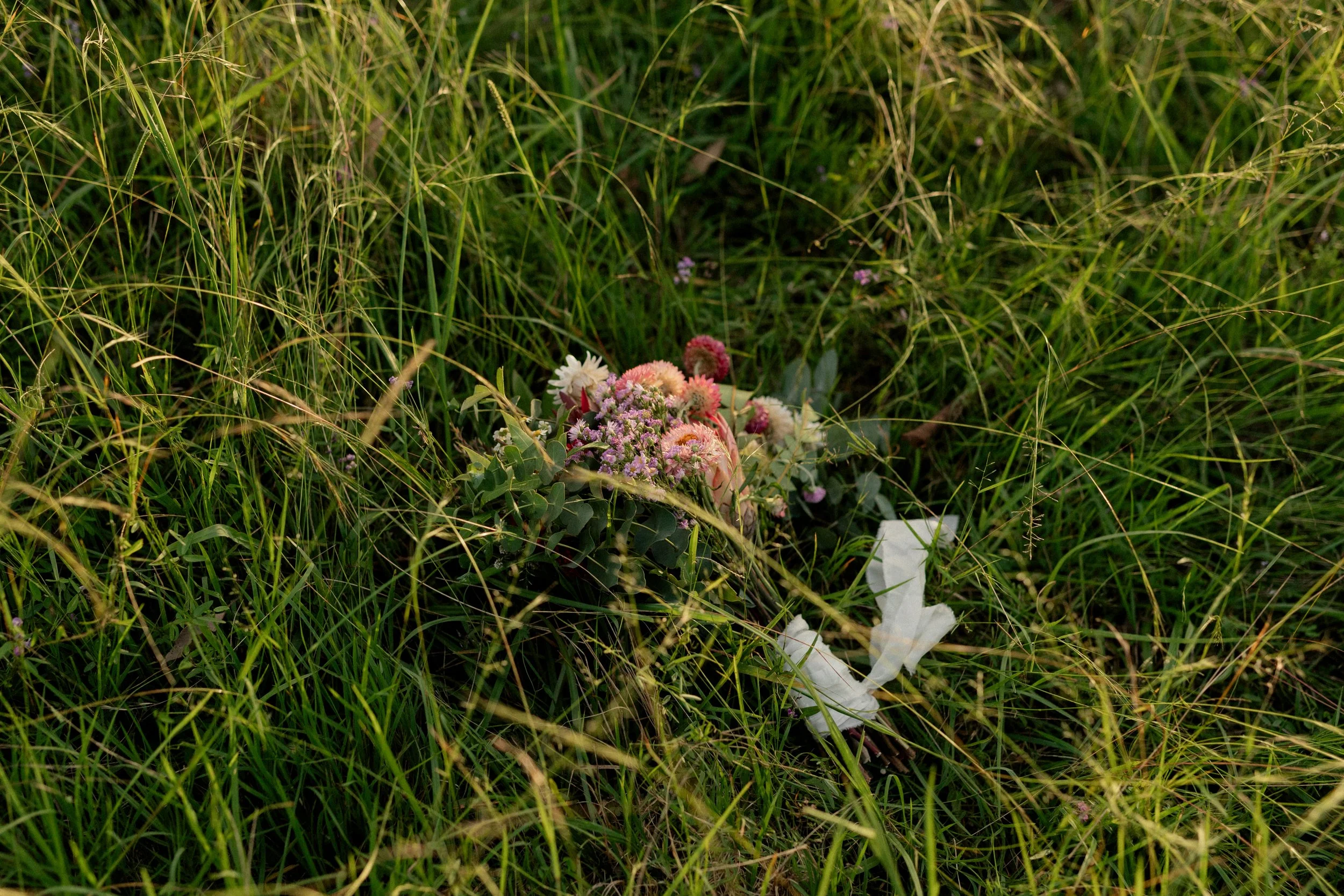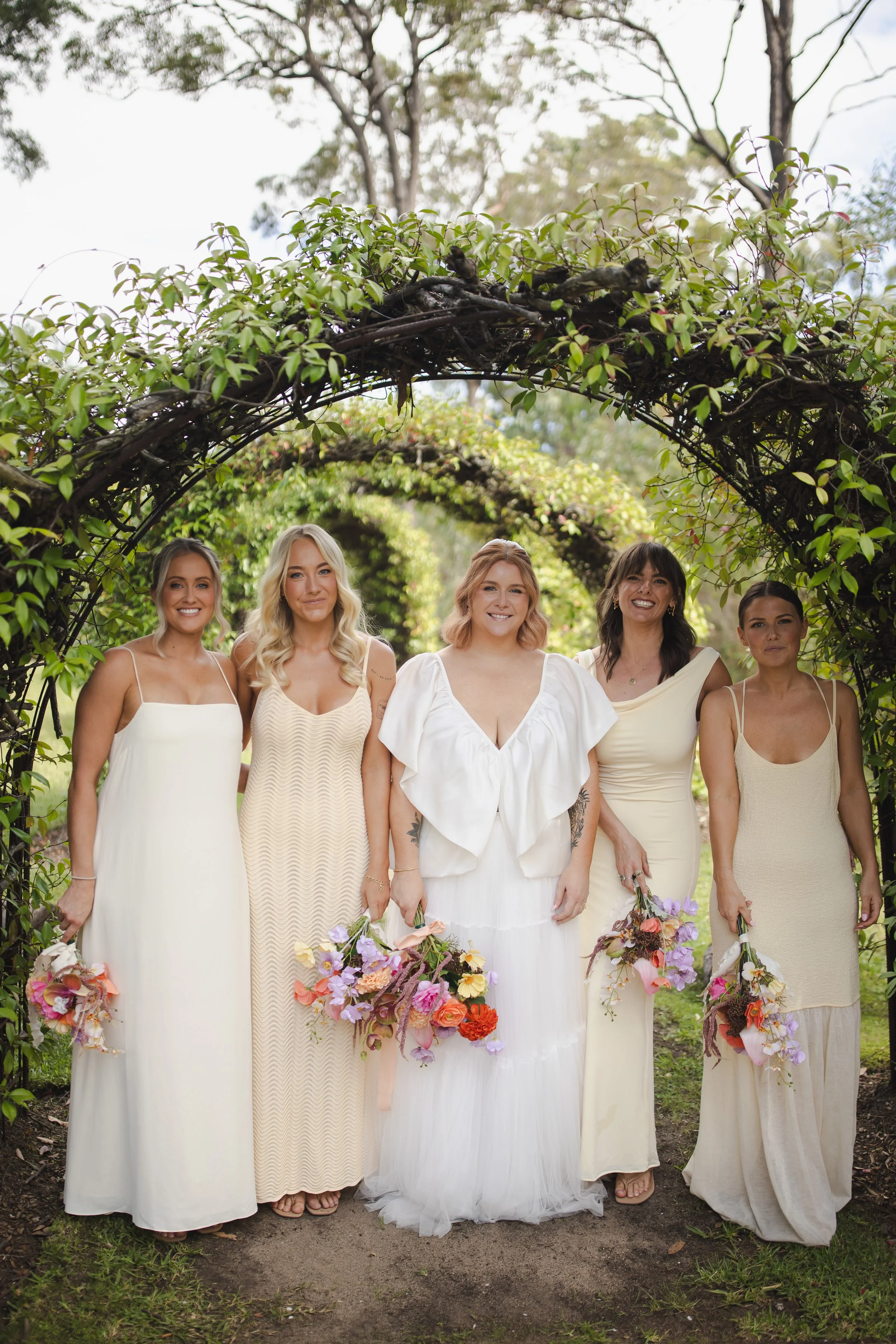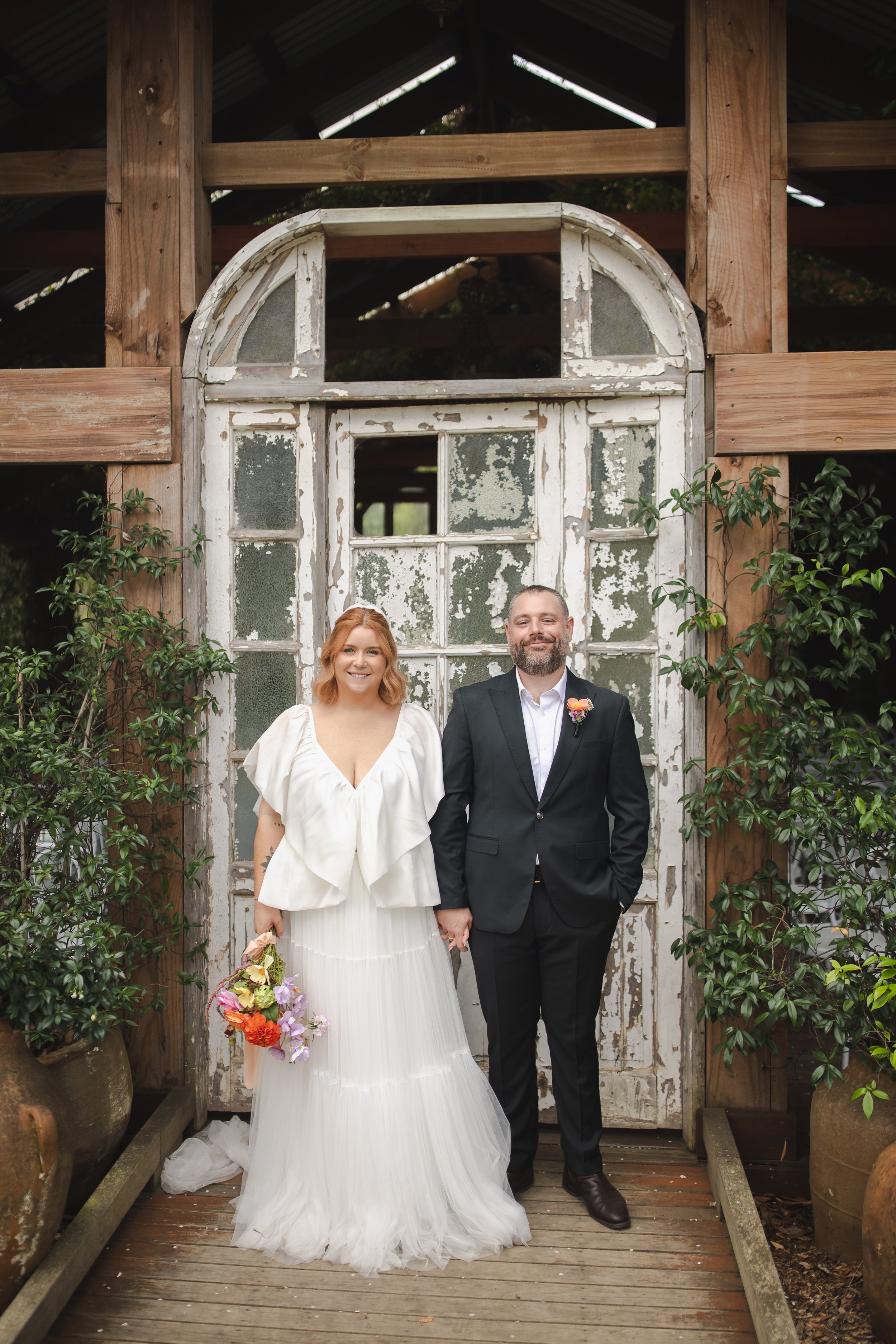 Their ceremony took place in a rustic bush chapel, where colourful, bright florals brought a fresh and playful energy to the natural setting. It was heartfelt and intimate, with the bushland creating a peaceful backdrop as they said their vows.