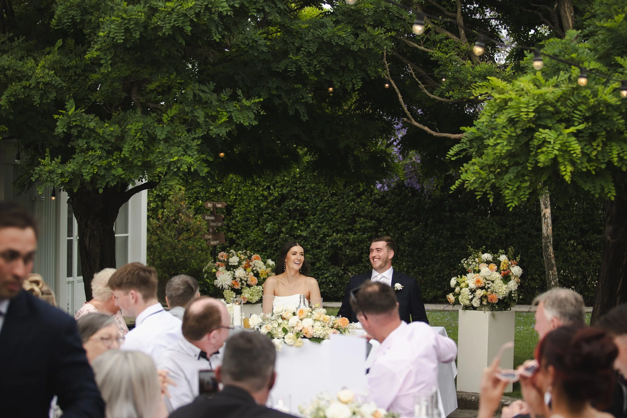 Figbird in Terara provided the perfect backdrop for the day. Their garden was the dream setting for an outdoor ceremony, with views stretching over country fields and a soft breeze floating through the trees. After vows were shared and rings exchanged, the celebrations kicked off with a champagne tower and cocktail hour out on the lawn.
