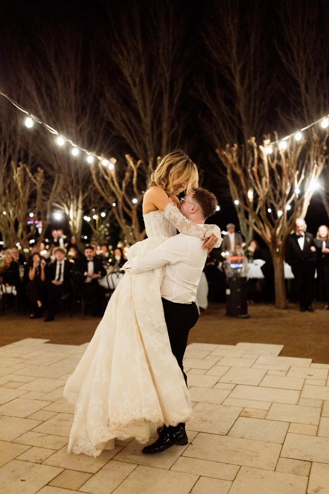Following the heartfelt "I dos," guests enjoyed courtyard drinks under the soft shade of trees, with laughter echoing through the historic grounds. As the sun began to set, the celebration moved to the reception area nestled beneath the crepe myrtles. The space was styled with a refined, modern touch. The styling was simple yet striking and the details reflected the couple’s timeless taste.