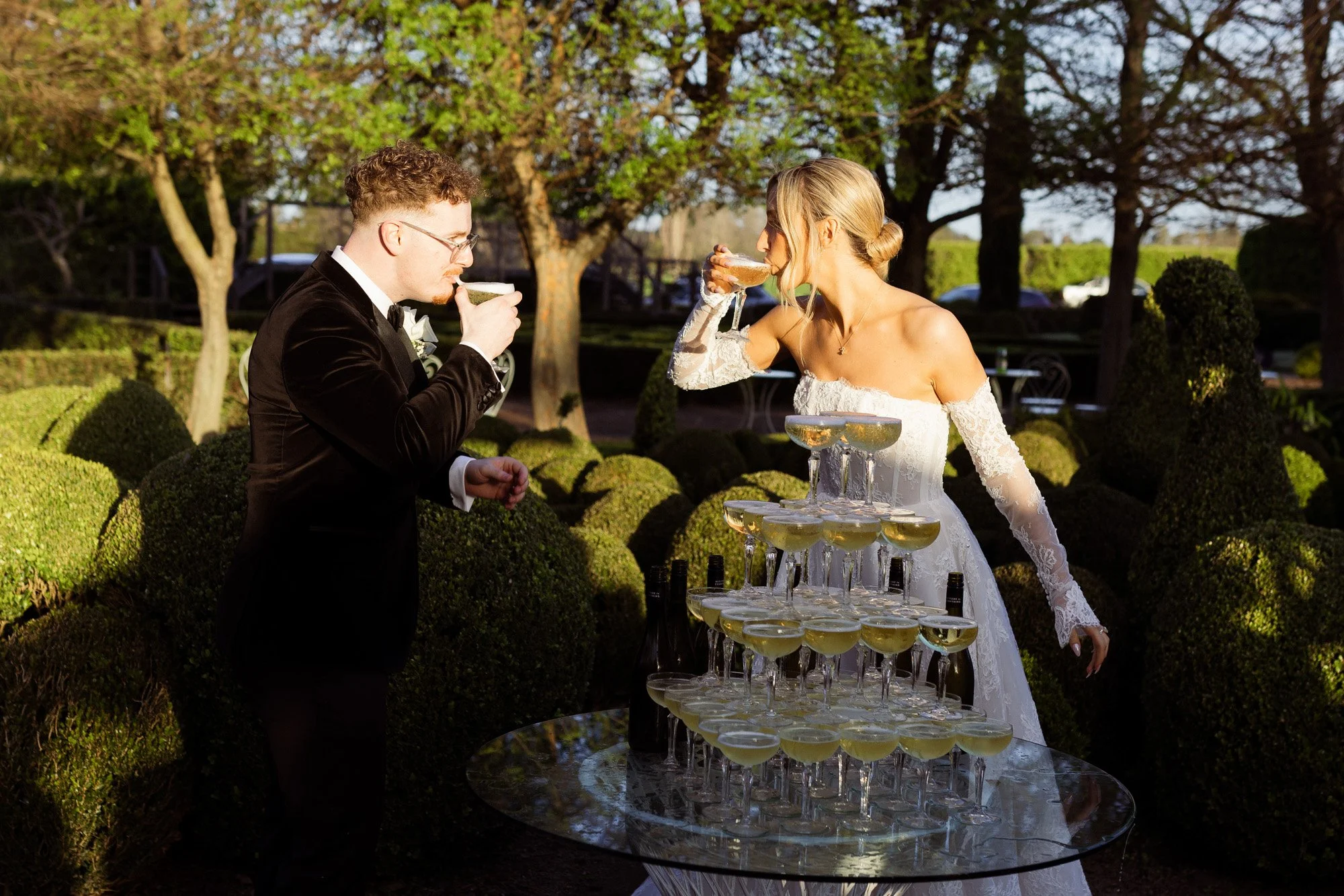 Kicking off the celebrations, guests were treated to a classic champagne tower, a touch of vintage glamour that set the tone for the rest of the evening. As golden hour approached, Rhiannon and Micah stole a few quiet moments together, captured in breathtaking portraits by the sea.
