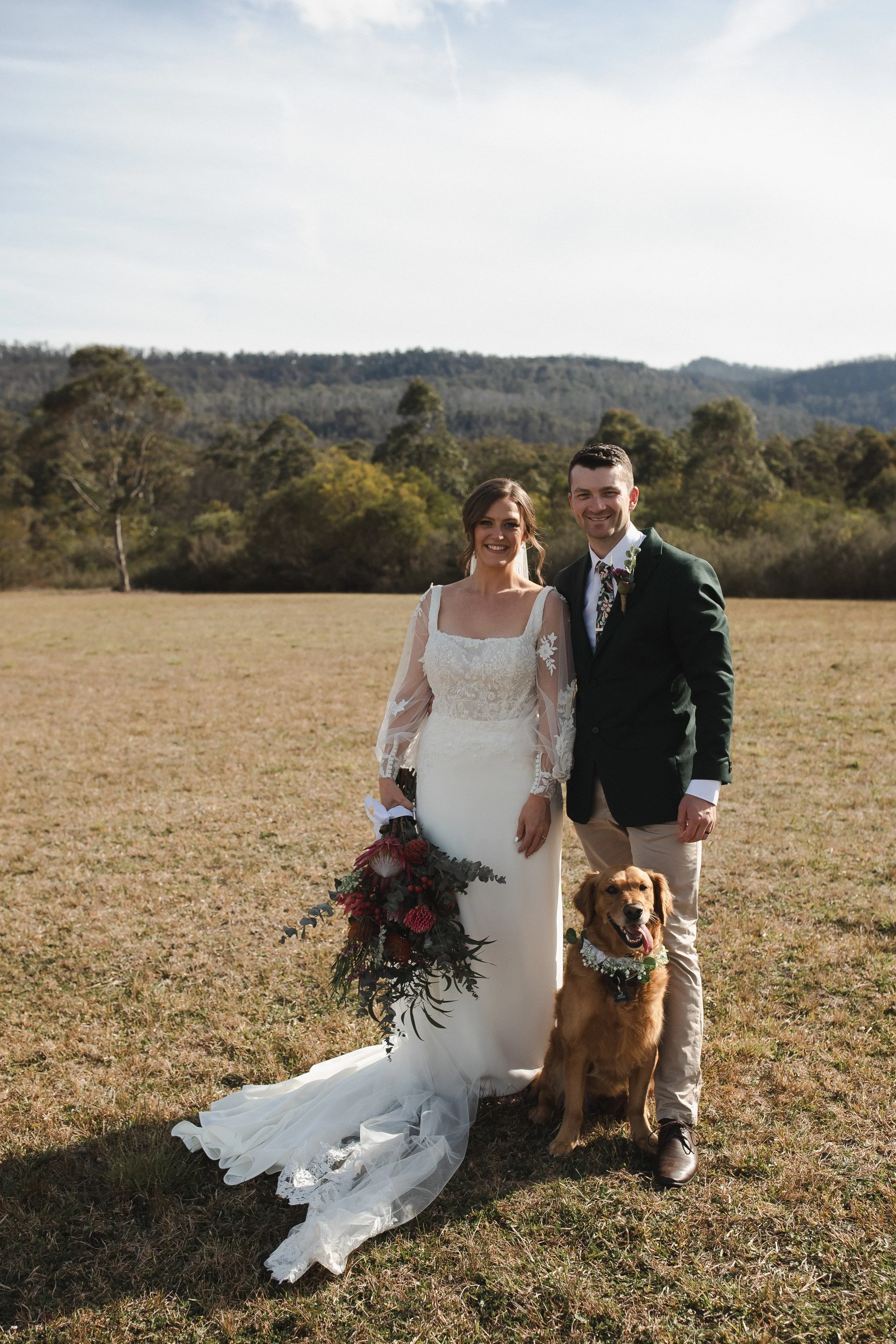 Picture this, an outdoor ceremony set on a 42 acre property with stunning views of nearby mountains and national park. The groomsmen arrived on push bikes while Sally was escorted down the aisle by her father. The couple exchanged heartfelt vows and rings before sharing their first kiss as husband and wife. Once married they joined their bridesmaids and groomsmen for some portraits around the property.