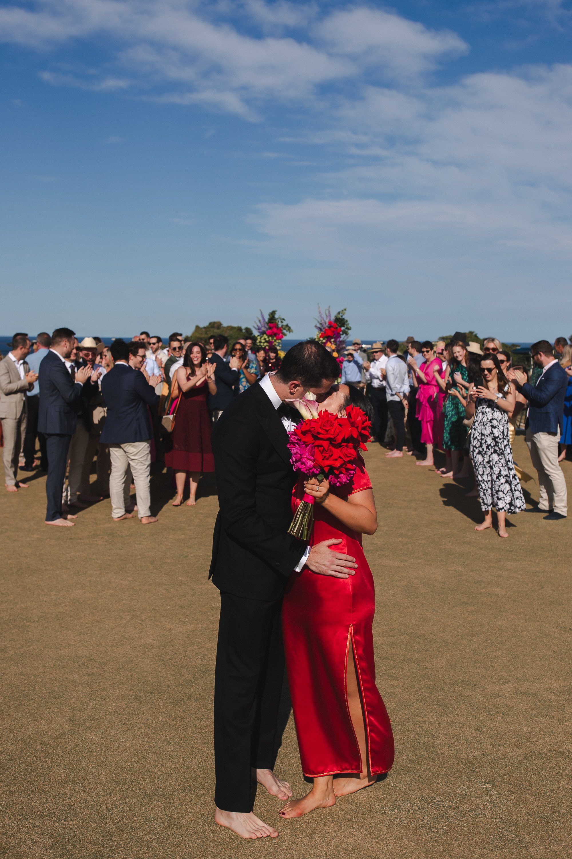 The ceremony, held on the bowling green, was nothing short of good vibes. Kaitlin was escorted down the aisle by both of her parents, symbolising the love and support of her family. The ceremony was enhanced by two bold pillars of colorful florals, which seamlessly tied in with the vibrant decor that would later grace the reception.