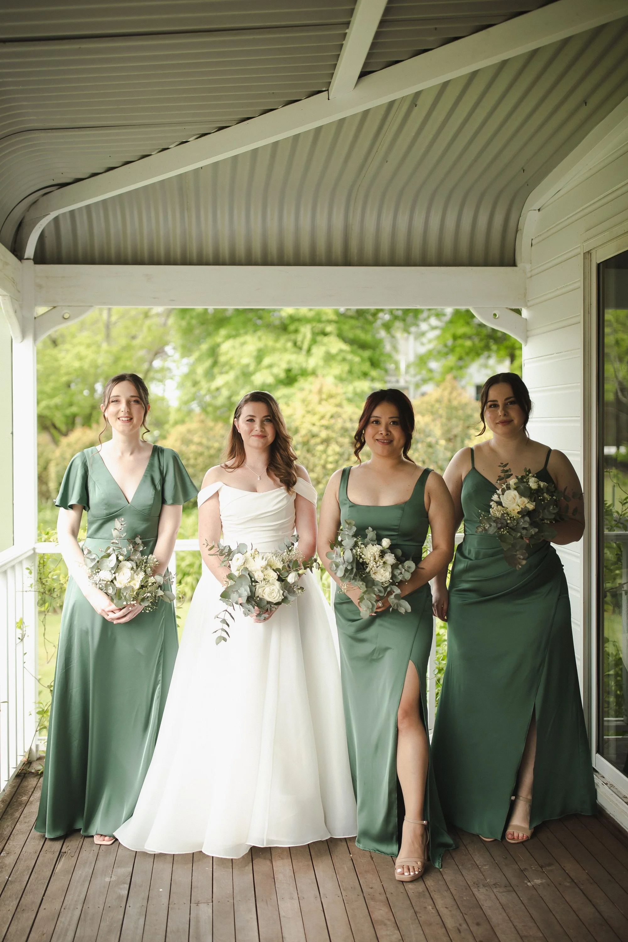 They kicked off their wedding day in the onsite cottages where they prepared for the ceremony. Brandon and the boys suited up while Jessica and the girls had their hair and makeup professionally styled. Once ready, Brandon and the boys made their way outside to greet their guests. Jessica and the girls were quick to follow and eager for the day to unfold. Their outdoor ceremony featured white wooden chairs that faced a timber arbour that had been draped in fabric and decorated with florals. The afternoon seamlessly blended into the evening with drinks on the lawn and an alfresco sit-down reception.