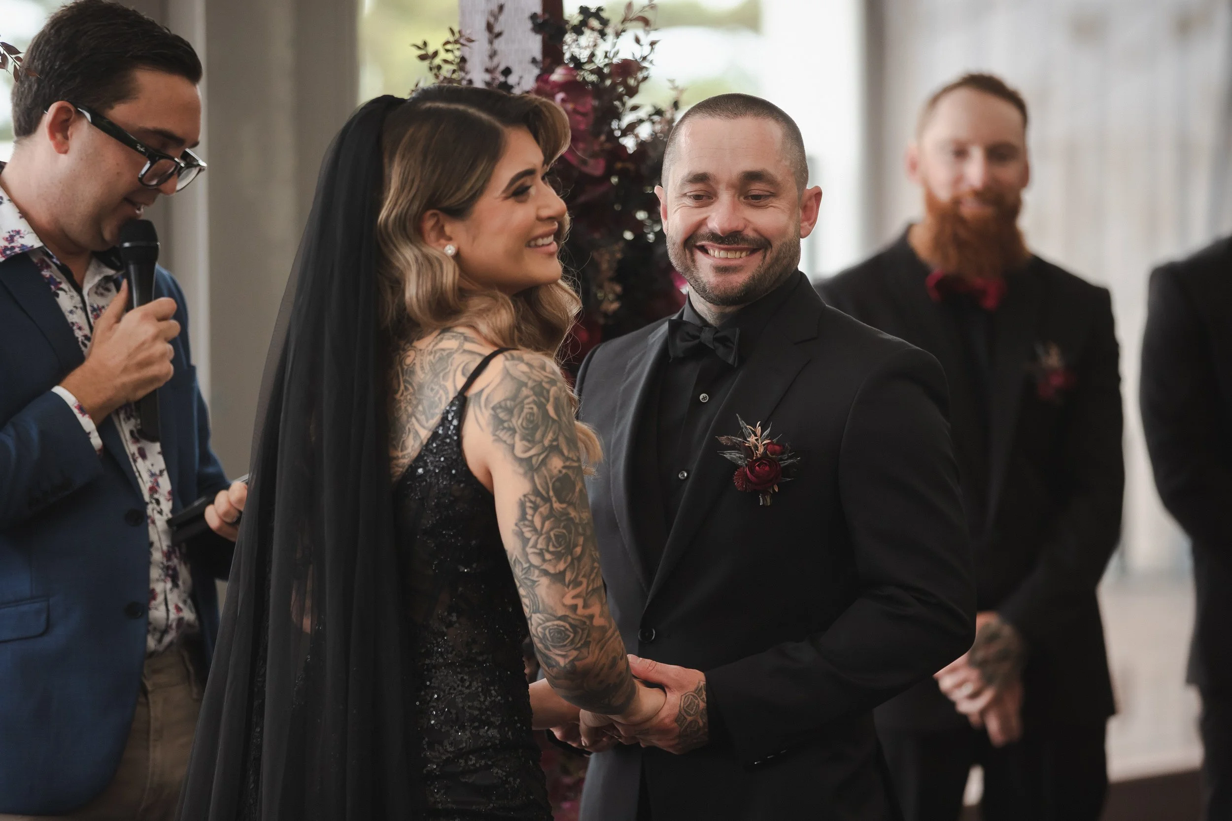 The ceremony was held on the stunning Deck at Novotel, where the couple exchanged vows with the sparkling ocean in the background. The bride, in a striking black dress and veil, exuded elegance and individuality. Her bold fashion choice was complemented perfectly by the groom’s all-black suit, creating a stunningly sophisticated look. Their beautiful daughter, Addy, played an important role throughout the day, adding even more warmth and joy to the occasion.
