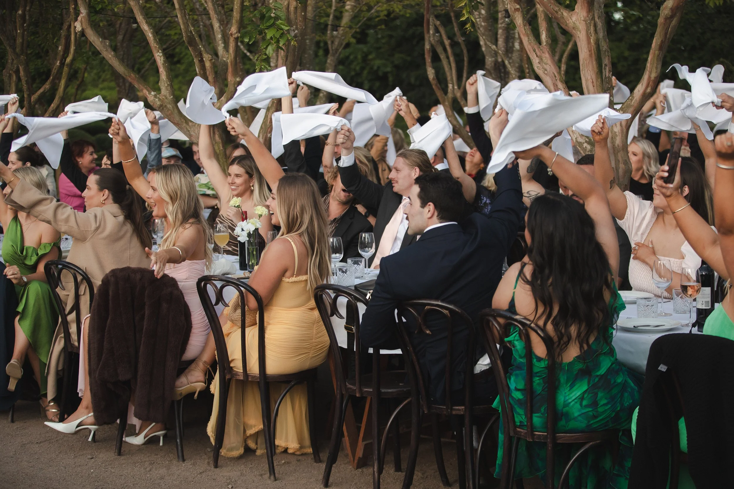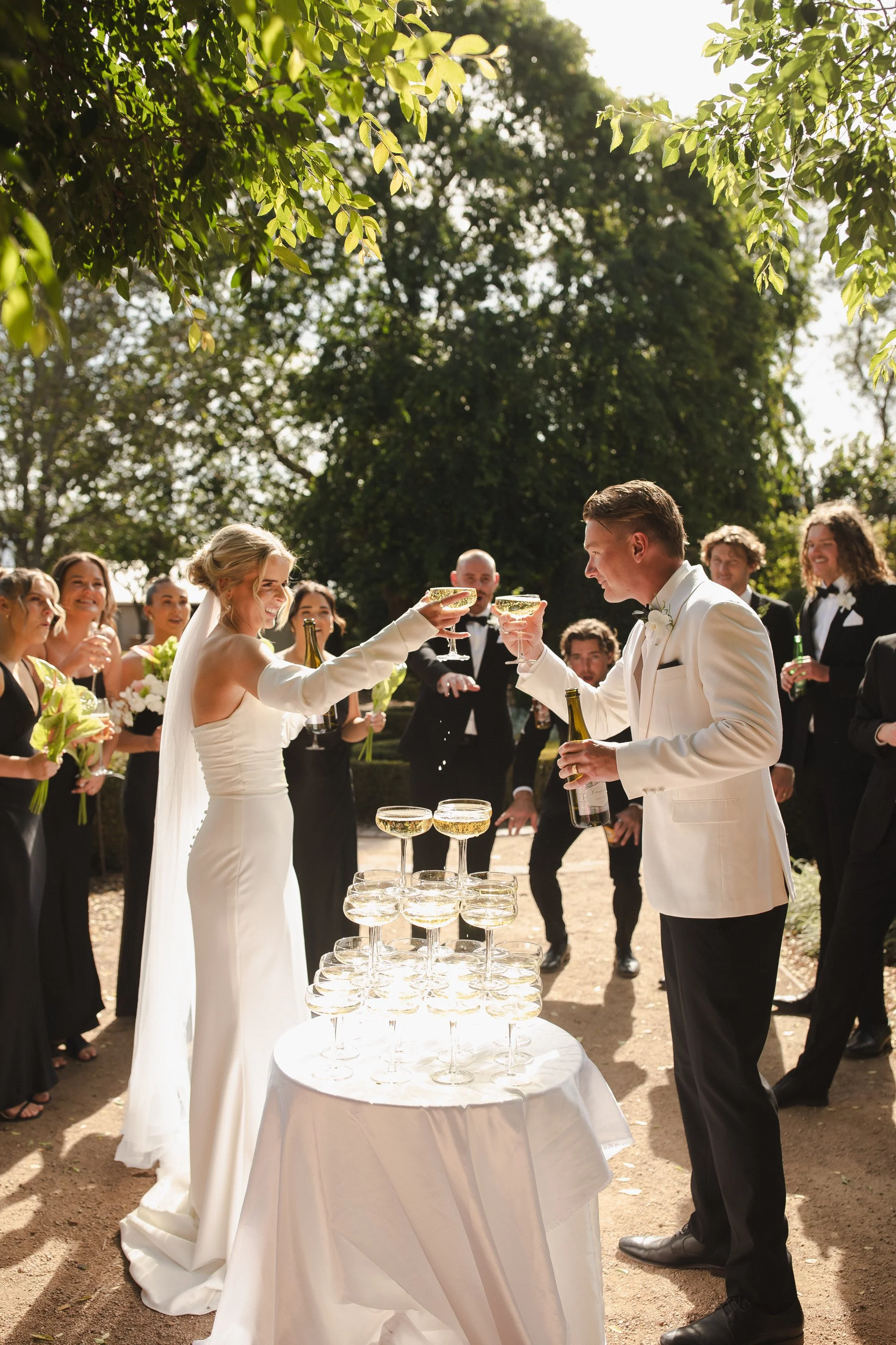 The day began in a traditional format, Callum and his groomsmen suiting up while the girls spent the morning being pampered in their pjs. Once dressed, the girls made their way across the gardens to the ceremony where the boys were waiting. Callum shed a tear when his bride made her way toward him. The couple shared beautiful vows, many laughs and a first kiss which signified the start of the marriage. Afterward the bride and groom filled the champagne tower while the bridal party gathered around with charged glasses ready to congratulate the newlyweds.