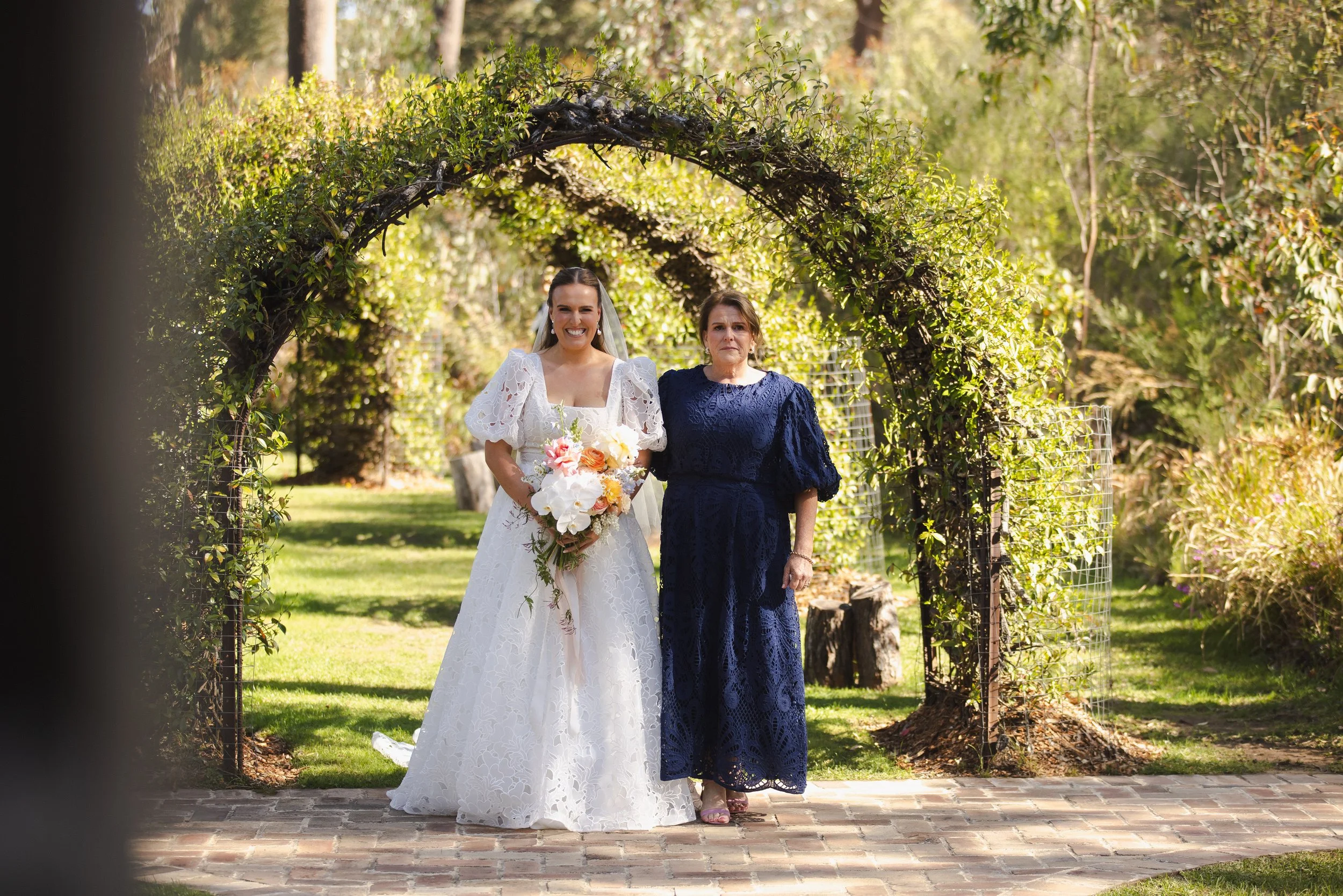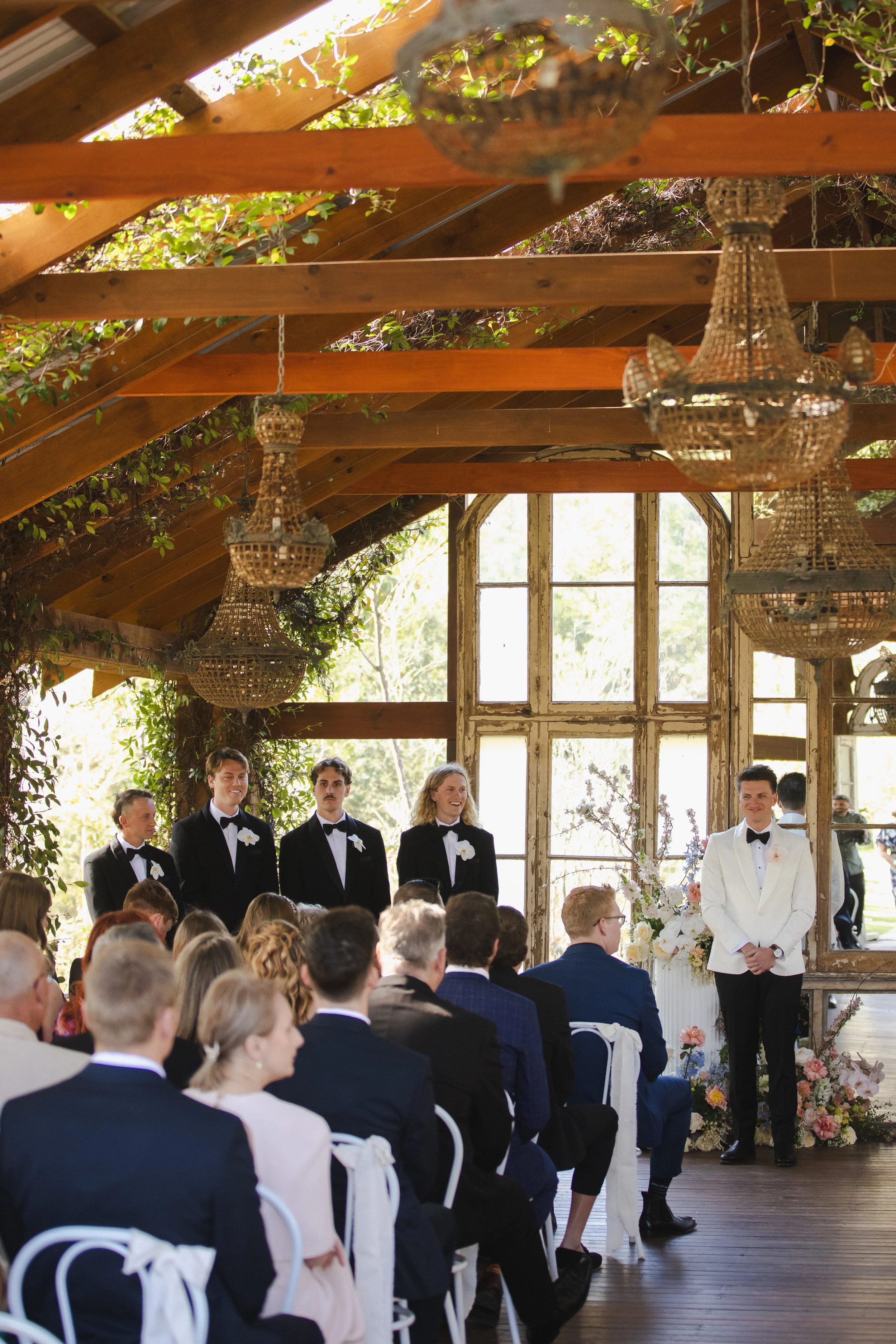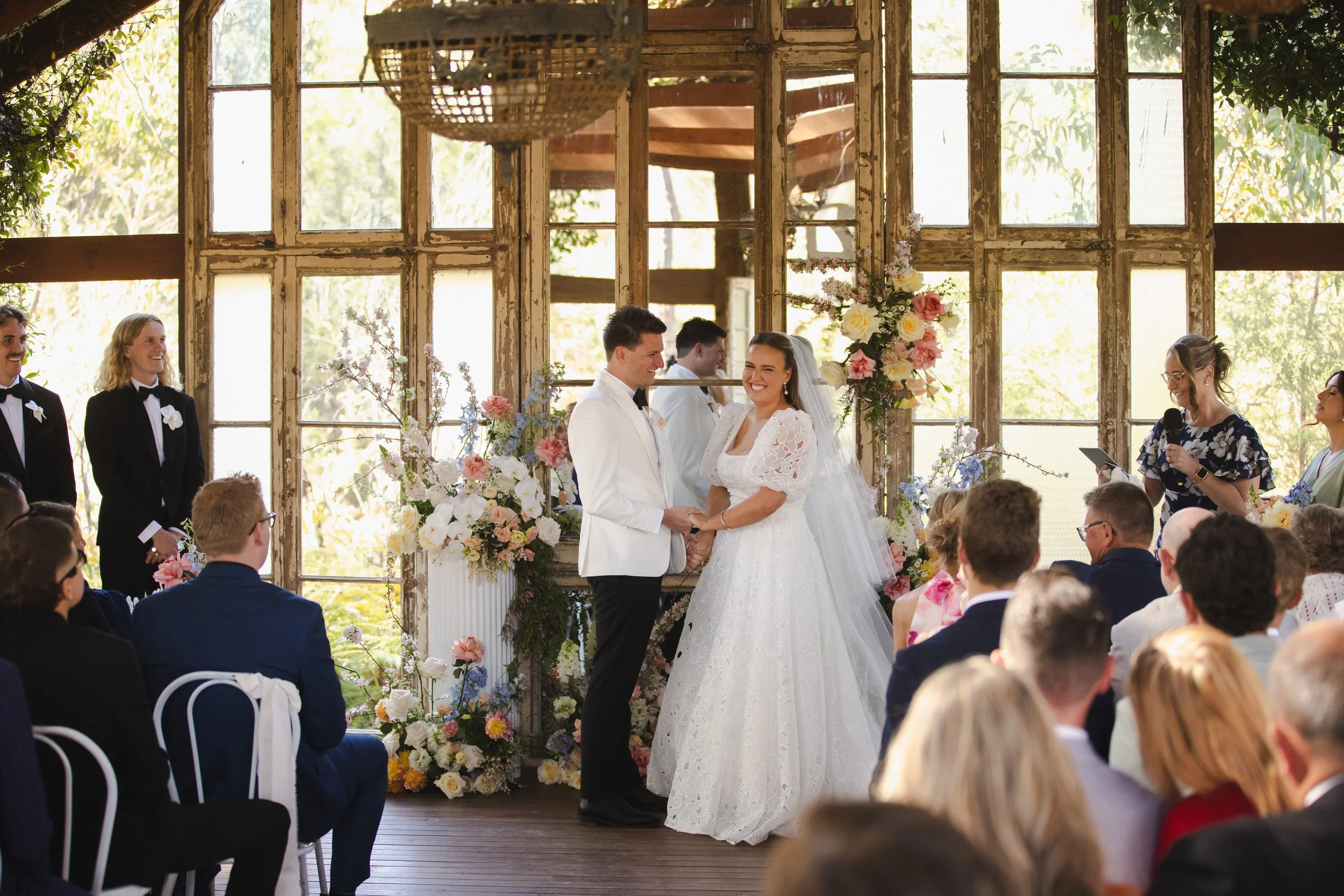 Their ceremony took place in the whimsical bush chapel, a breathtaking setting adorned with floor-to-ceiling vintage mirrors, glittering chandeliers, and a stunning pathway lined with arbours. Dylan and Hayley exchanged heartfelt, personally written vows, taking everyone on a touching walk down memory lane.