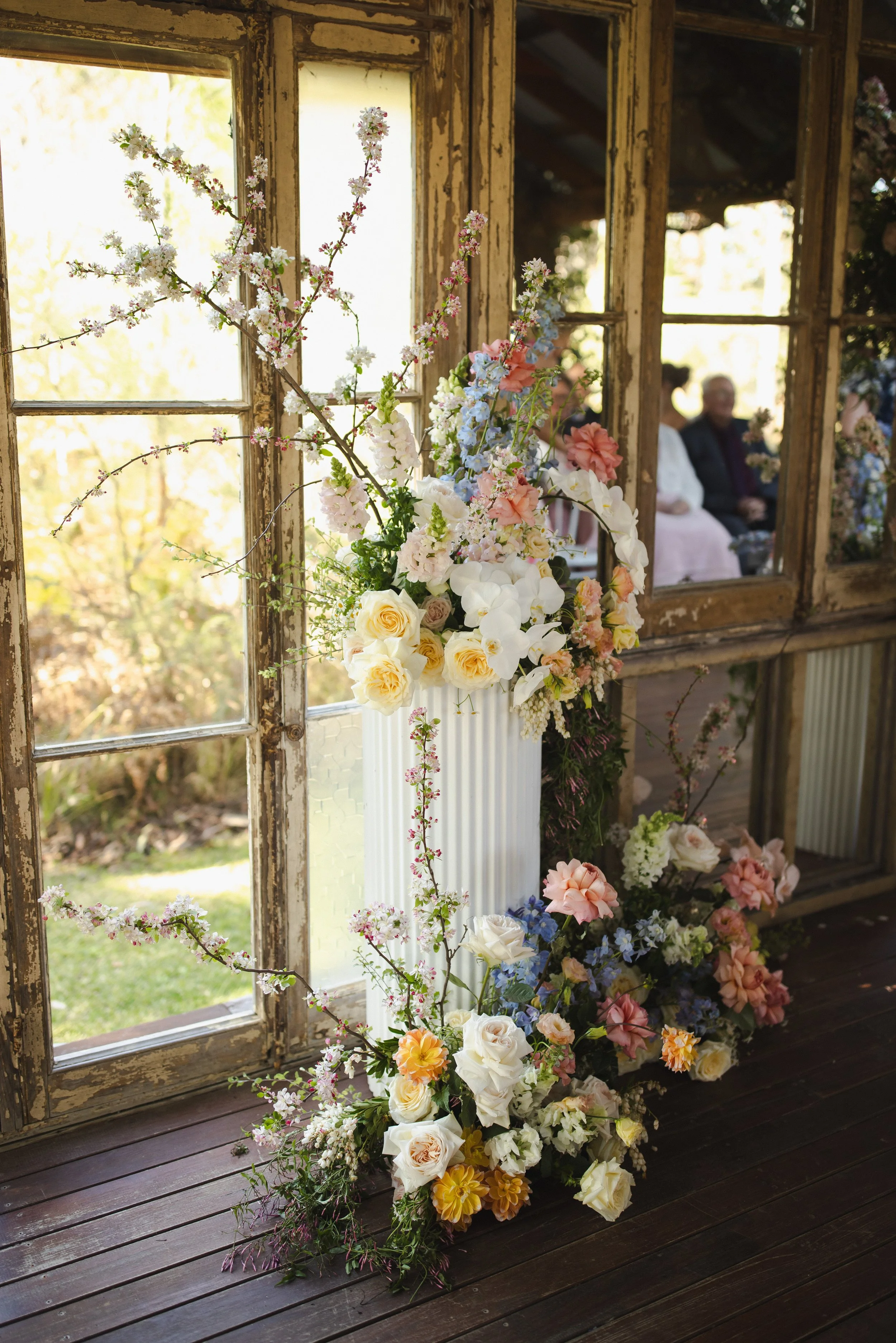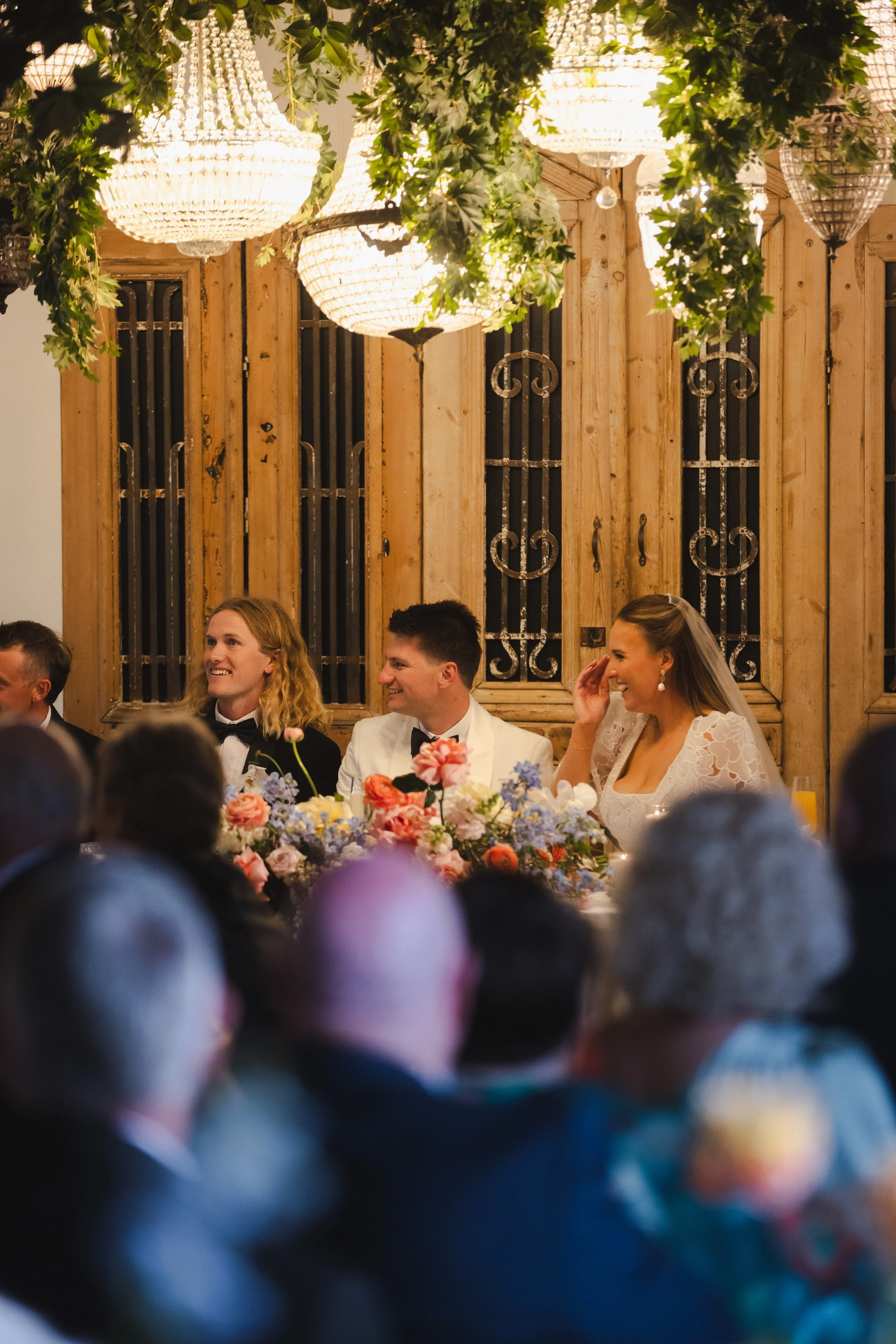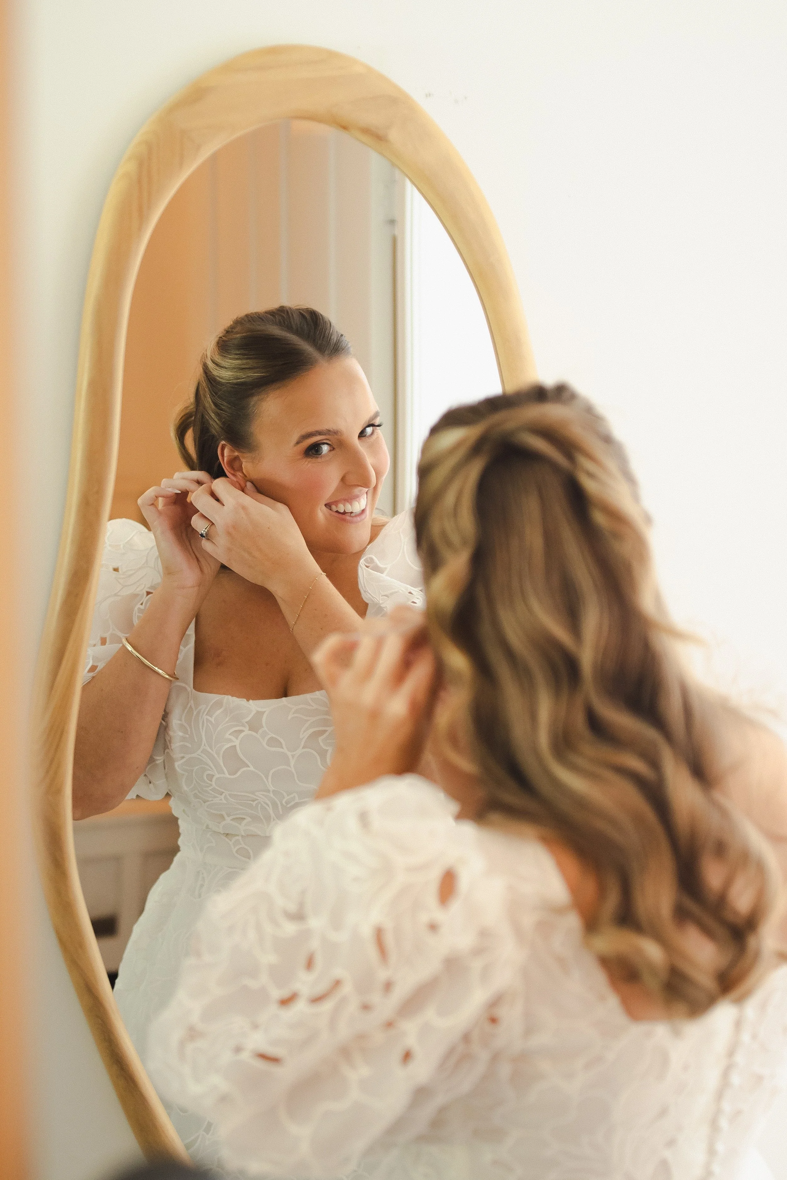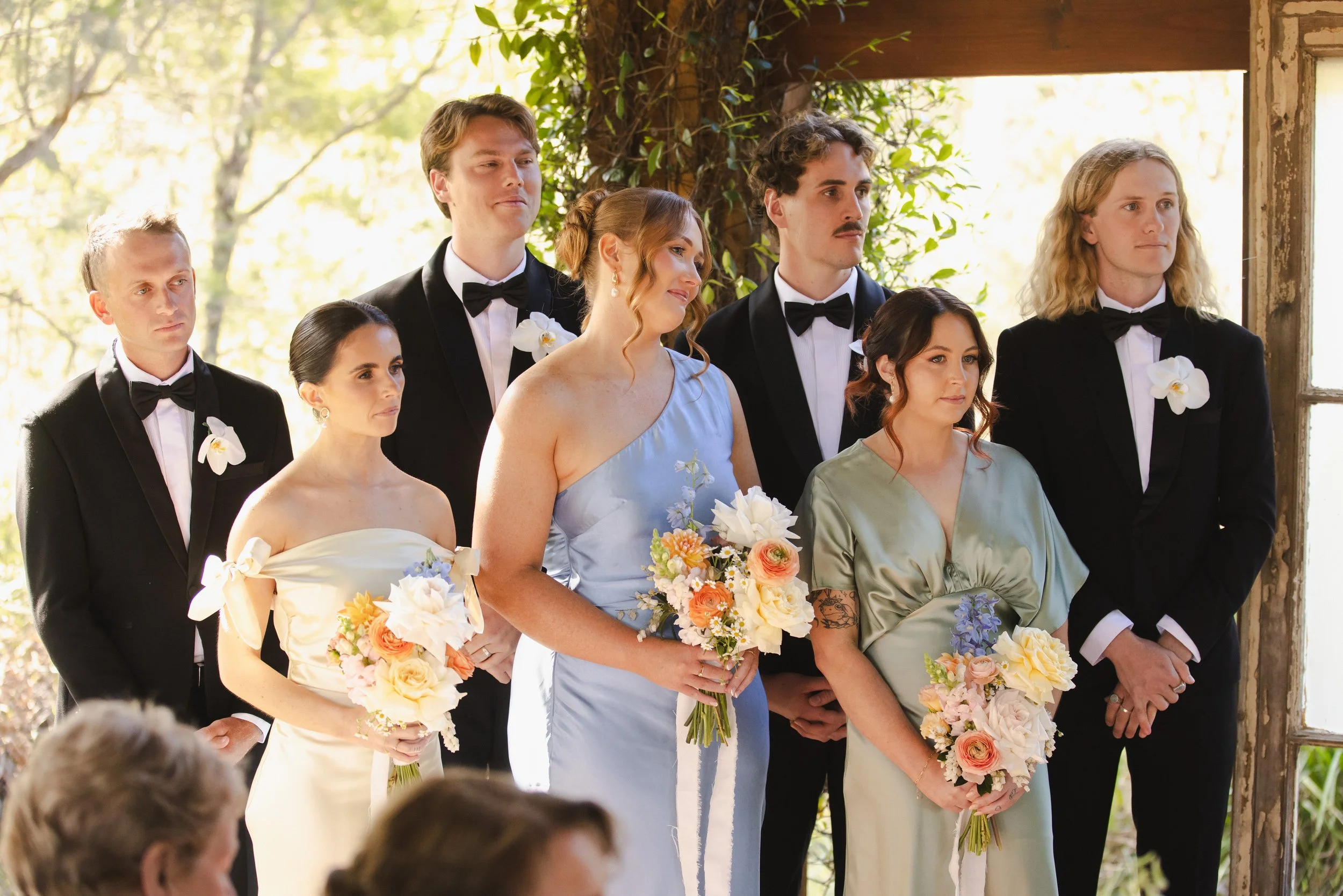 Their ceremony took place in the whimsical bush chapel, a breathtaking setting adorned with floor-to-ceiling vintage mirrors, glittering chandeliers, and a stunning pathway lined with arbours. Dylan and Hayley exchanged heartfelt, personally written vows, taking everyone on a touching walk down memory lane.