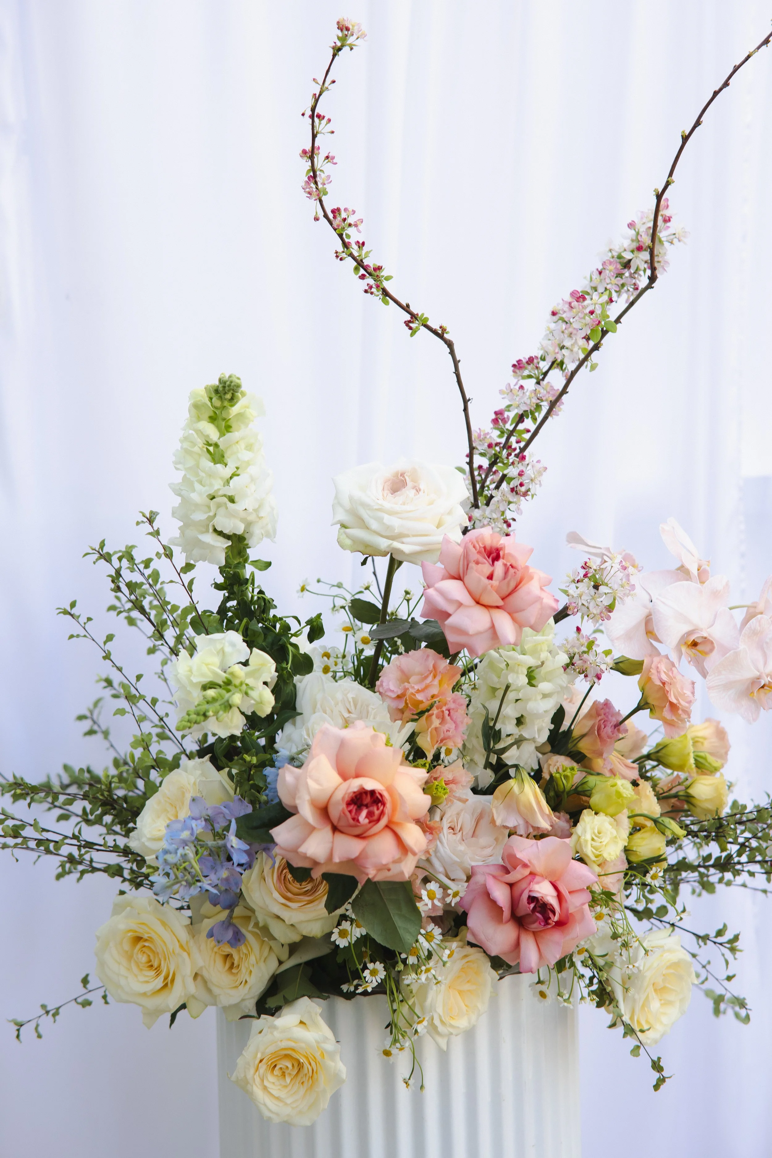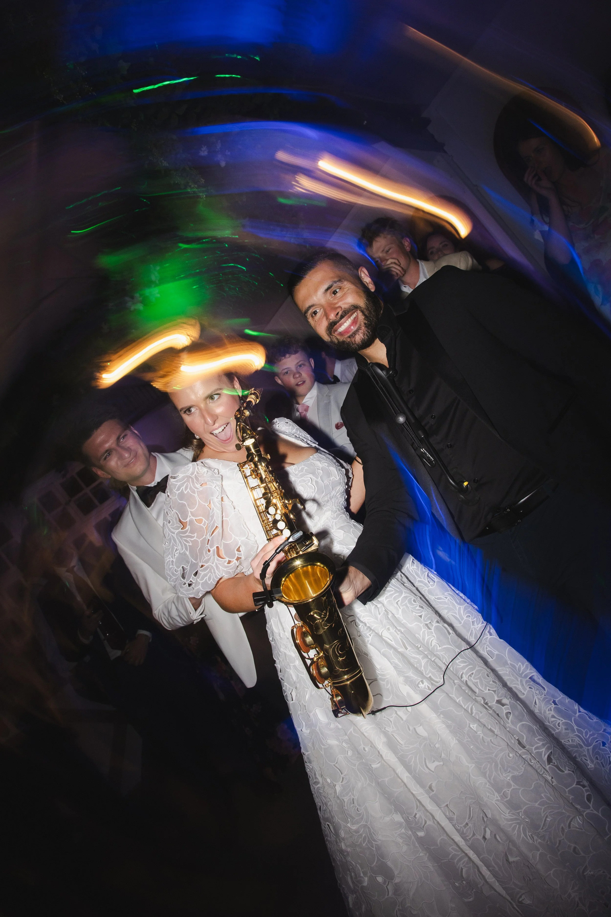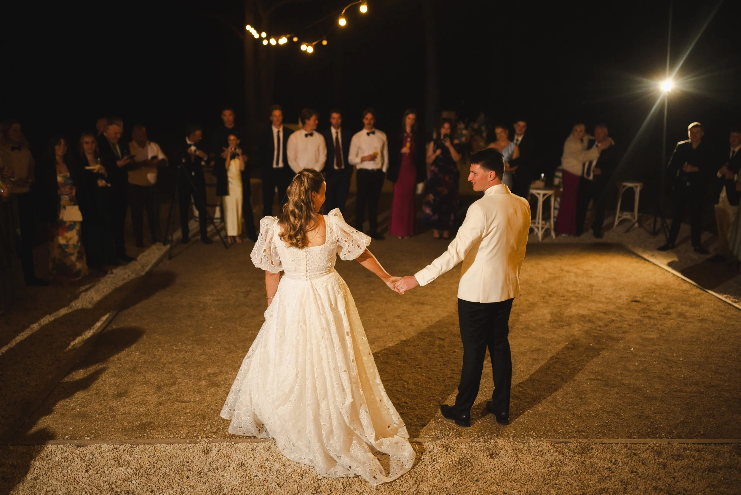 After the ceremony, guests enjoyed a lively cocktail hour while the bridal party captured timeless portraits around the venue. The reception blended indoor elegance with outdoor charm; guests shared intimate moments under the stars during the first dance, followed by a delicious dinner on long banquet tables inside. Emotional speeches, a delectable cake, and a lively dance floor kept the energy high well into the night, with a saxophonist adding an extra layer of fun and soul to the celebration.