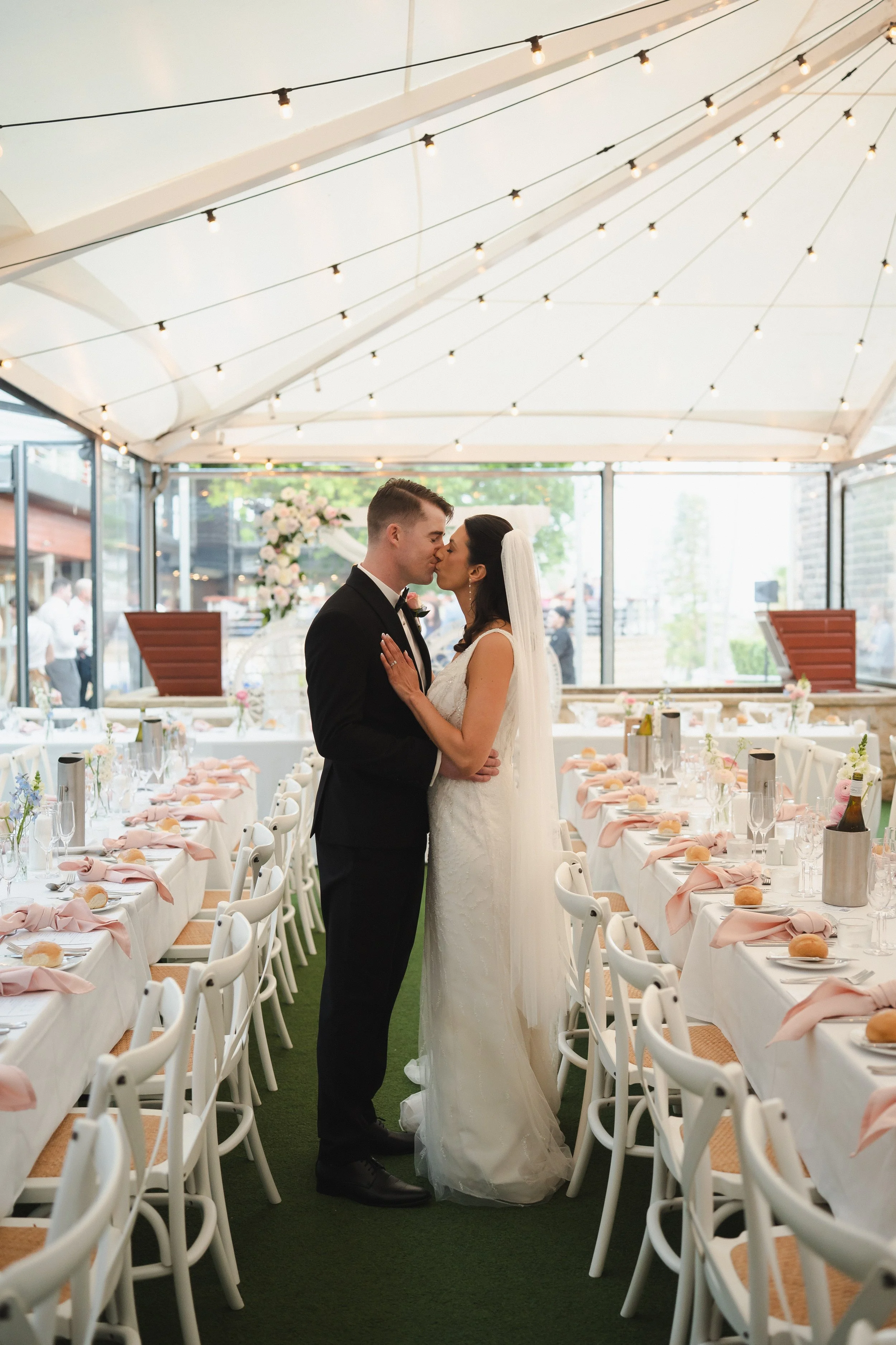 After the kiss and the cheers, guests gathered in the courtyard for a champagne tower that was equal parts elegant and entertaining. With bubbles in hand, the couple wandered down to the harbour for portraits, stealing a few quiet moments between the camera clicks.