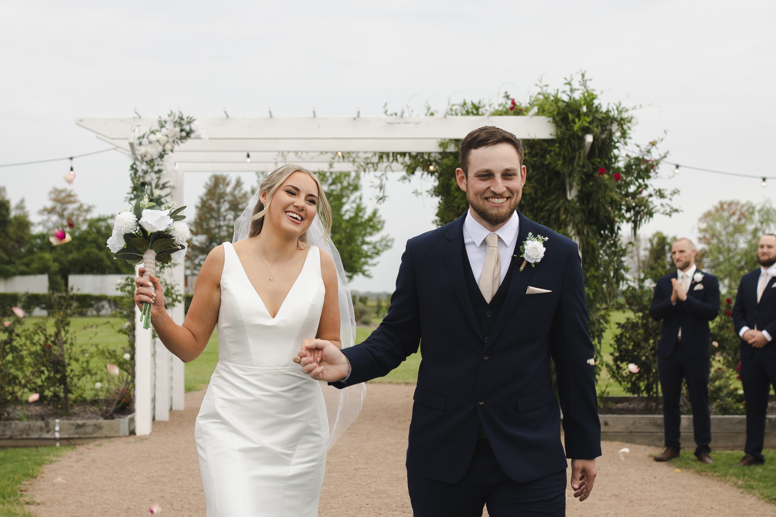 Figbird in Terara provided the perfect backdrop for the day. Their garden was the dream setting for an outdoor ceremony, with views stretching over country fields and a soft breeze floating through the trees. After vows were shared and rings exchanged, the celebrations kicked off with a champagne tower and cocktail hour out on the lawn.