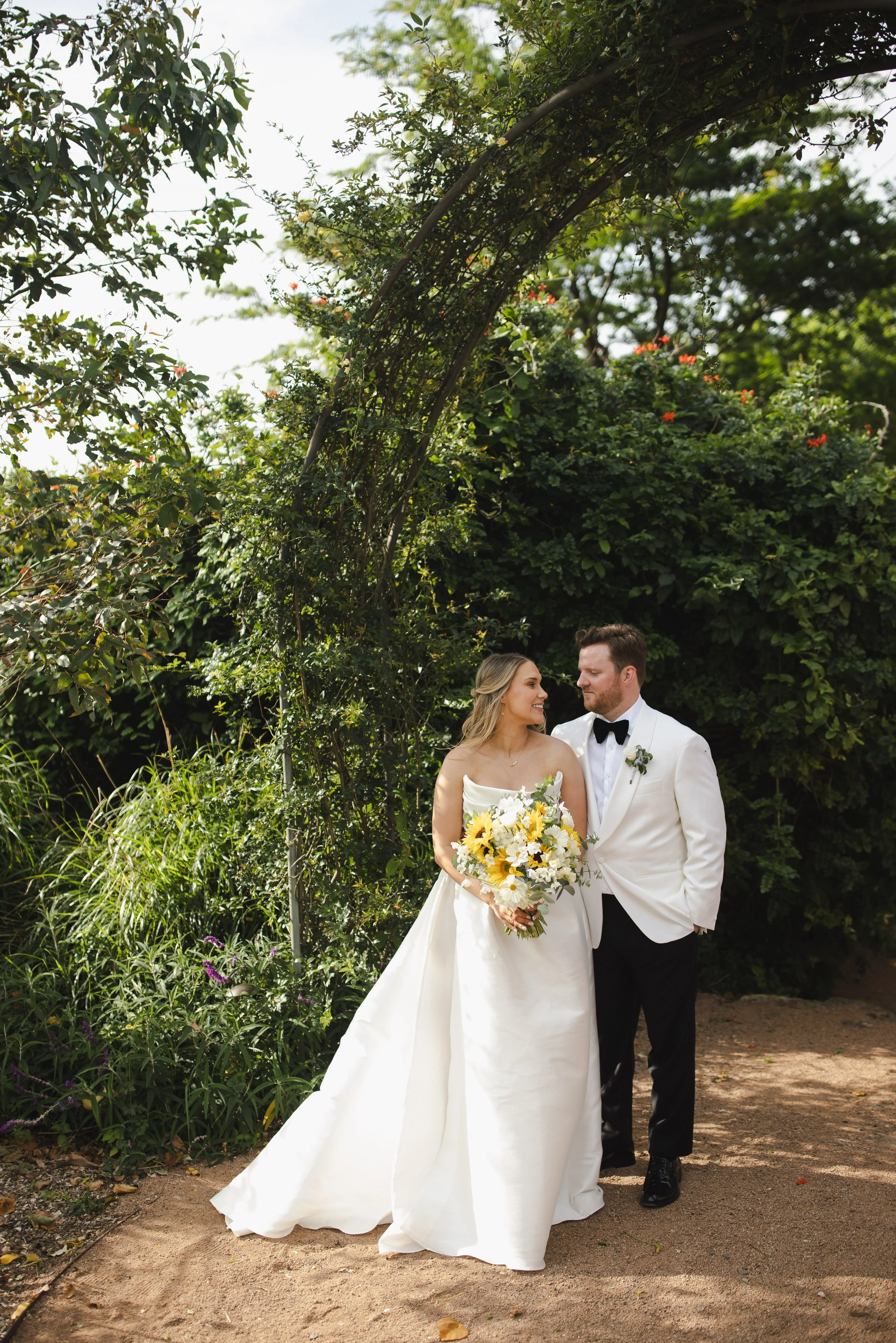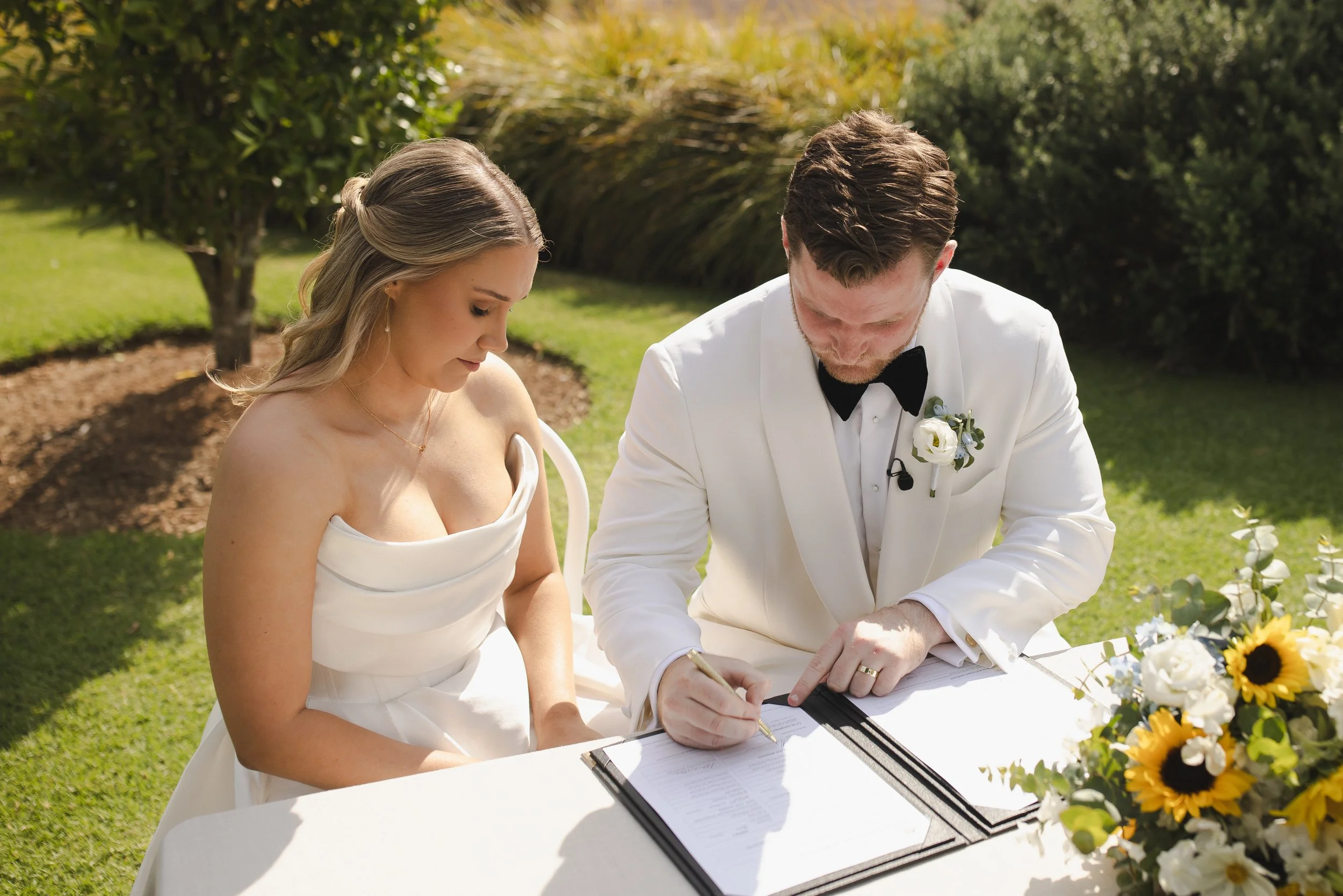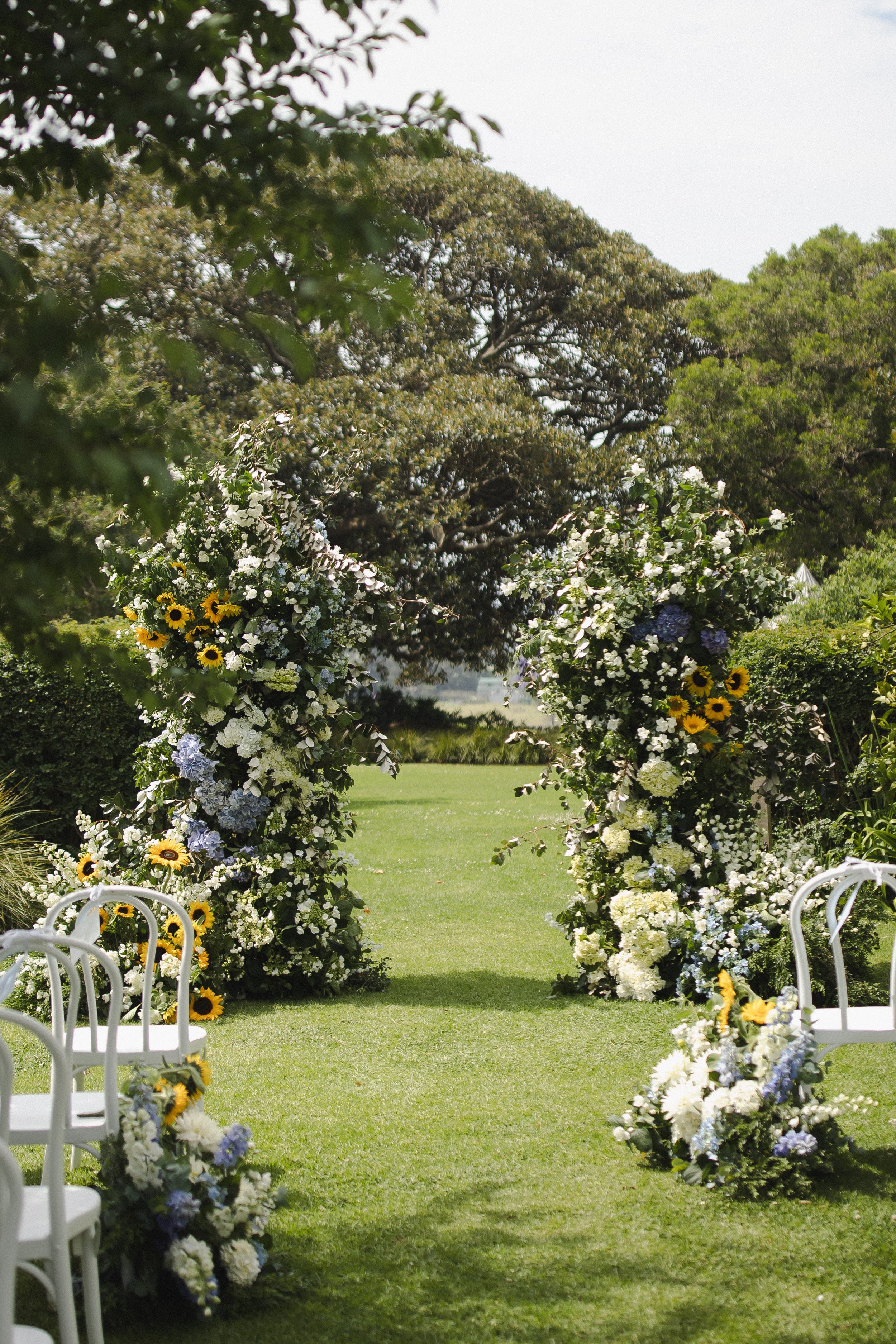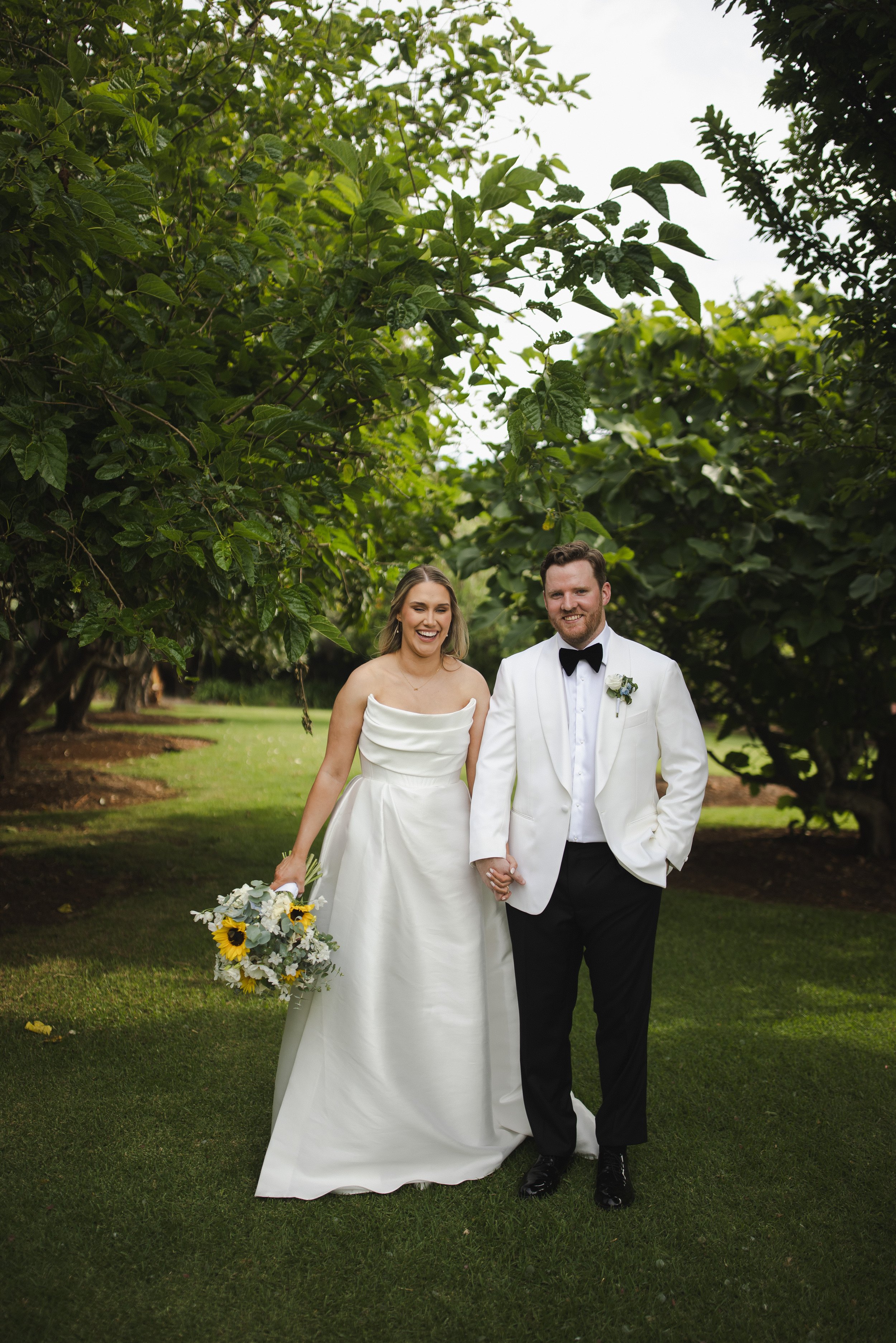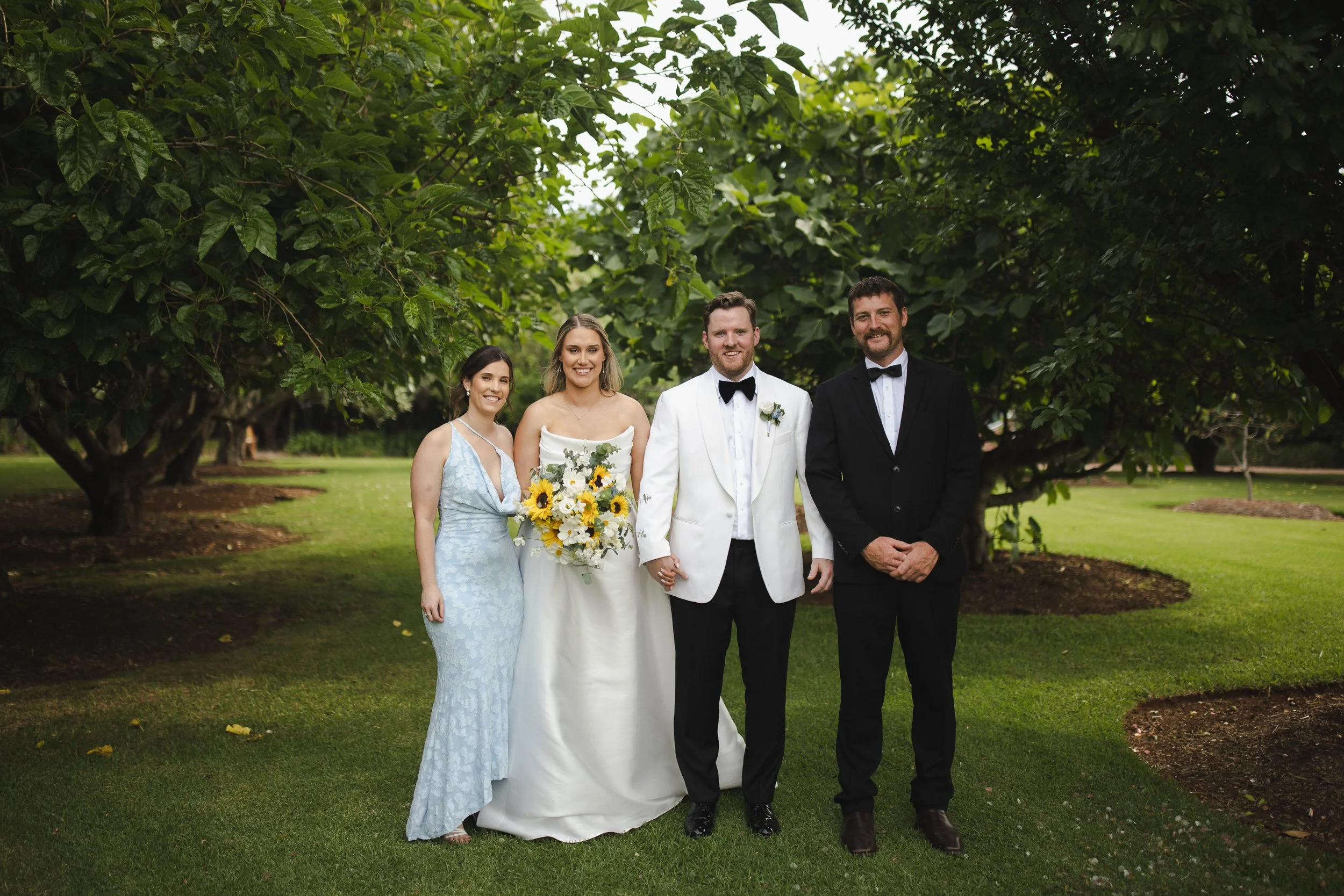 Their ceremony took place outdoors, bathed in warm sunshine, with vibrant sunflowers arranged in floral plinths perfectly framing the couple as they said their vows. The bright blooms added a joyful, summery feel and reflected the relaxed, heartfelt atmosphere of the day. After the ceremony, Lara and Arthur enjoyed afternoon portraits around the property, making the most of Greyleigh’s rolling landscape and golden light.