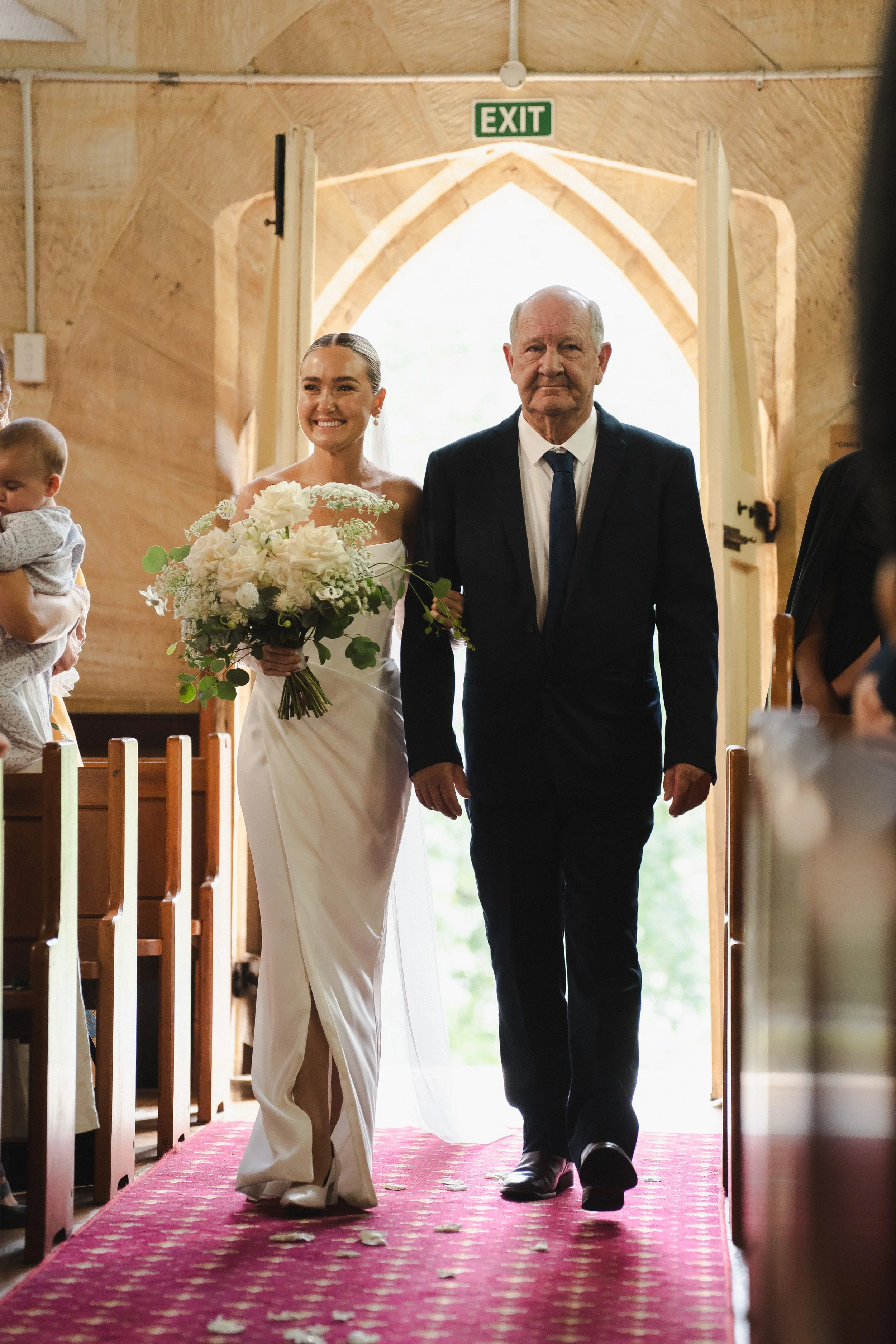 Their ceremony at St Francis Xavier Church in Berrima was intimate and full of emotion, as they exchanged vows surrounded by family and friends. Afterward, the celebration moved to Bendooley Estate’s Book Barn, where guests enjoyed a traditional sit-down dinner in a stylish, modern setting complete with stunning florals.