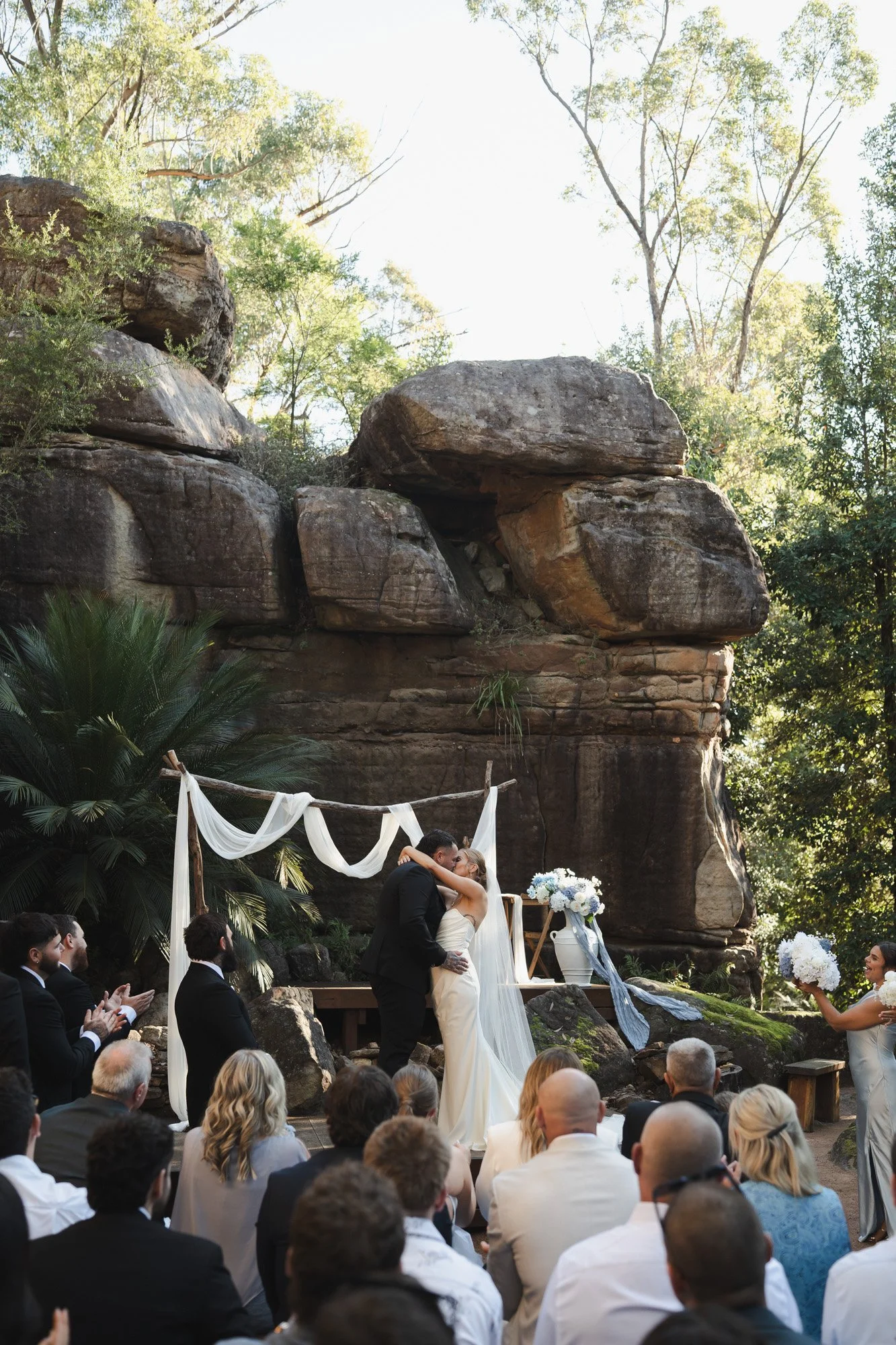 The ceremony took place in the venue’s iconic Rock Cathedral – a natural amphitheatre of ancient stone formations that framed their vows with drama and beauty. With the escarpments rising in the distance and the soft sounds of the bush all around, it felt like something out of a fairytale.