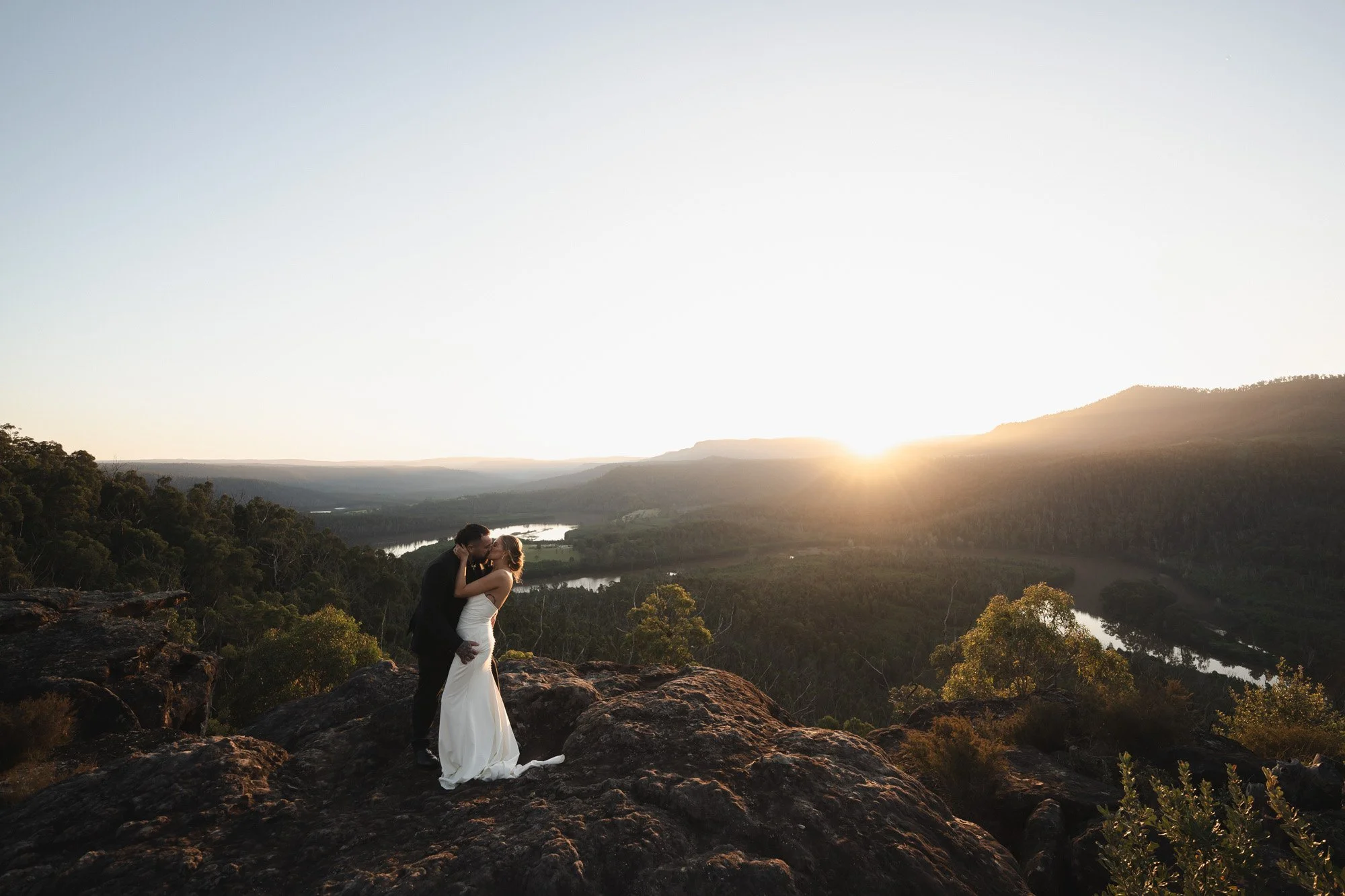 Afterward, guests made their way to the Sunset Deck, where panoramic views of the Shoalhaven River and Morton National Park provided a magical backdrop. As the sun dipped behind the hills, Brooke and Jake stole a quiet moment together for a sunset portrait session – and the results were nothing short of spectacular.