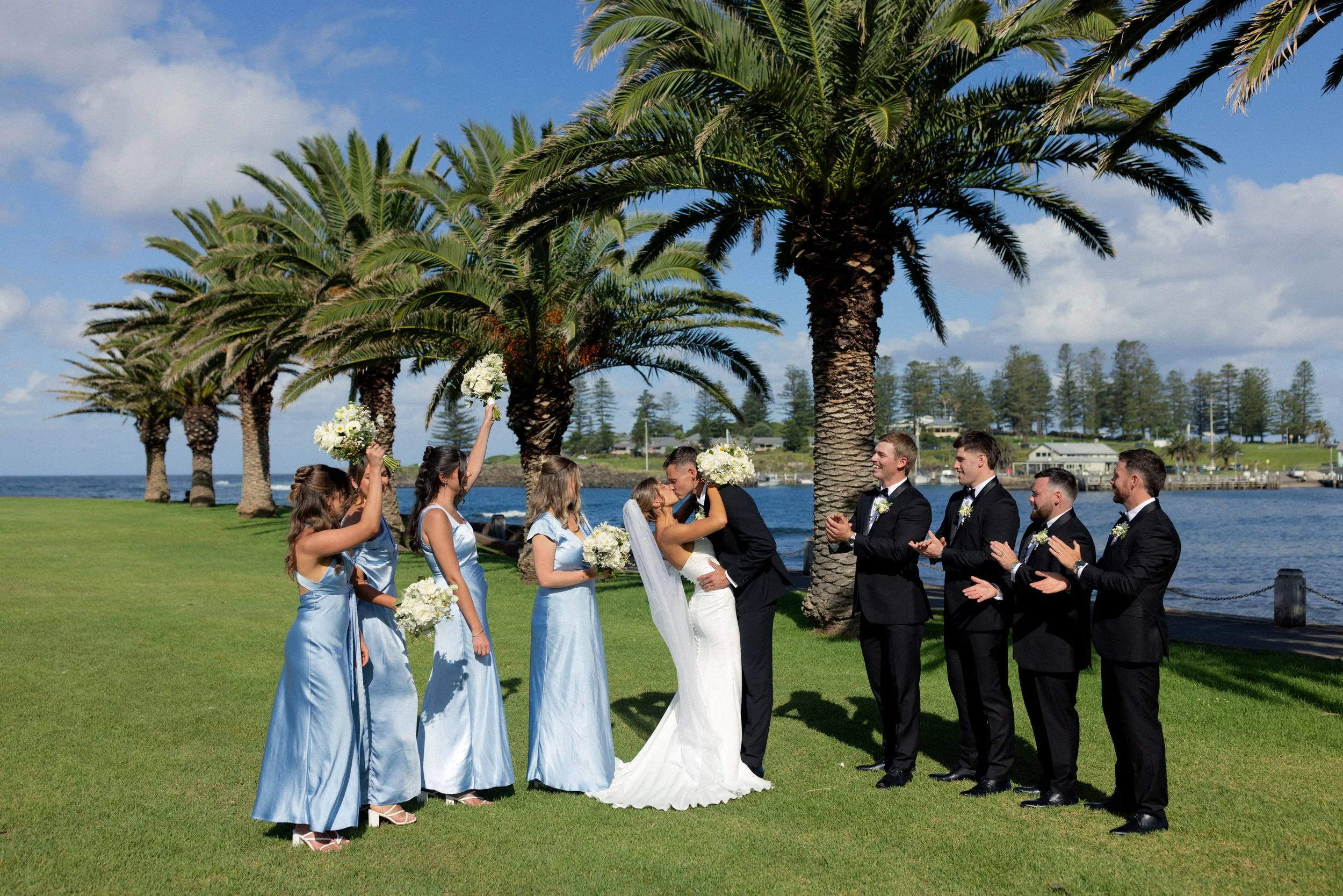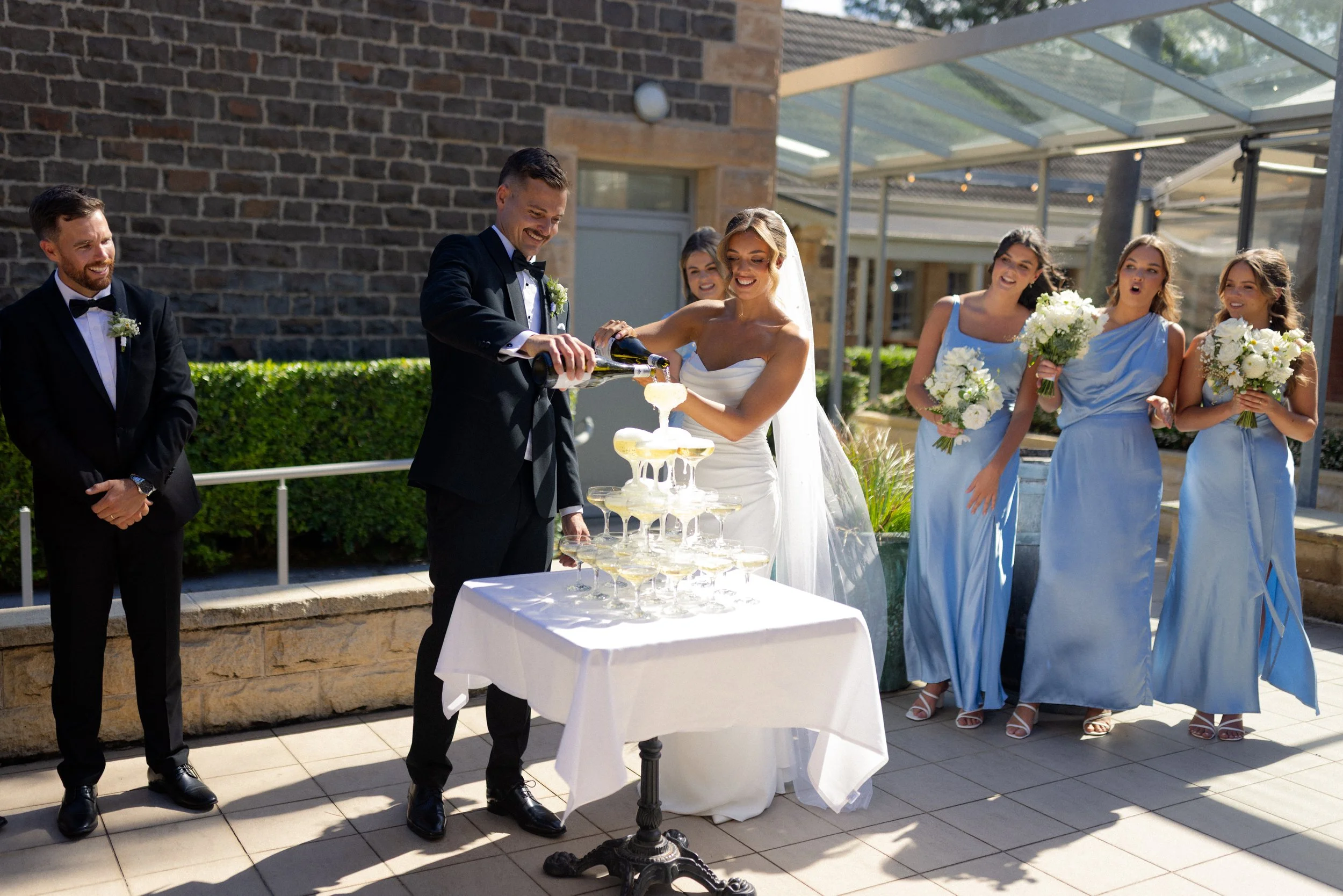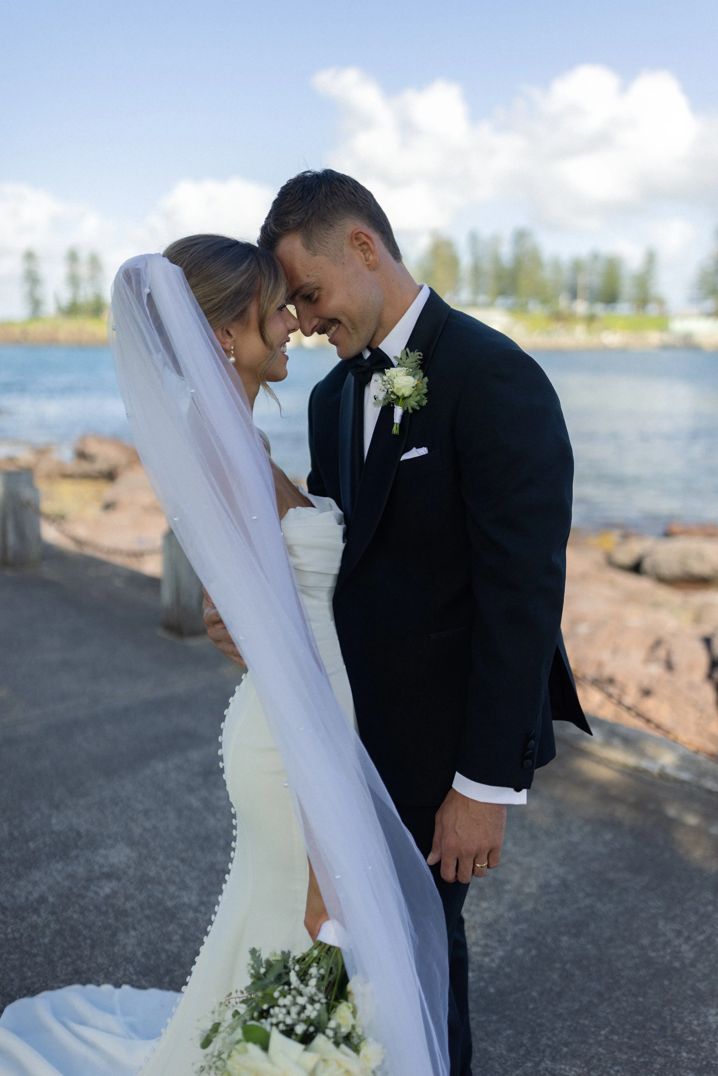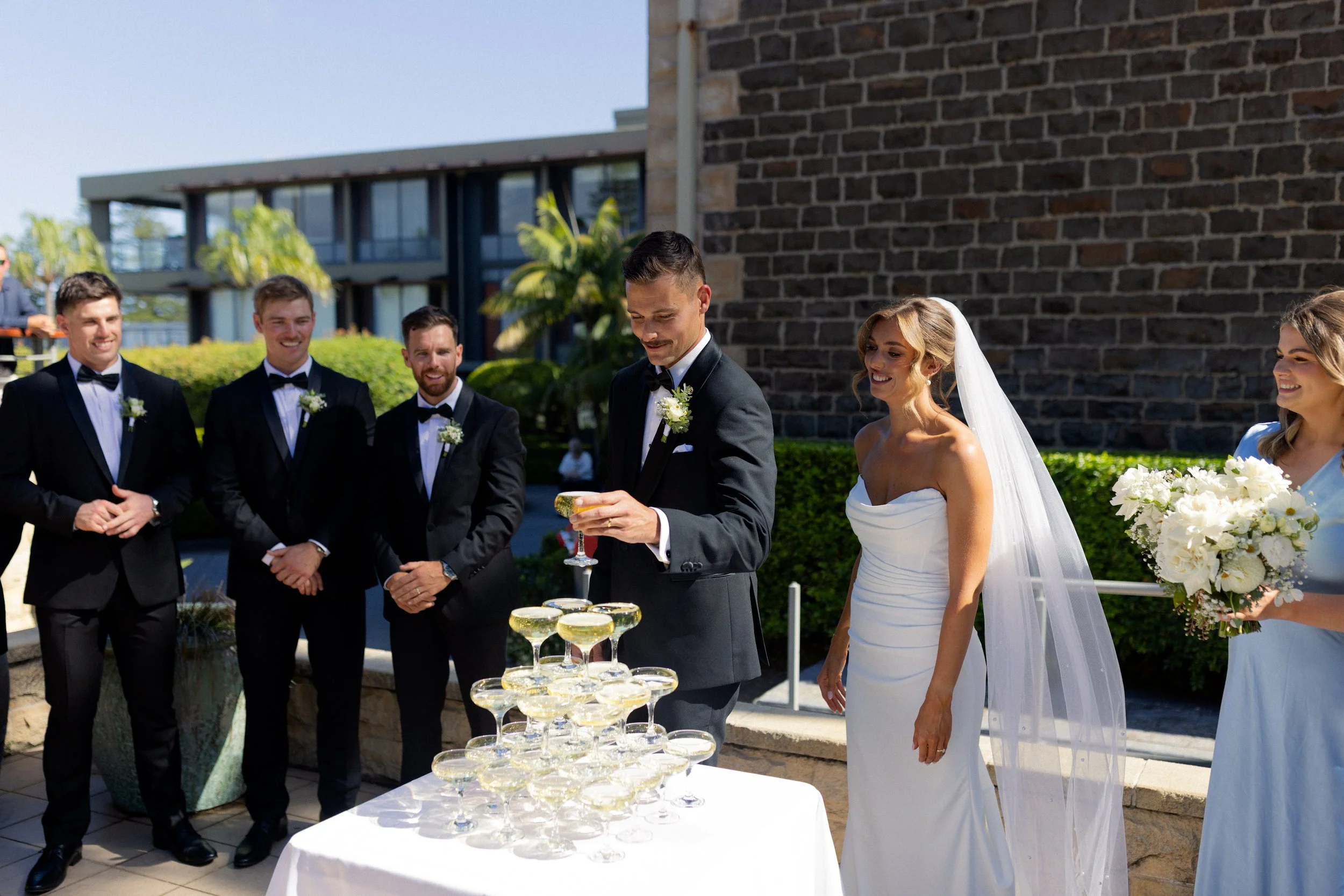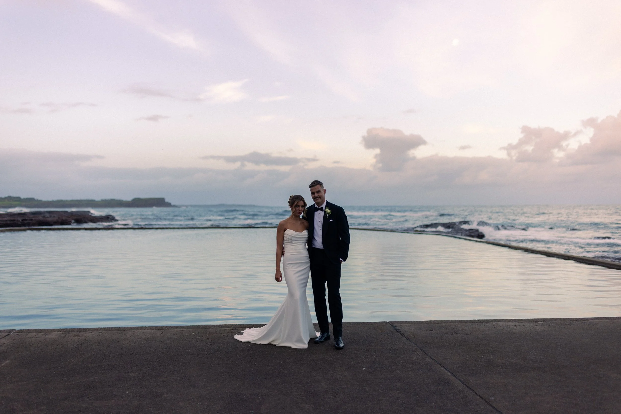 Following their heartfelt “I do’s,” guests gathered to celebrate with a beautiful champagne tower, marking the beginning of the festivities. The newlyweds then took advantage of Kiama’s scenic harbour, capturing timeless portraits among the coastal views and golden afternoon light.