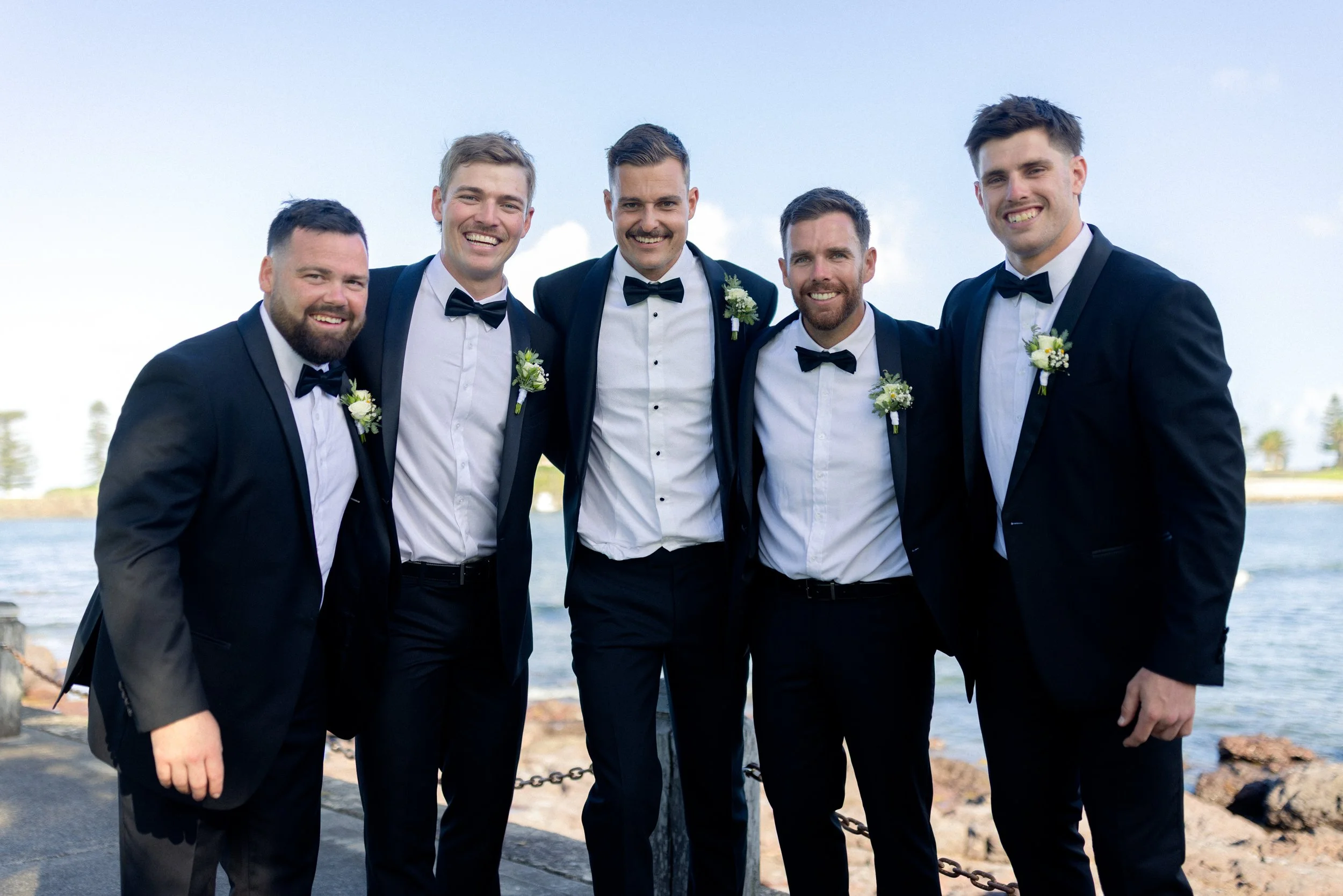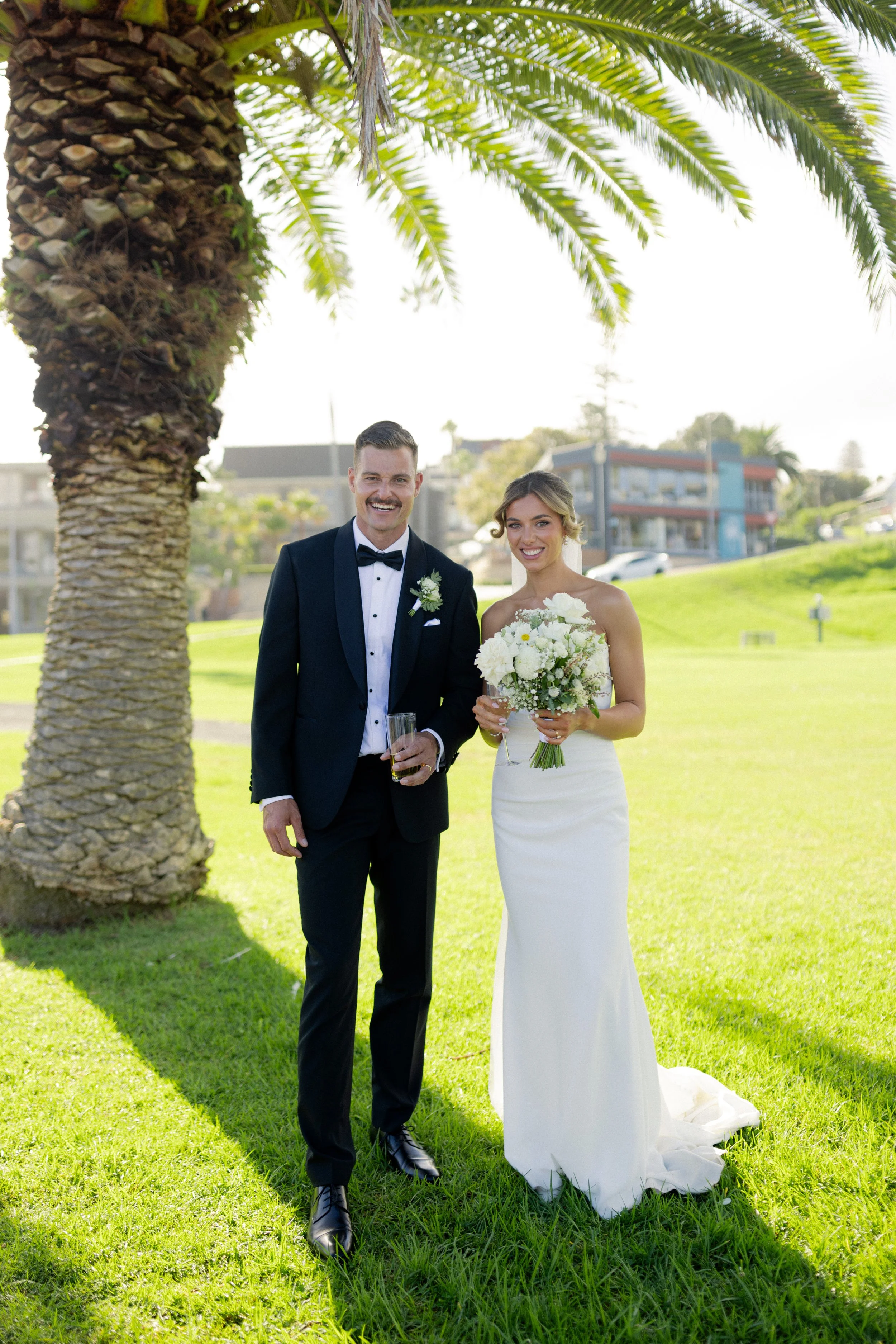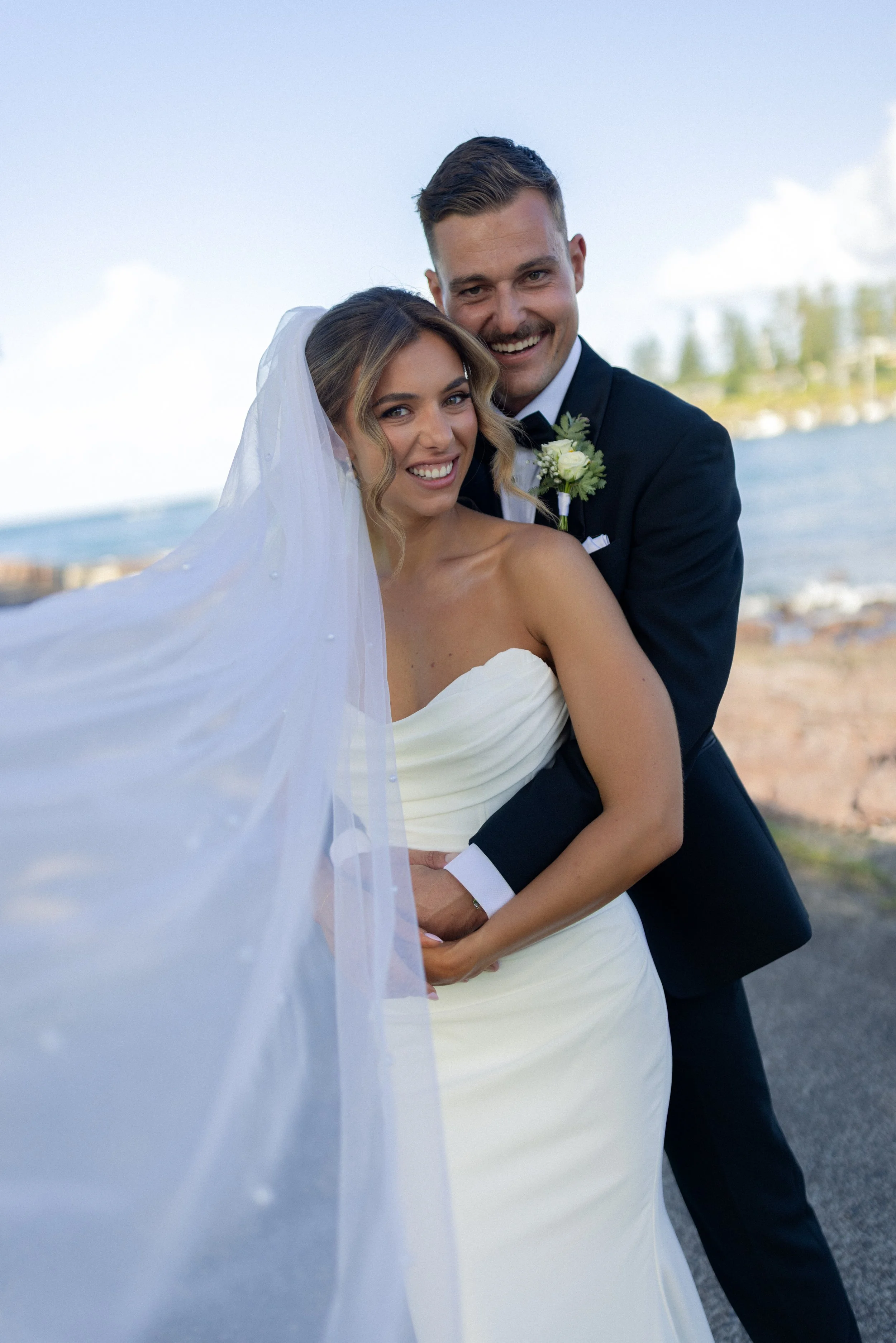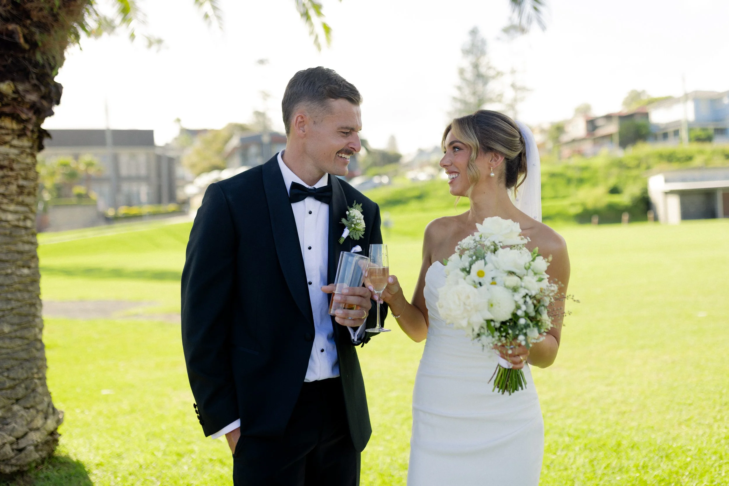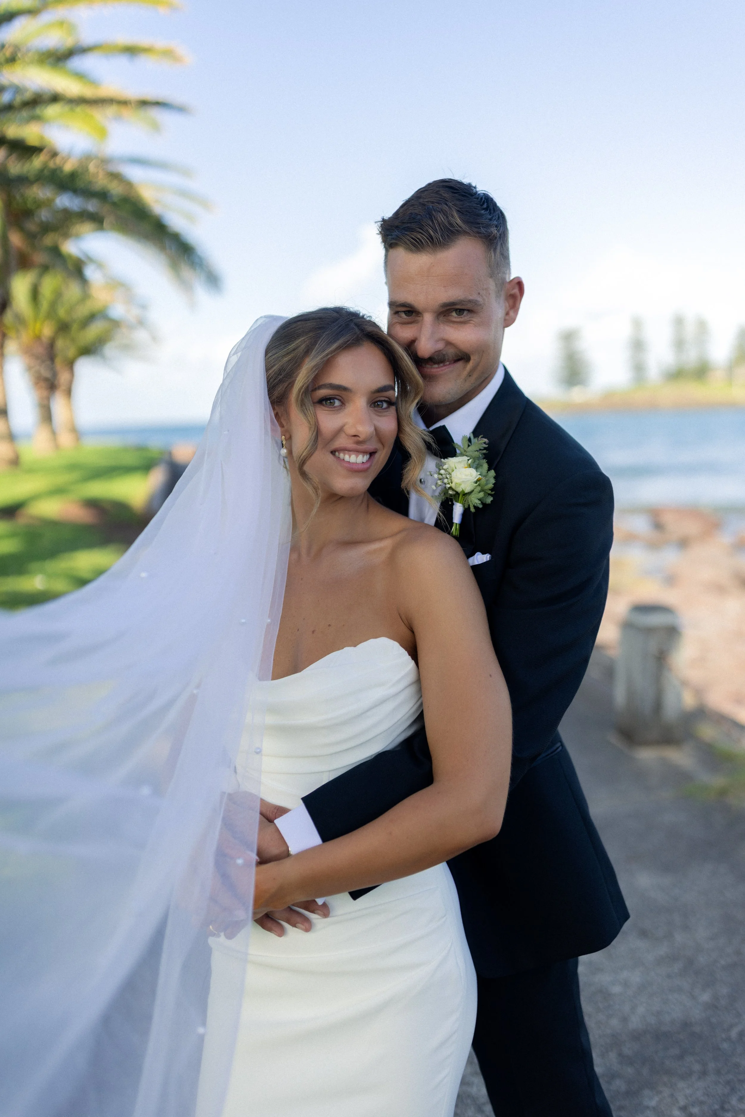 Following their heartfelt “I do’s,” guests gathered to celebrate with a beautiful champagne tower, marking the beginning of the festivities. The newlyweds then took advantage of Kiama’s scenic harbour, capturing timeless portraits among the coastal views and golden afternoon light.