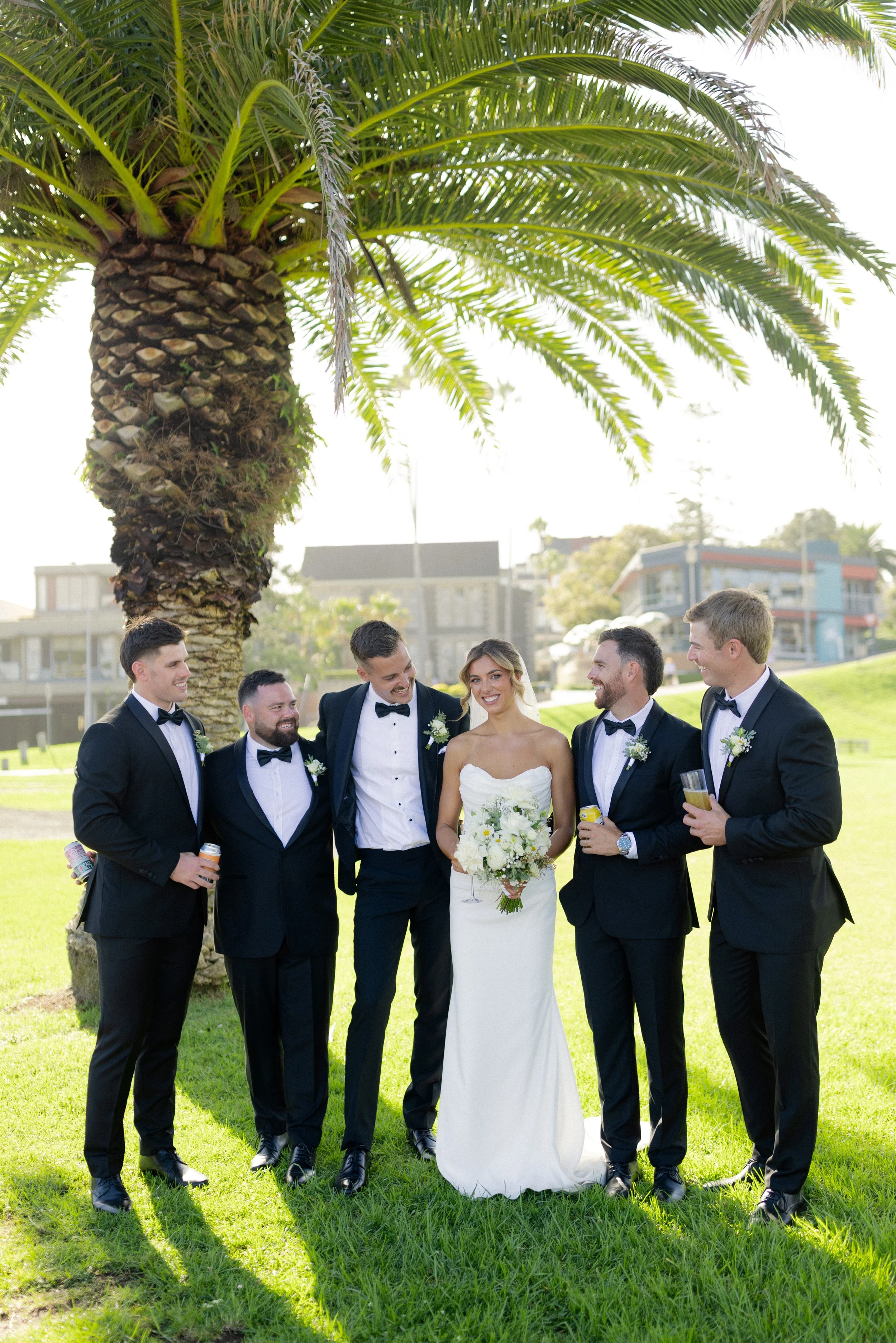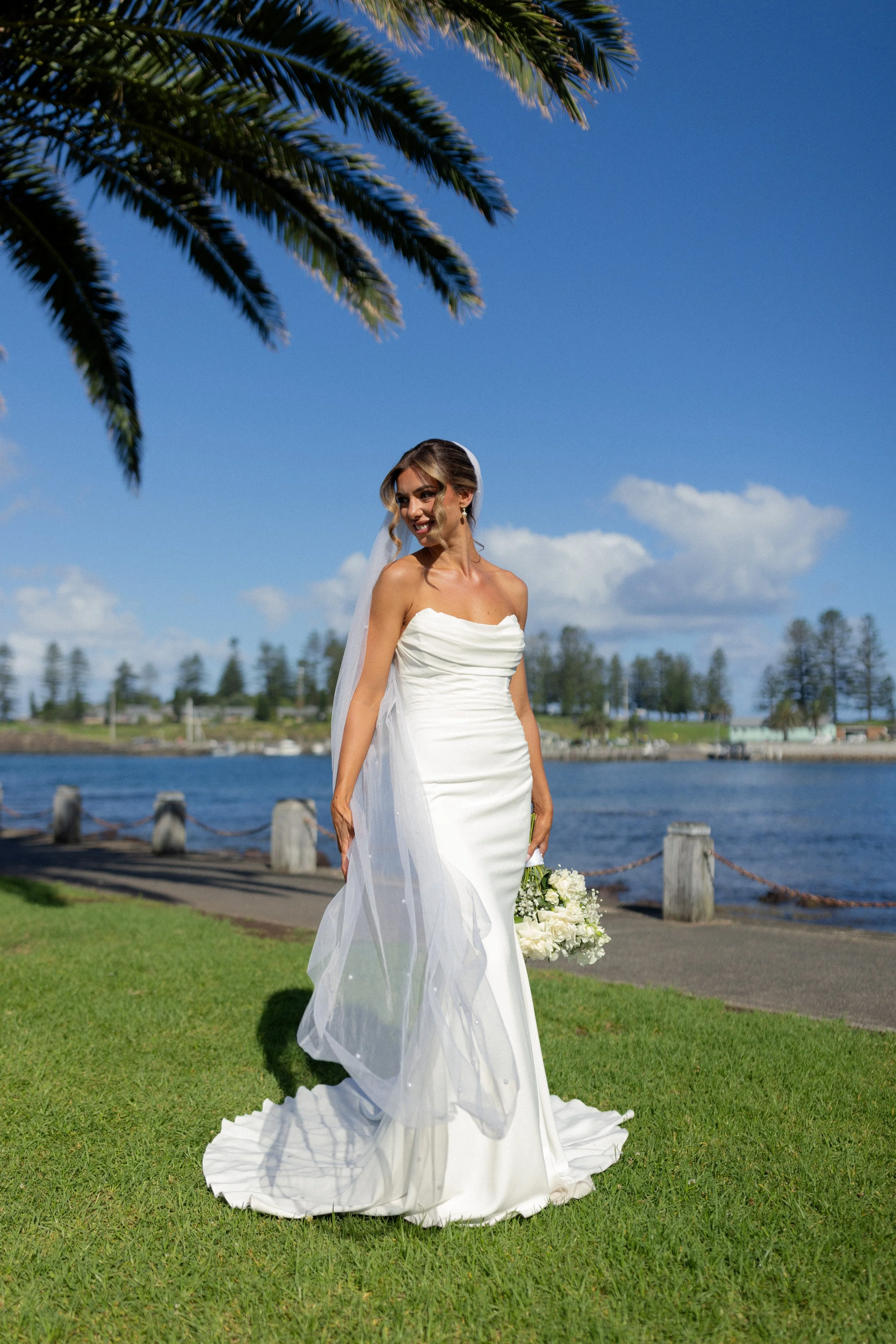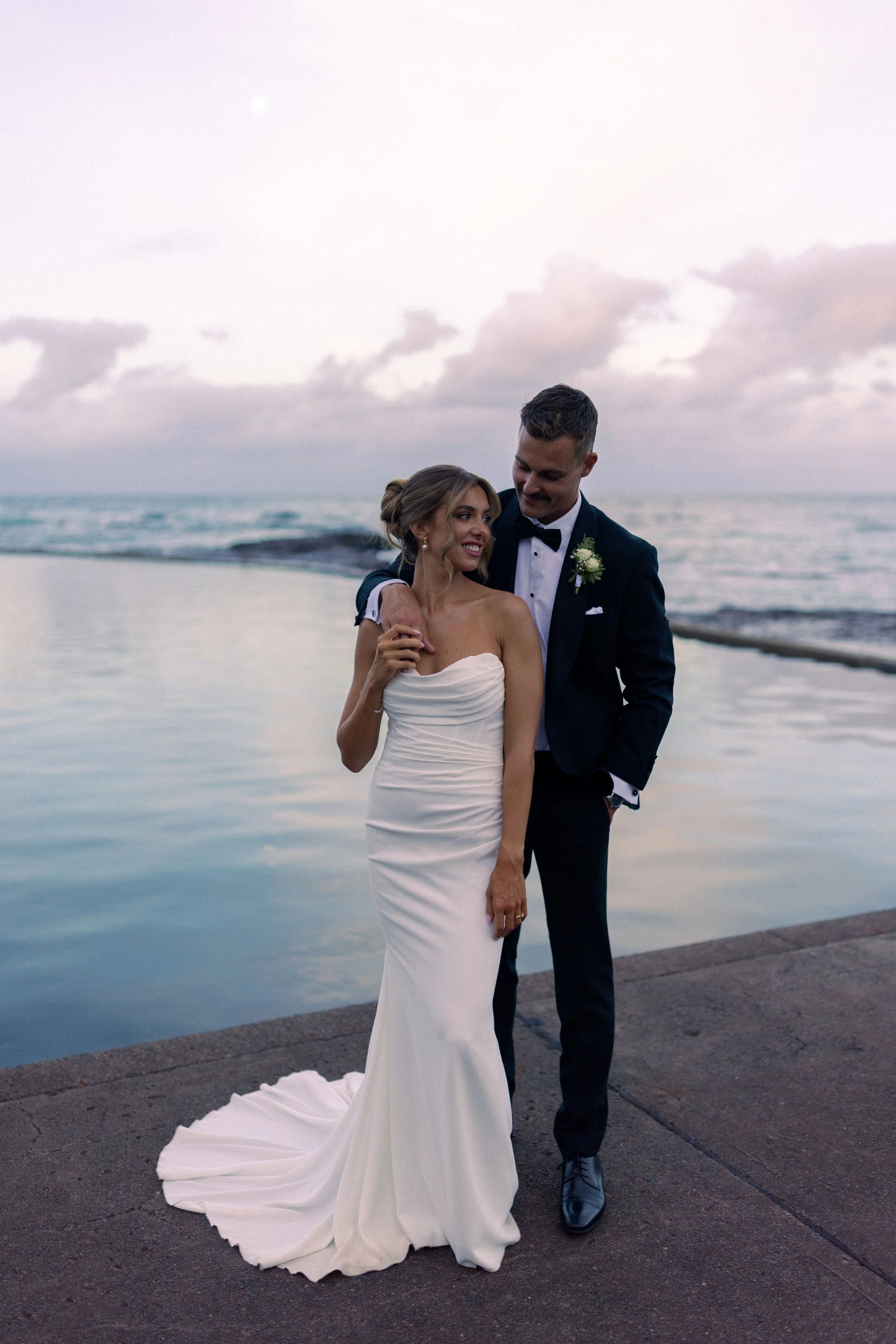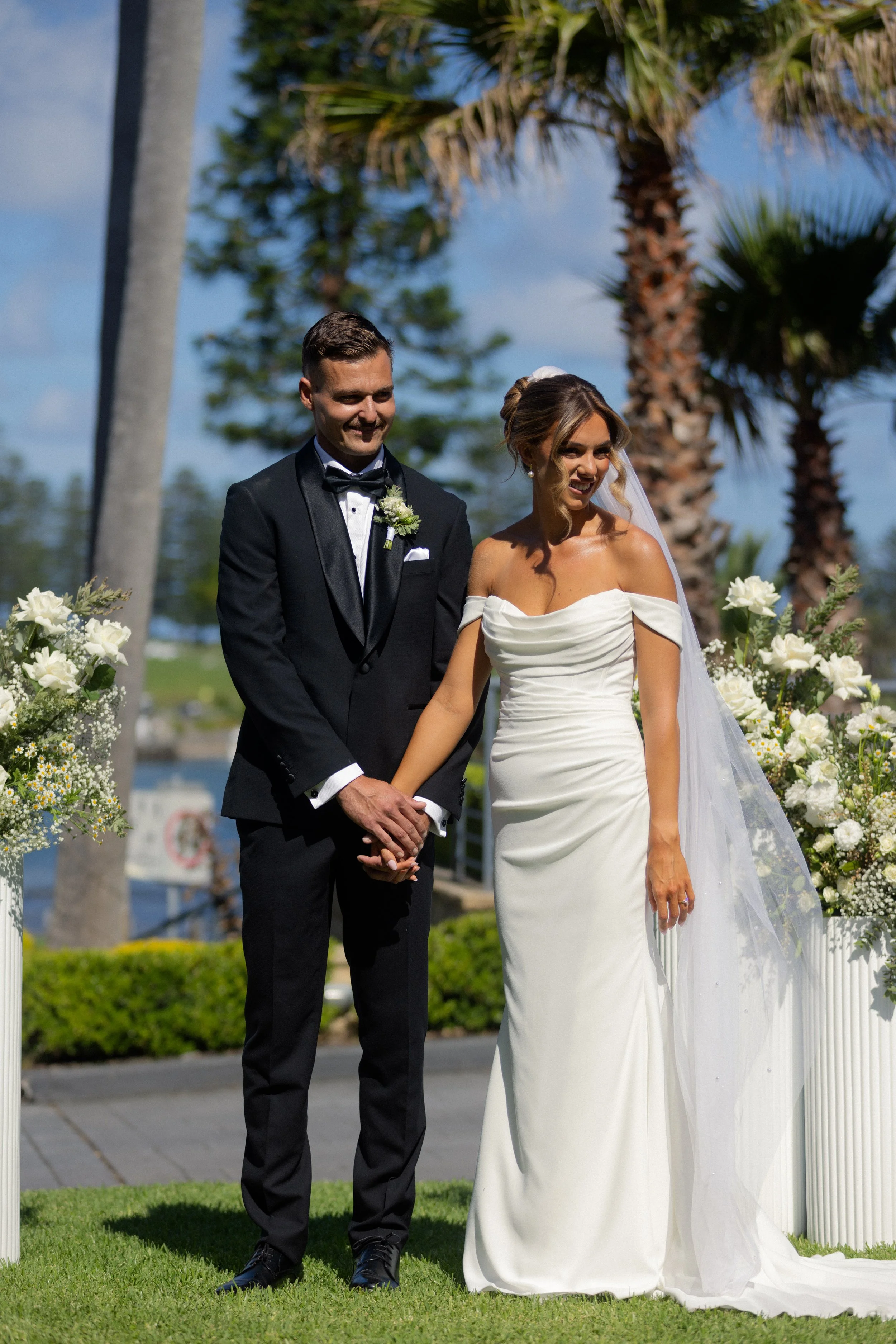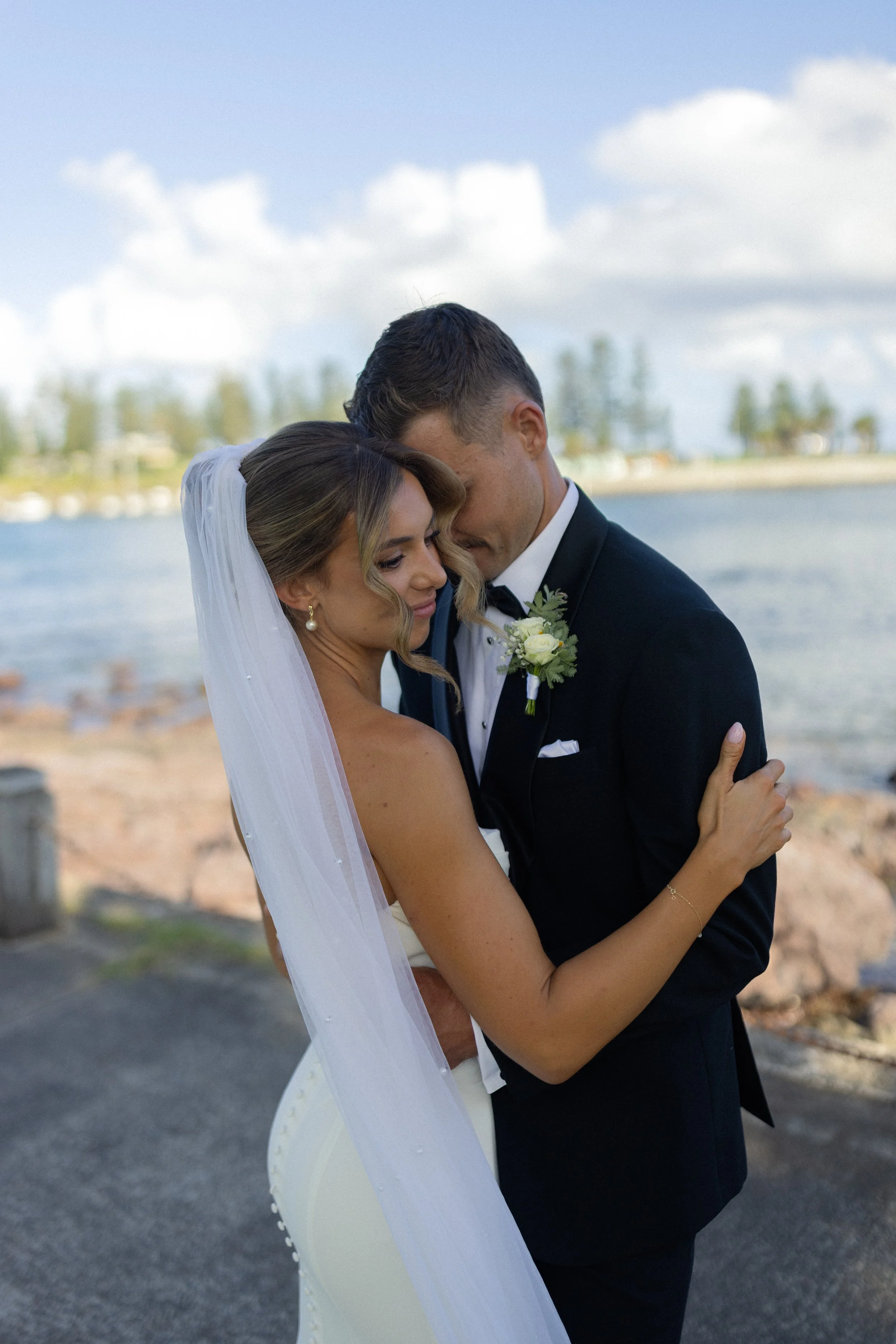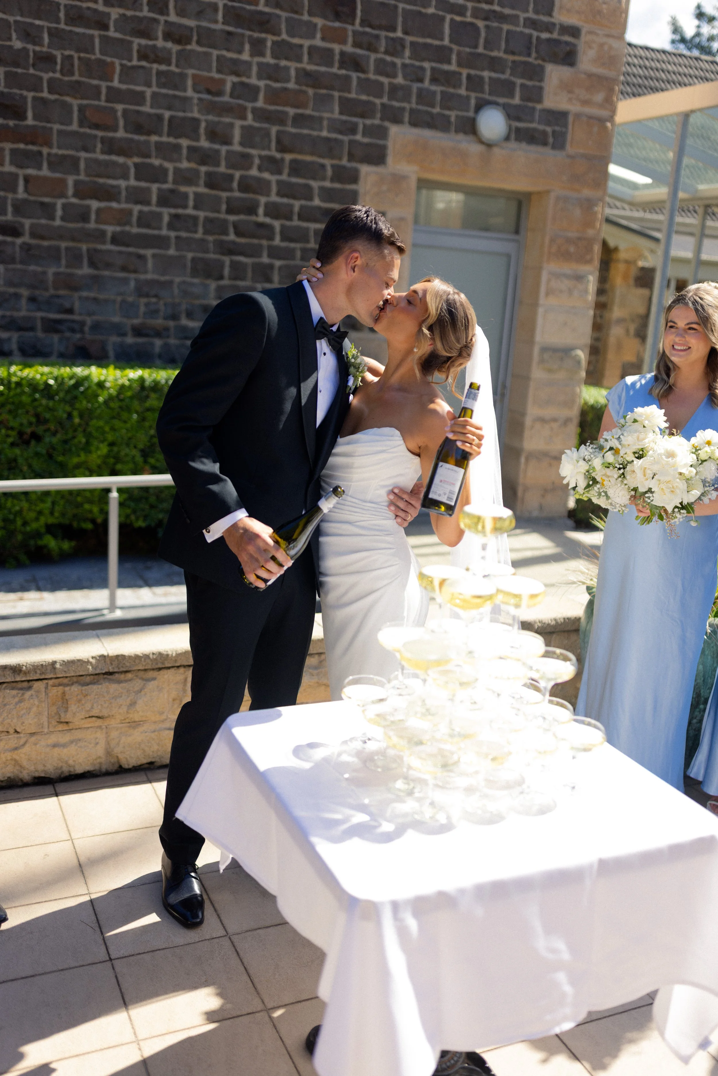 Following their heartfelt “I do’s,” guests gathered to celebrate with a beautiful champagne tower, marking the beginning of the festivities. The newlyweds then took advantage of Kiama’s scenic harbour, capturing timeless portraits among the coastal views and golden afternoon light.