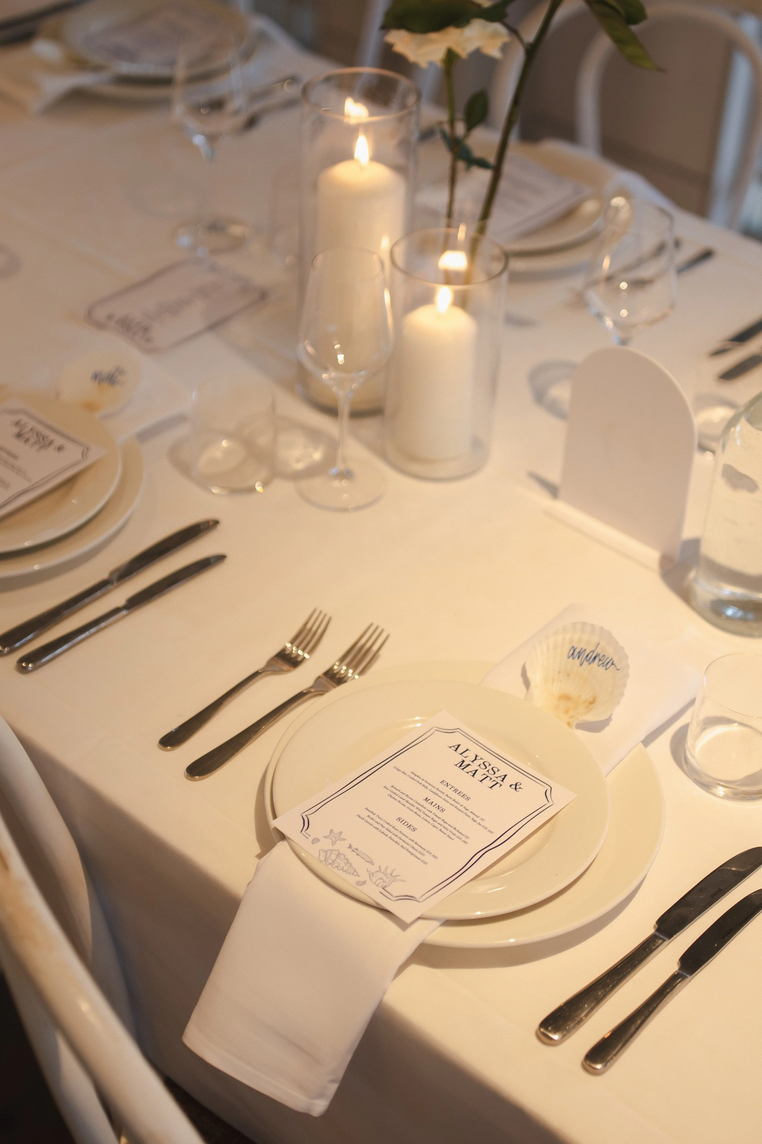 After the formalities, guests made their way to the courtyard where cocktail hour began. Drinks flowed, canapés were enjoyed, and the newlyweds soaked in those first moments of celebration with family and friends. Soon after, Matt and Alyssa slipped away for portraits on the beach, capturing beautiful memories along the shoreline as the light softened toward evening.