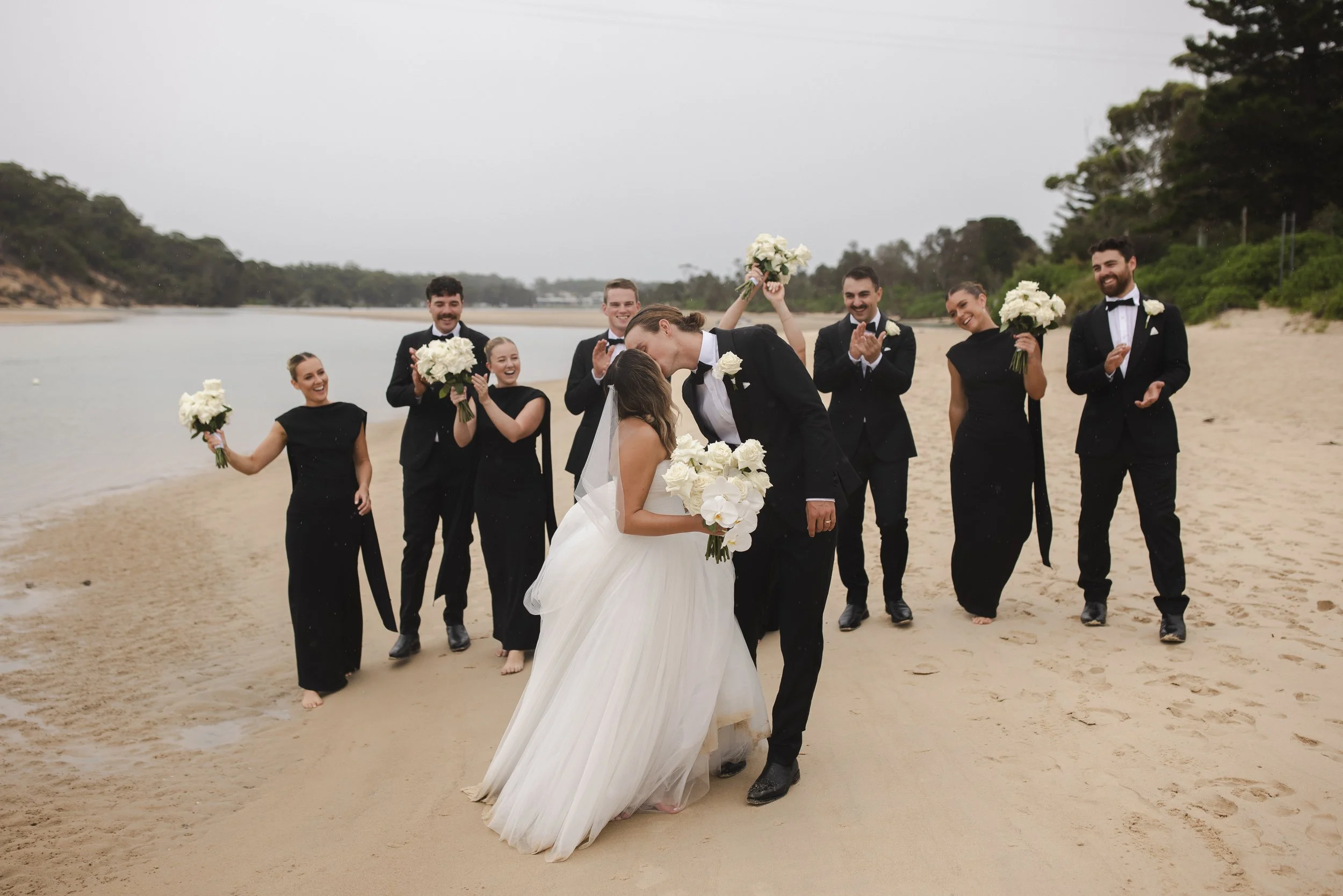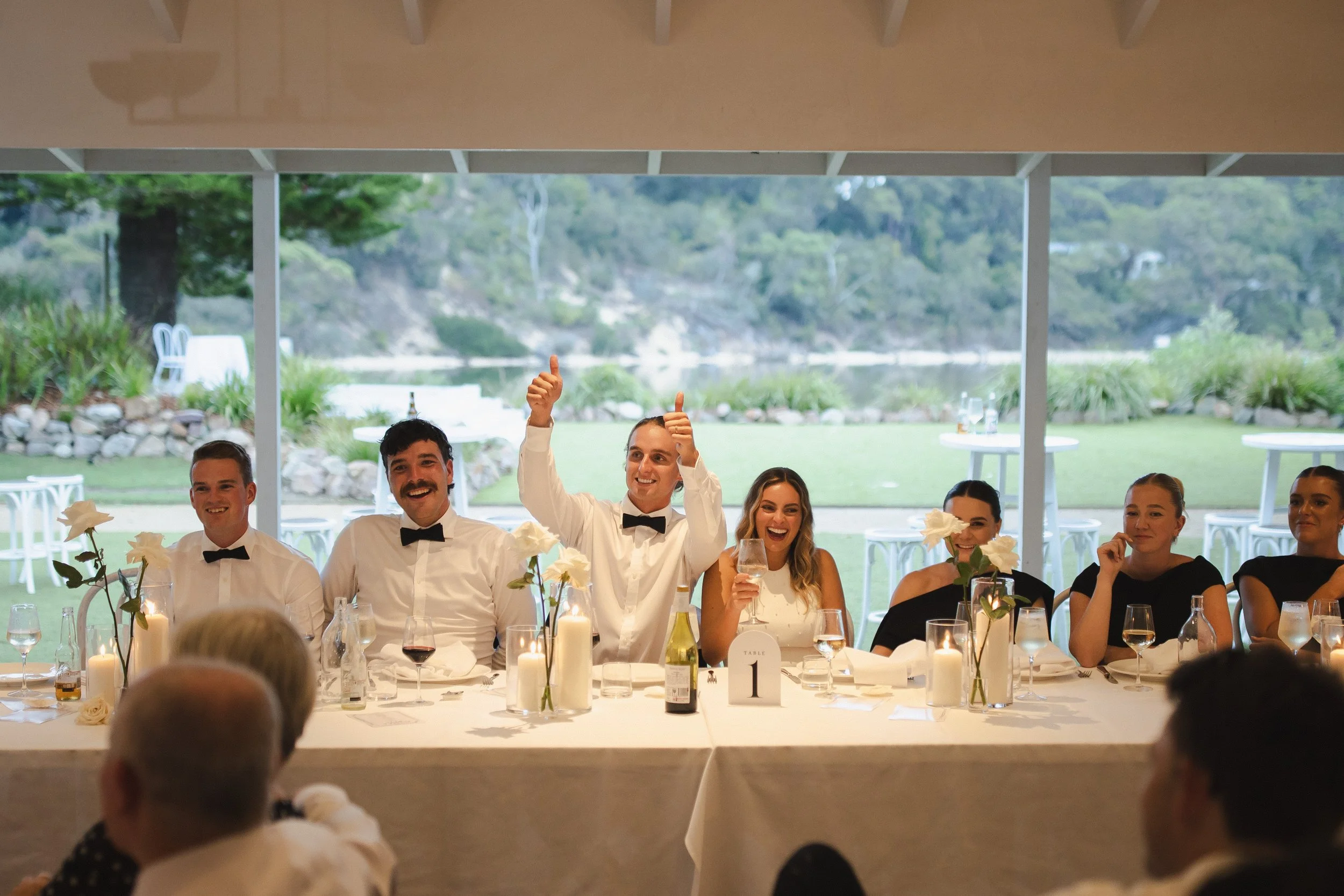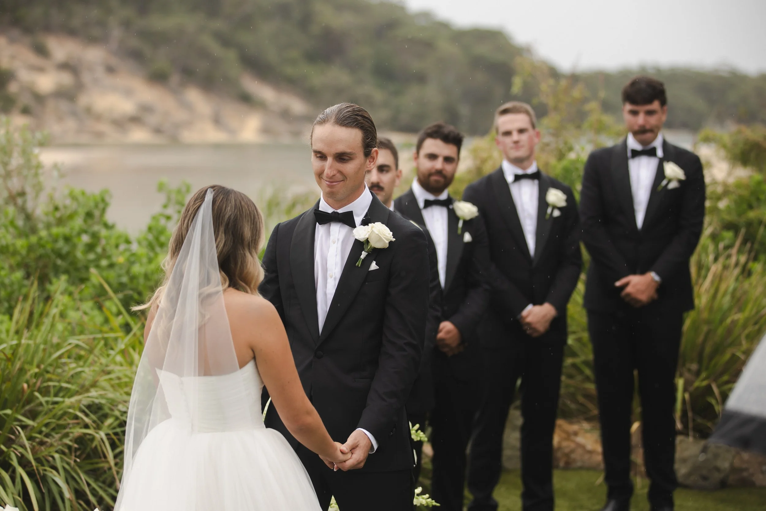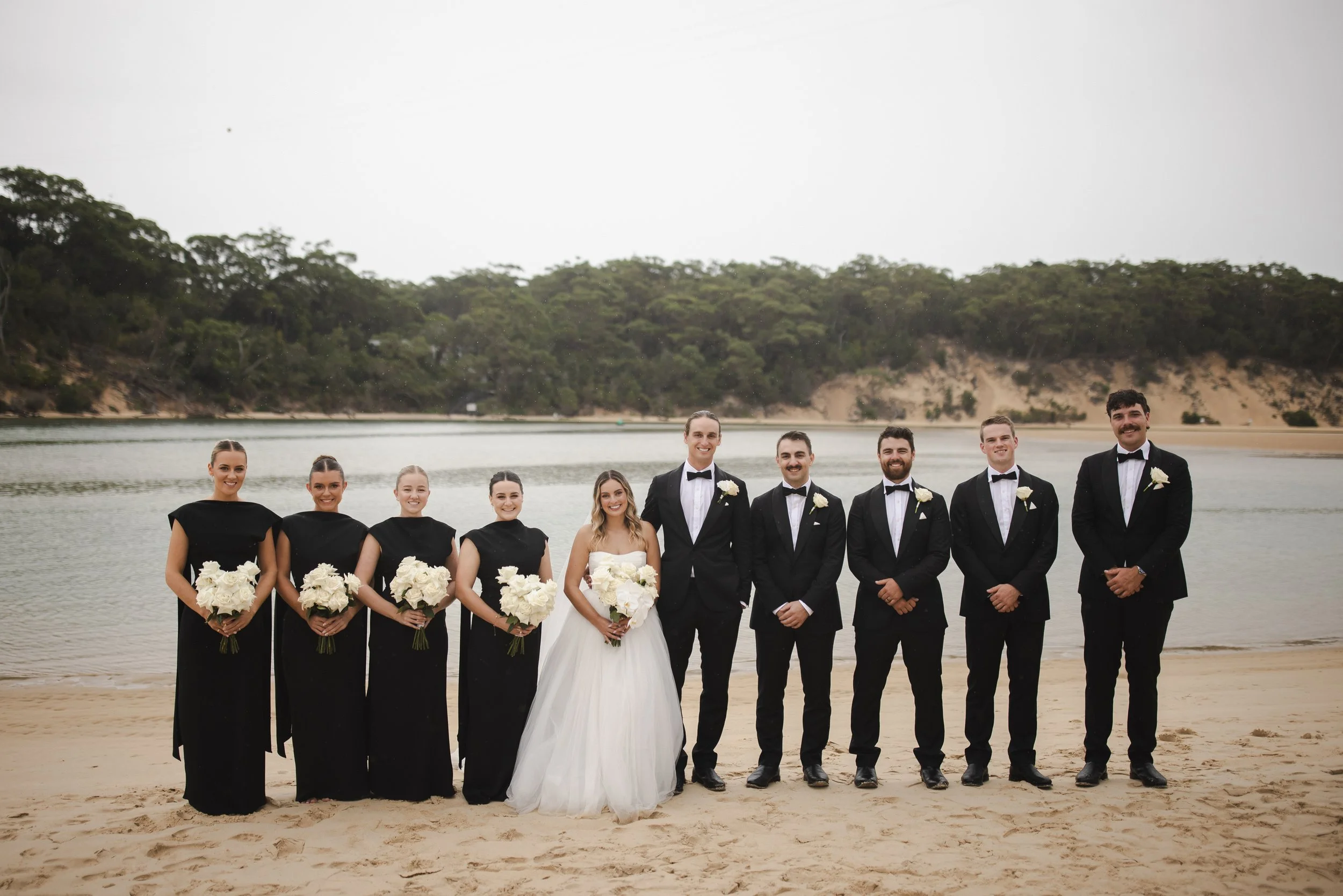 Matt and Alyssa’s wedding on the 2nd of March was nothing short of magical, set against the stunning coastal backdrop of The Cove in Jervis Bay. The day began with a sense of excitement as both the bride and groom prepared in separate cabins, each surrounded by their large and lively bridal party. Laughter, music, and a few happy tears filled the air as everyone got ready for the big moment.